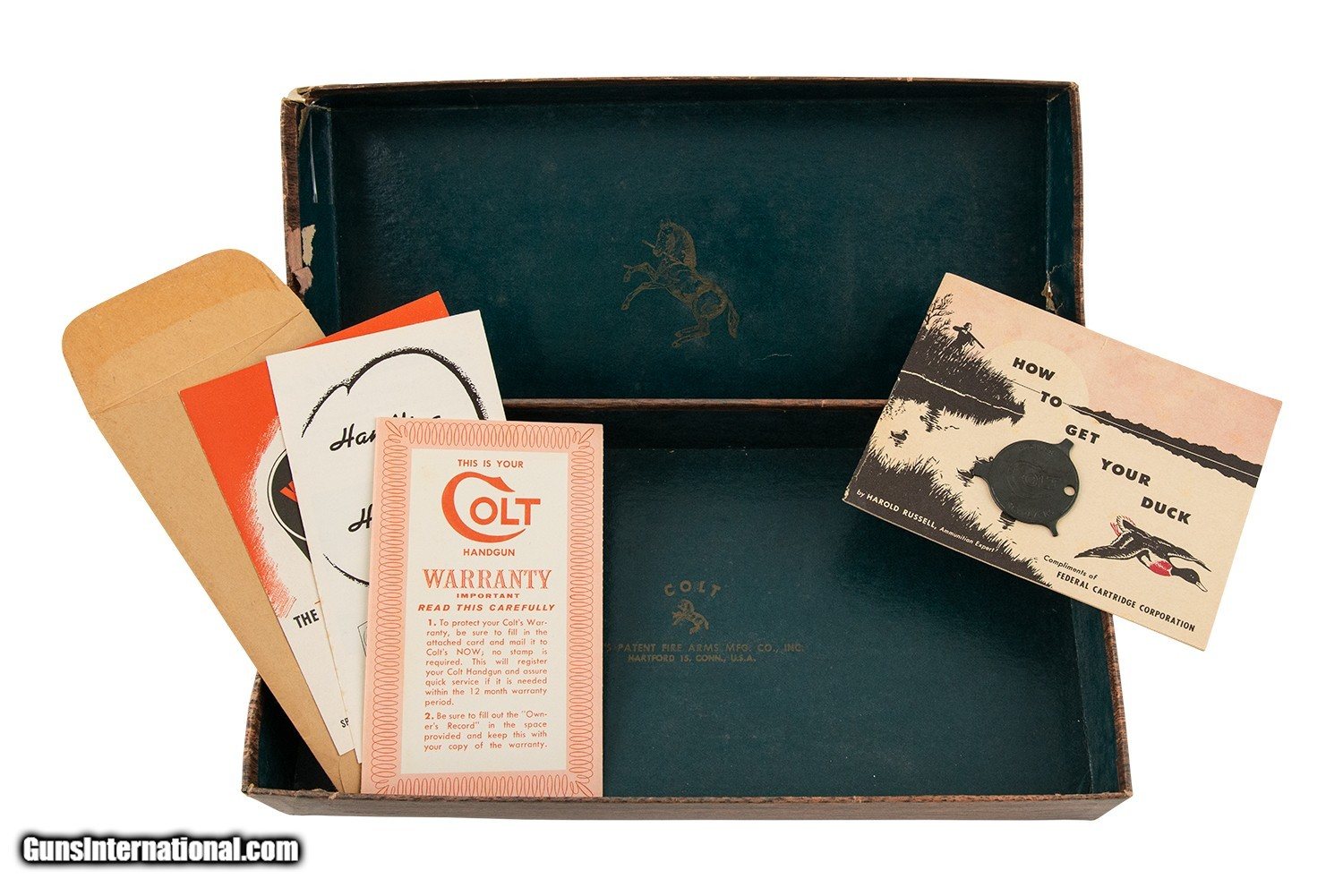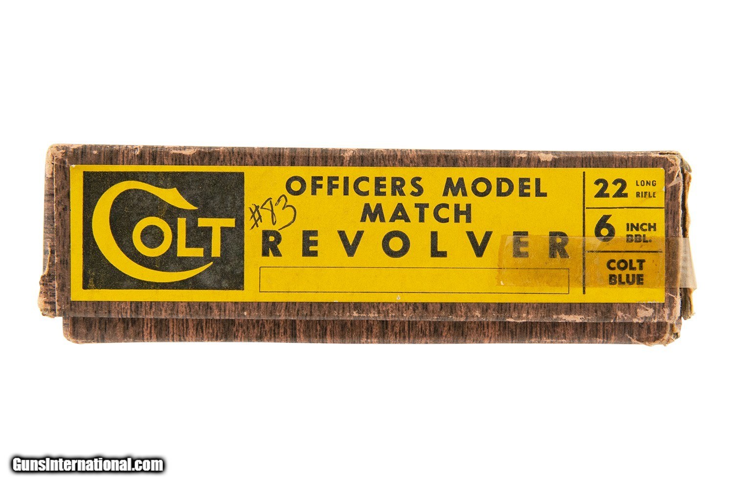 Description: Colt Officers Model Match 22 LR Factory Box The lid is slightly tattered. Warranty Card Owners Manual Wax Paper 10 Commandments of Saftey For 6" BBL PAYMENT BY CHECK ONLY FREE SHIPPING! SOLD |