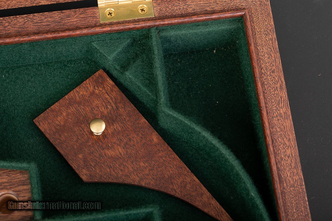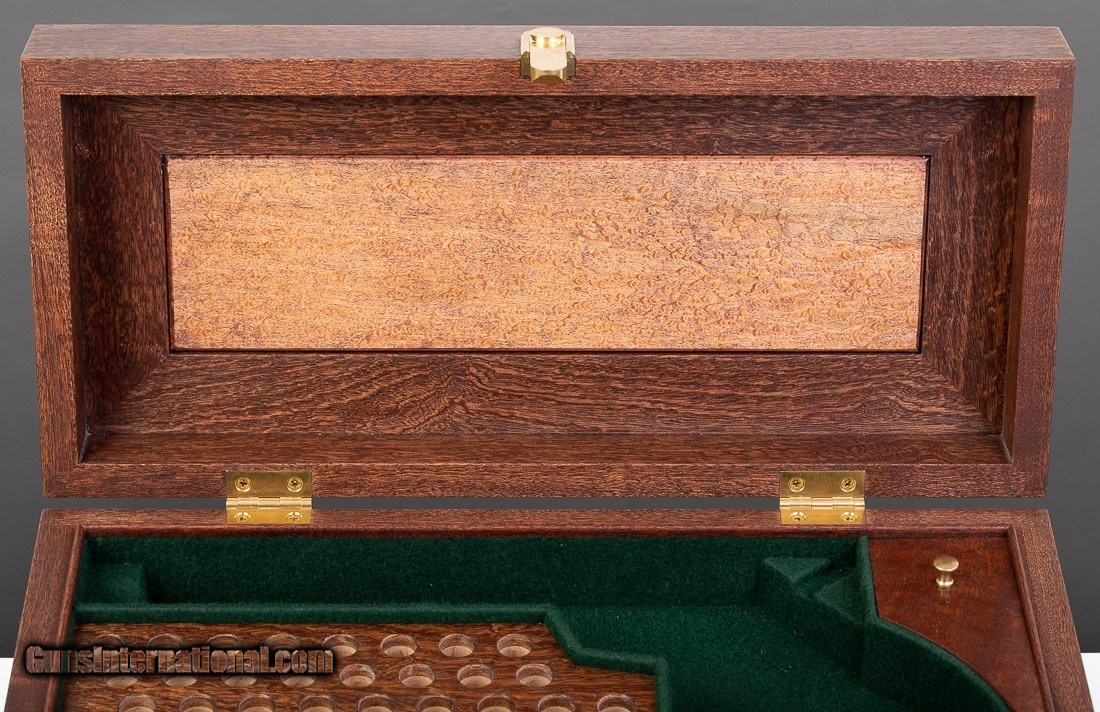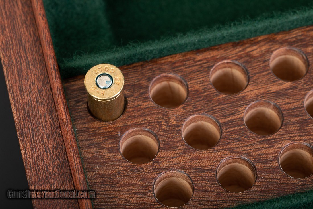 Description: Custom Solid Mahogany and Birdseye Maple Colt Single Action Army Display Box Fits 7 ½” Barrel , 45 Colt Condition is excellent no marks from use or storage. Featuring Solid Mahogany Construction - Case top with framed Figured Mahogany exterior and Birdseye Maple interior panels, Case bottom is felt covered Beech hardwood panel Hand-rubbed Oil Finish. Solid brass Brusso case latch and stop hinges. Green Wool Blend Felt Lined Interior with Storage Compartments & Shell Holder for 25 .45 Colt rounds. Outside Case Dimensions - 14 ¾” x 6 ¾” x 3 ½”. Please refer to photos for condition details. Please contact us with any questions. Free Shipping within the United States California residents pay 7.75% sales tax. SOLD Handgun Caliber: .45 Colt |