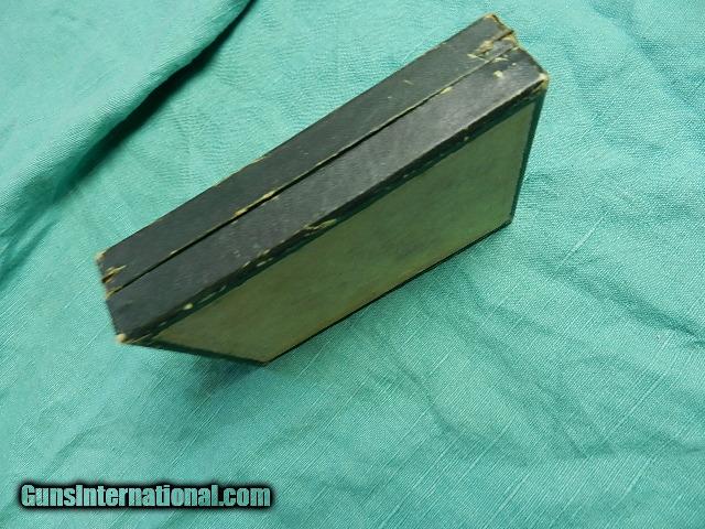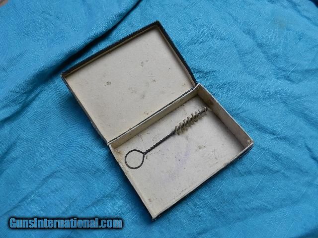 Description: A very rare early European gun box in good condition with an original cleaning brush. The box measures 5 1/8" long x 3 9/16" wide. The advertising on the front is very clear. A box like this comes around about every 100 years! Check my inventory for more rare and interesting gun boxes and presentation cases! We don’t have asite .I prefer money orders or a check. Item ships when funds come in. If you can only pay with a card let me know. I’m sorry I don’t list my phone number, did that for 30 days, never again.. I can’t talk on the phone all day…who will ship the guns? I’m just one person, and it’s very busy here! I do a brisk volume! I hope you like my wide selection of unusual guns, knives and gun parts. Shipping price determined by zip code. I try to keep the prices affordable, which means I make less money than most dealers. You won’t get altitude sickness with my prices! I consistently have the best selection of older guns If you BUY IT NOW you must still contact us for details buy it now doesn't end the sale, it just sends an email telling us you want to buy this gun. A phone call won’t secure a sale! Not home many times, the first buyer by email buys the gun !Thissite does not close down a sale when you do a BUY IT NOW like Ebay! I can get six buy it nows in an hour, first buyer to email gets the guns, others are in second place! Best to send another email . Sometimes not home to get calls. Some guns are required shipment to a gun dealer near you for a transfer to you when it arrives. With the widest selection of older guns at great prices, We don’t have a store, and sell on the internet only. SOLD |