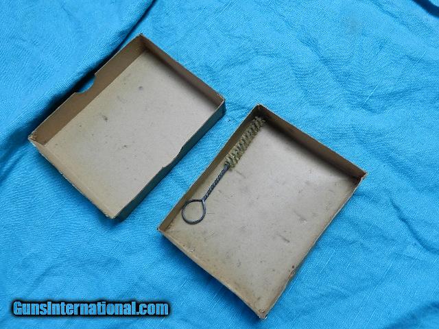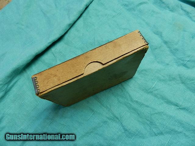 Description: Another very rare European original box for CLEMENT'S PATENT AUTOMATIC PISTOL. Box measures 5 13/32" long x 4 1/16" wide. The advertising is very clear, and comes with an original cleaning brush. A rare gun box like this comes along every 100 years! Check my inventory for more very rare boxes and presentation cases! We don’t have asite .I prefer money orders or a check. Item ships when funds come in. If you can only pay with a card let me know. I’m sorry I don’t list my phone number, did that for 30 days, never again.. I can’t talk on the phone all day…who will ship the guns? I’m just one person, and it’s very busy here! I do a brisk volume! I hope you like my wide selection of unusual guns, knives and gun parts. Shipping price determined by zip code. I try to keep the prices affordable, which means I make less money than most dealers. You won’t get altitude sickness with my prices! I consistently have the best selection of older guns If you BUY IT NOW you must still contact us for details buy it now doesn't end the sale, it just sends an email telling us you want to buy this gun. A phone call won’t secure a sale! Not home many times, the first buyer by email buys the gun !Thissite does not close down a sale when you do a BUY IT NOW like Ebay! I can get six buy it nows in an hour, first buyer to email gets the guns, others are in second place! Best to send another email . Sometimes not home to get calls. Some guns are required shipment to a gun dealer near you for a transfer to you when it arrives. With the widest selection of older guns at great prices, We don’t have a store, and sell on the internet only. SOLD |