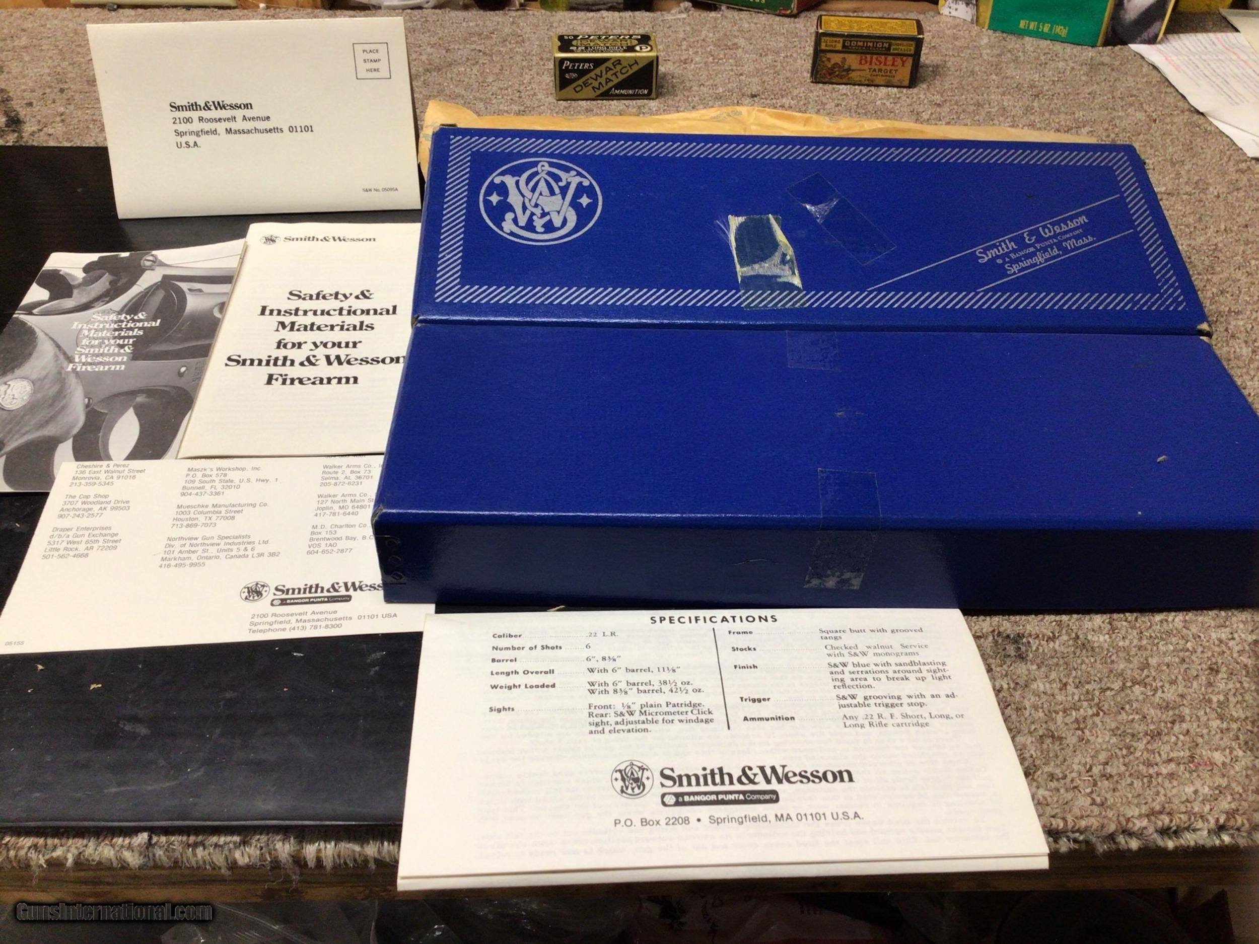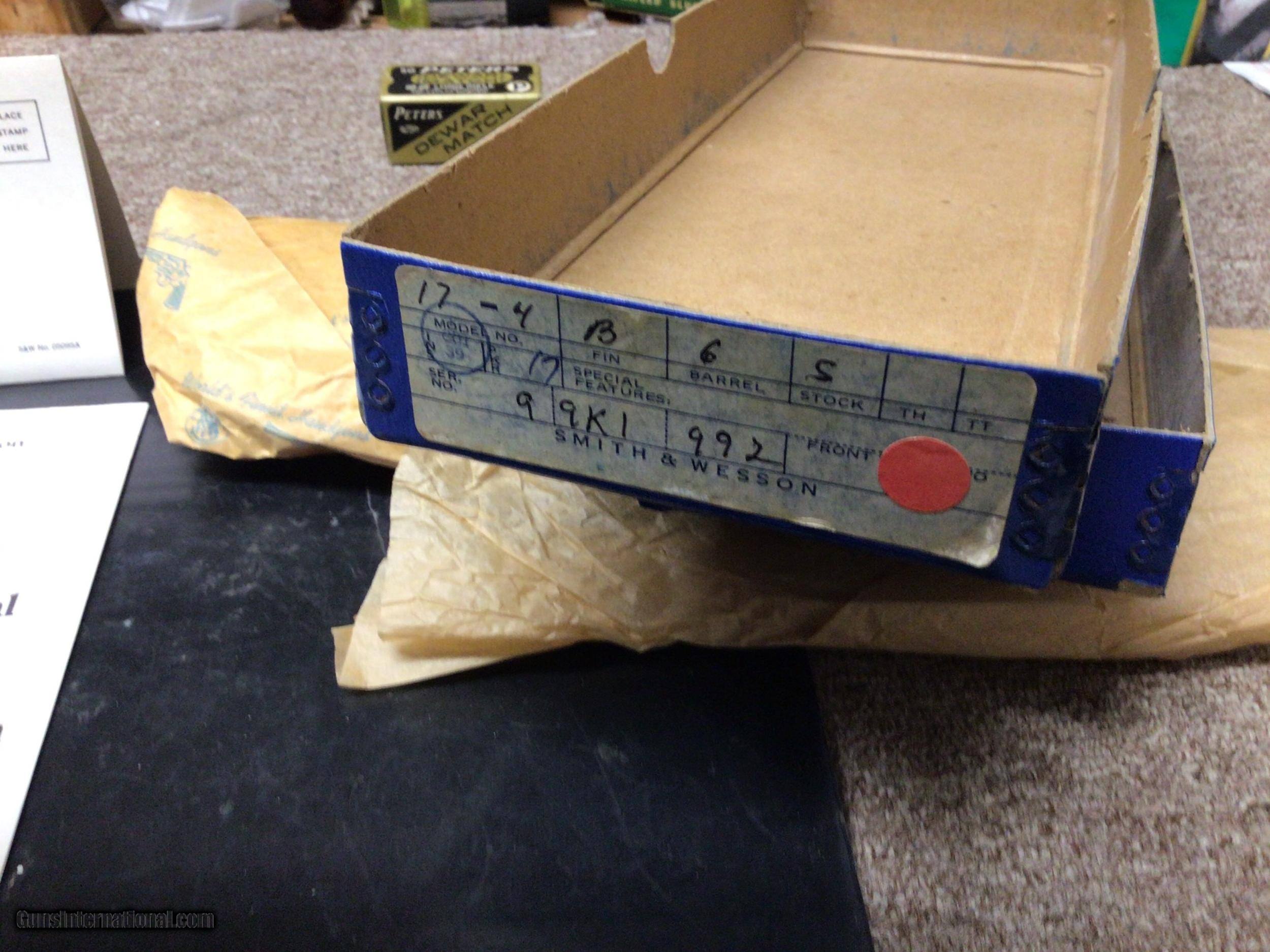 Description: smith and wesson box model 17-4 includes all the paper work that came with the gun when it left the factory good strong box in excellent condition to bad for the tape SOLD |