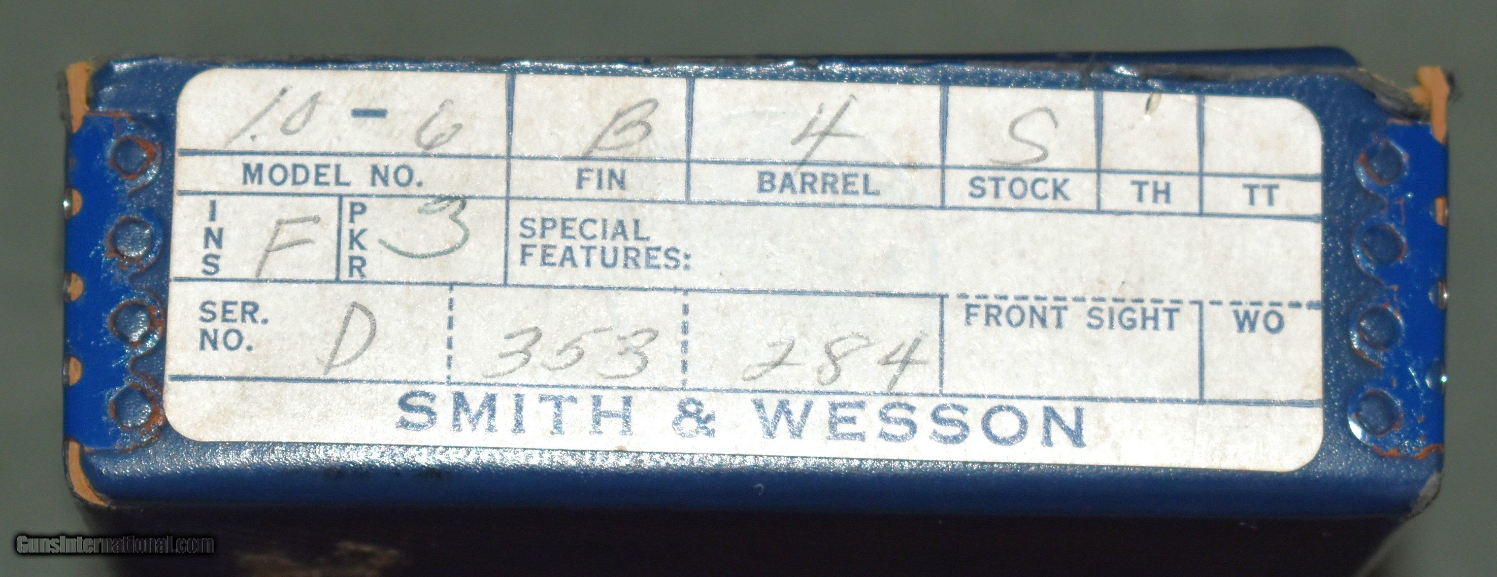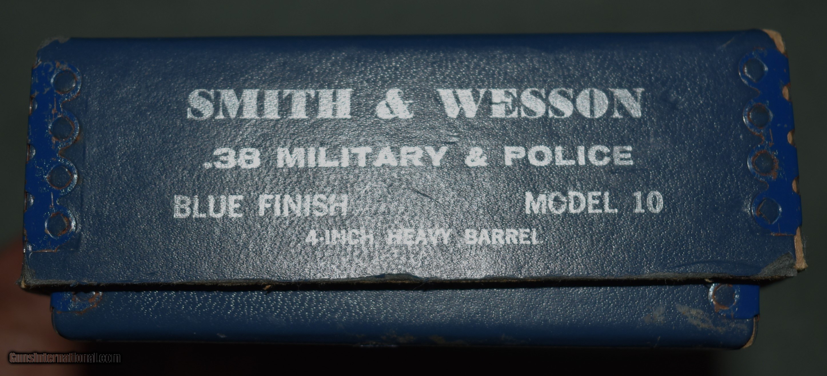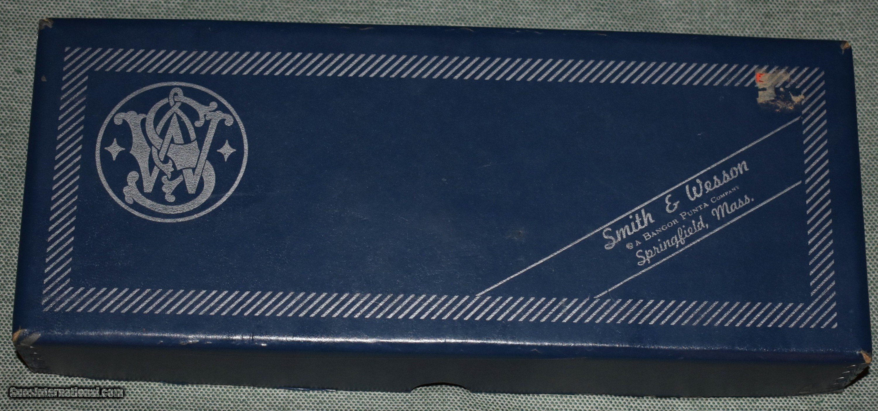 Description: Smith and Wesson model 10 blue box for 4" gun. The box is in excellent condition with good corners and no discoluration. It comes with the manual,warranty card,and a Smith and Wesson ammunition flyer. Hard to find in this condtion with paperwork.Price inckudes shipping. SOLD |