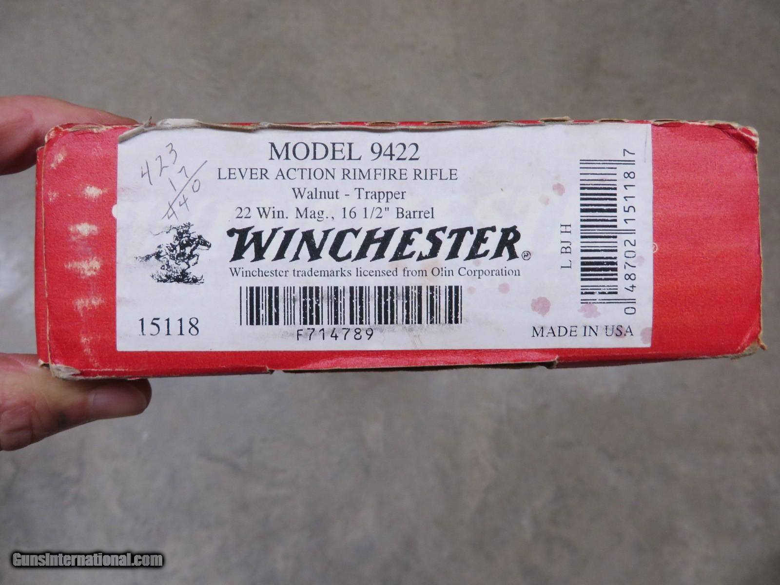 Description: Original box for Trapper .22 Magnum with 16 1/4 inch barrel. Measures 35 inches inside so will not fit the full size 9422. SOLD |