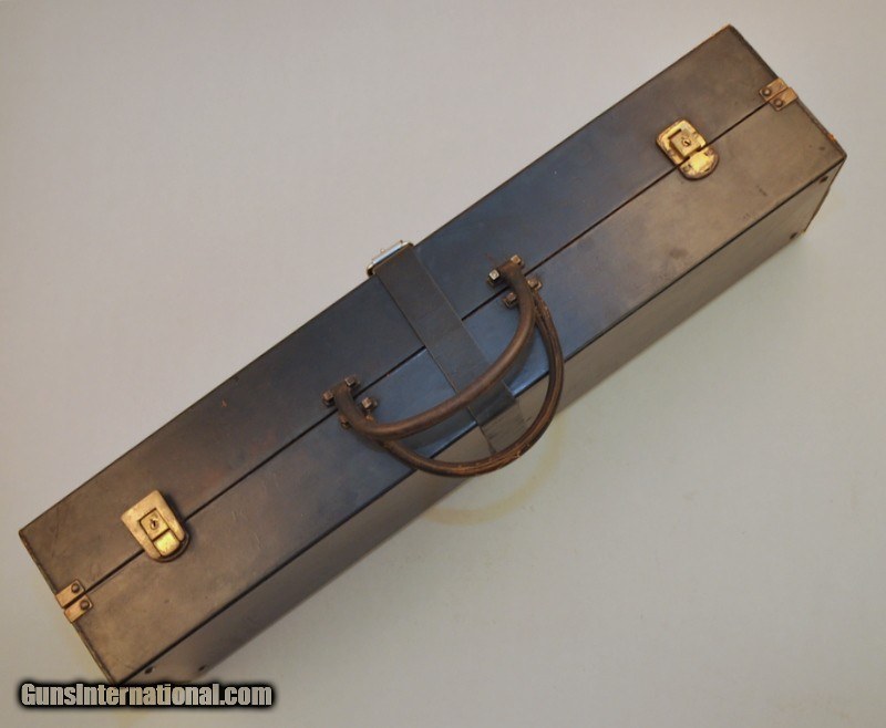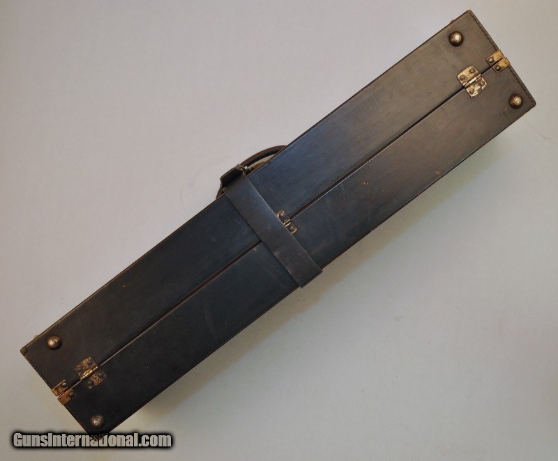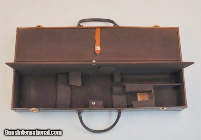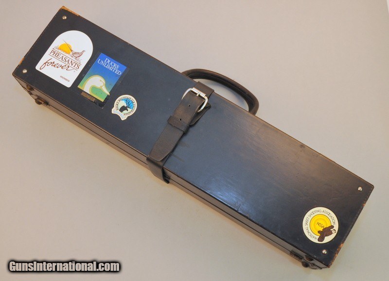 Description: Unmarked case with black leather interior. Originally housed a Krieghoff model 32. Brown cloth covered interior has leather trim. Lower compartment is fitted for an O/U shotgun action & forend with a small acc. compartment. Lid compartment is blocked to hold 410, 28, 20 & 12 gauge barrels of 26" or 28" length. Exterior dimensions; length 29", width 7-3/8", height 7-1/8". Case lid is personalized with Skeet Assoc. and conservation organization stickers. Exterior shows scattered scuffs and handling marks. Right lock hasp is detached. Interior shows light wear with 2 small cloth tears on inside of barrel compartment lid. Includes added black leather security belt and 2 keys. Priority mail $30.00. SOLD |