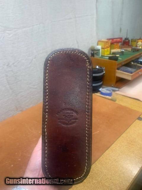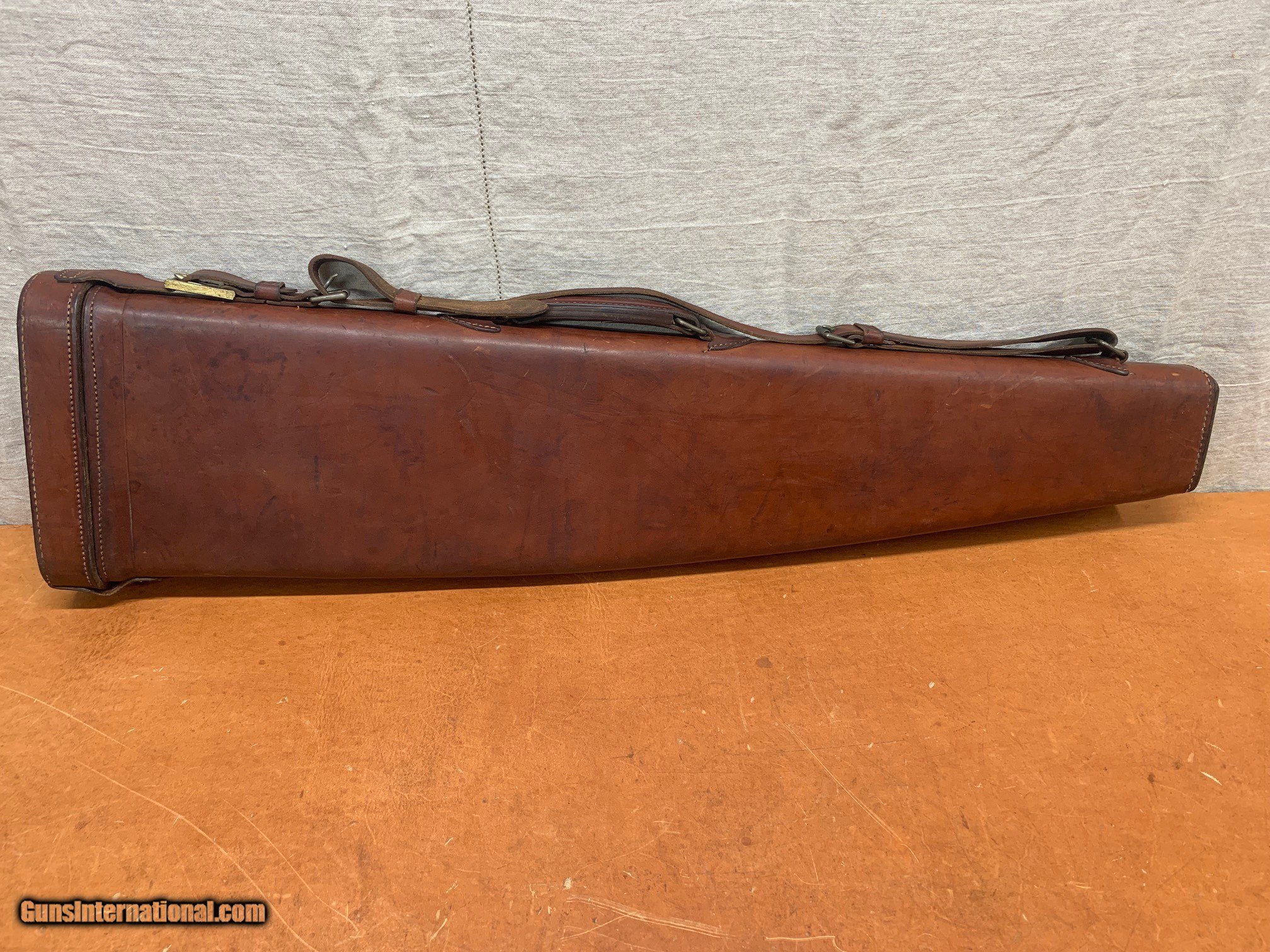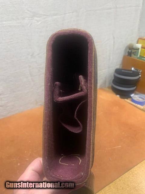 Description: Straps and handle are all attached and in nice shape. This case would fit a 34" barrel with a doll's head. Interior in nice shape as well. Divider is present. Opening measurement - 2 1/8 x 7 3/4 SOLD |