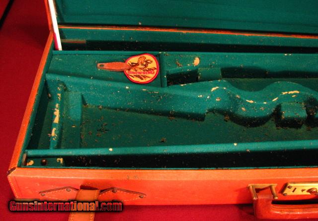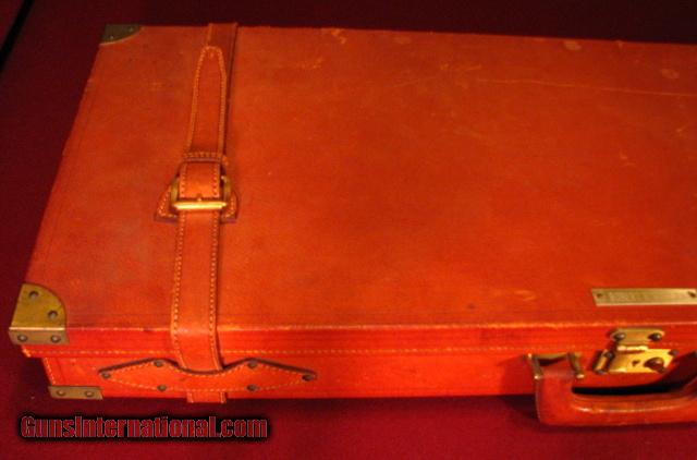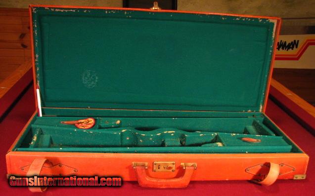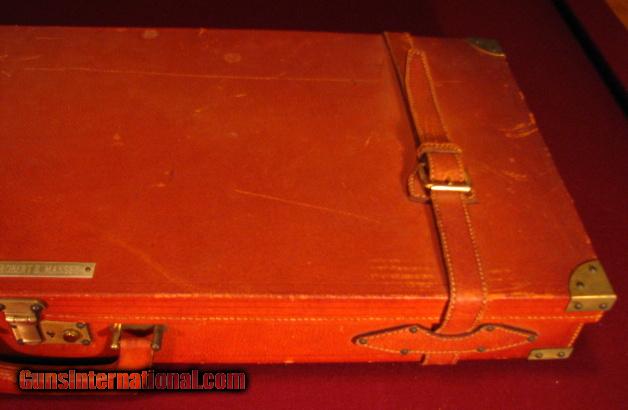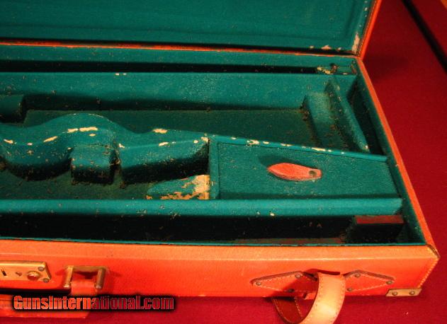 Description: Elegent fitted leather trunk case for Browning Round Knob Superposed pair with barrels up to 30". Heavy duty brass hardware including brass corners. Two interior storage compartments. Missing key. Exterior in very good condition except strap leather is drying and needs oiled. Inner baize lining has deteriorated and needs to be replaced. A bit of a project but will display your Browning pair in style. SOLD |