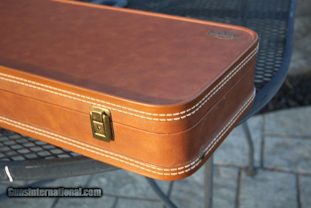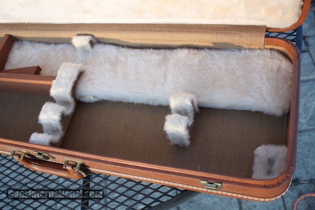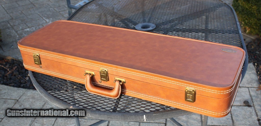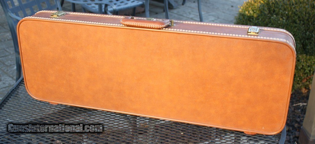 Description: Browning Superposed Airways two barrel shotgun case in just outstanding condition. The outside is near perfect. The end caps and stitching are great. The handle and locks are excellent and one original key is included in the orignal wax envelope. This case will hold two sets of barrels up to 30" and the inside looks like it has never been used. Please see detailed pictures for accurate description and condition. SOLD |