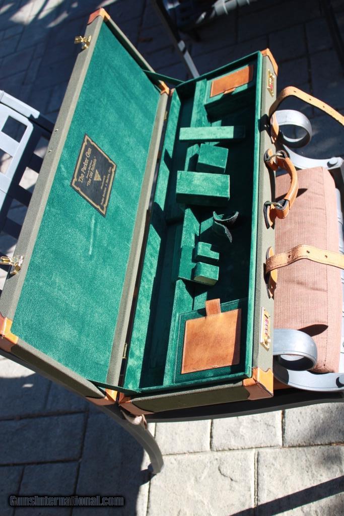 Description: SOLD - Very nice heavy duty canvas and leather shotgun case. This case was made by Brooks and Thomas in Colorado Springs CO. The case appears AS NEW inside and out. There is a Parker trade label from CSMC in the lid. Double combination locks are unset. The max barrel length is 31.5”. There are numerous blocks to use to configure the case to your gun. The sample gun is a 30” 12ga and is to show fit only. THE GUN IS NOT INCLUDED. Please see pictures for accurate description and condition. See my other listings for more vintage cases. SOLD |
