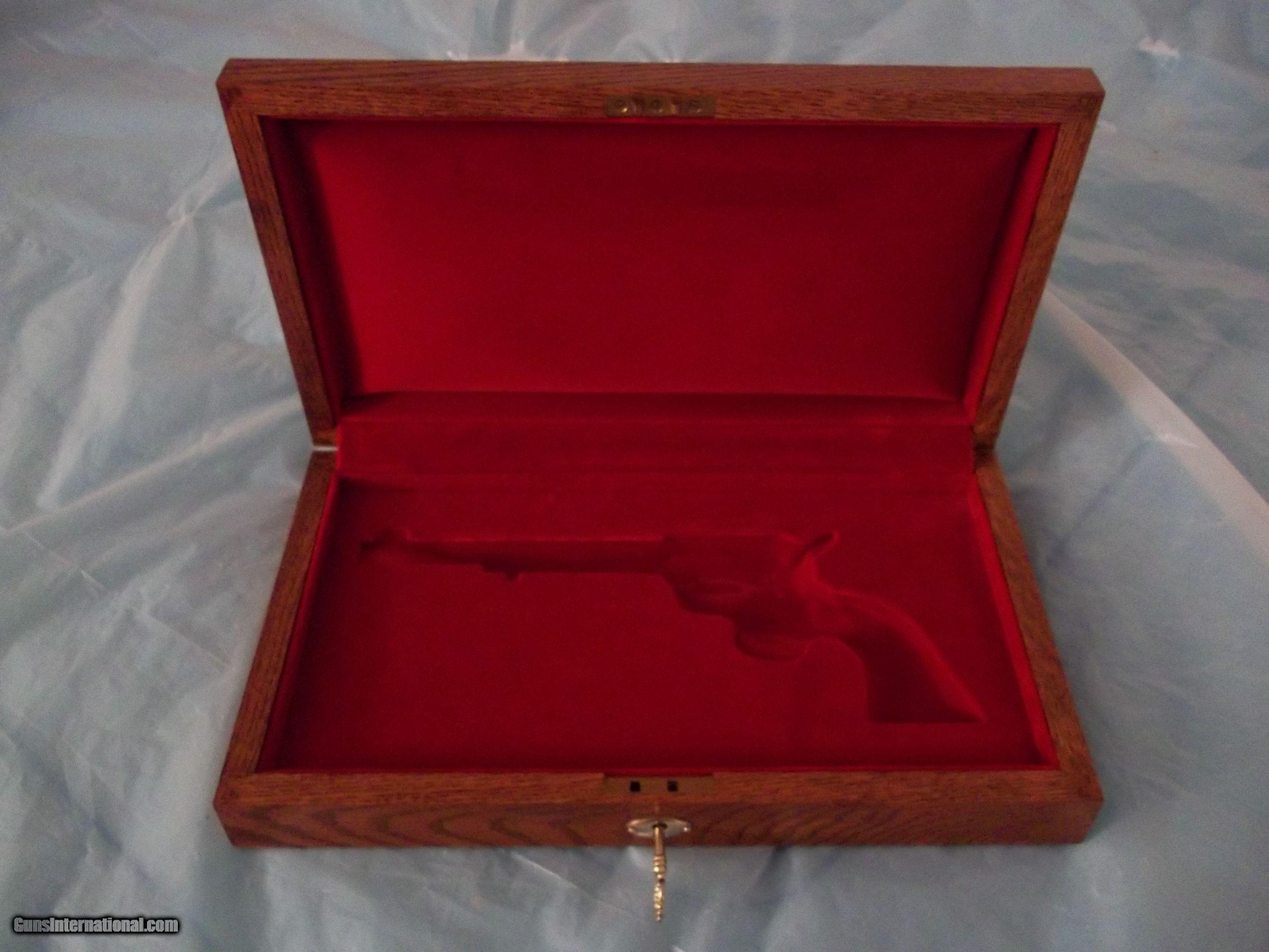 Description: Custom-made solid oak presentation case for a Colt SAA revolver with 7 1/2 inch barrel ordered directly from The Colt Gun Shop, Hartford, CT. in 1978. This particular case is in an immaculate, pristine, brand new condition and comes with the original brass decorated key. Its construction is flawless, while the original vivid red lining depicting an actual imprint of a SAA revolver has retained its original look and coloring. The shown photographs does not do justice to the extreme beauty of this wooden case, but I will hope its appearance gives you an idea how stunning this case is. There are absolutely no scuff marks, scratches, or the slighest dust particles inside or outside it, or at the bottom of the case (see picture # 9 and # 10). The box is exactly today as it was received back in 1978. This is a very pretty and very beautiful presentation case from another era-a time capsule! For the discrimination Colt collector and aficionados; it will make for a fantastic acquisition for your revered Colt Single Action Army revolver handgun (from any generation) and will certainly enhanced its value. Size is : 16-1/4" X 9-3/8" X 3". Price includes shipping USPS with tracking number anywhere within the Continental United States. Best offer accepted if within a fair price for both seller and buyer. Thank you for looking. SOLD |