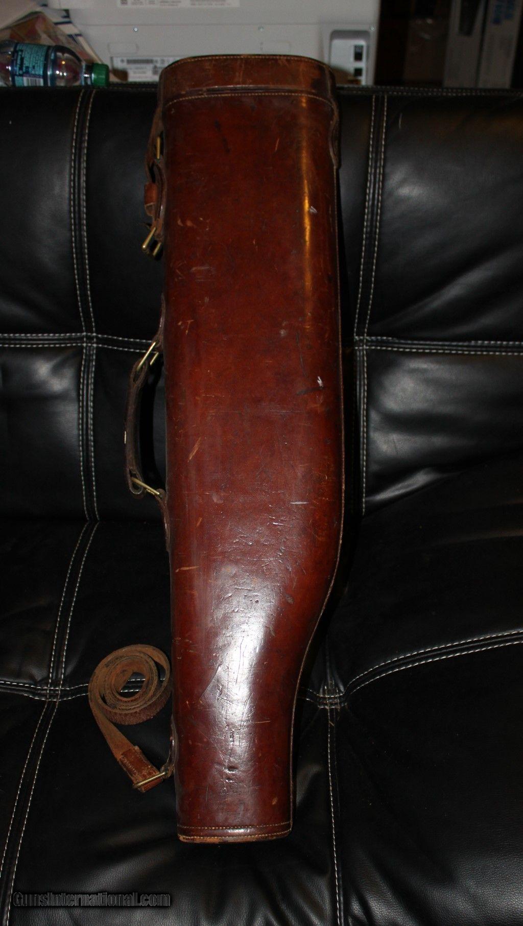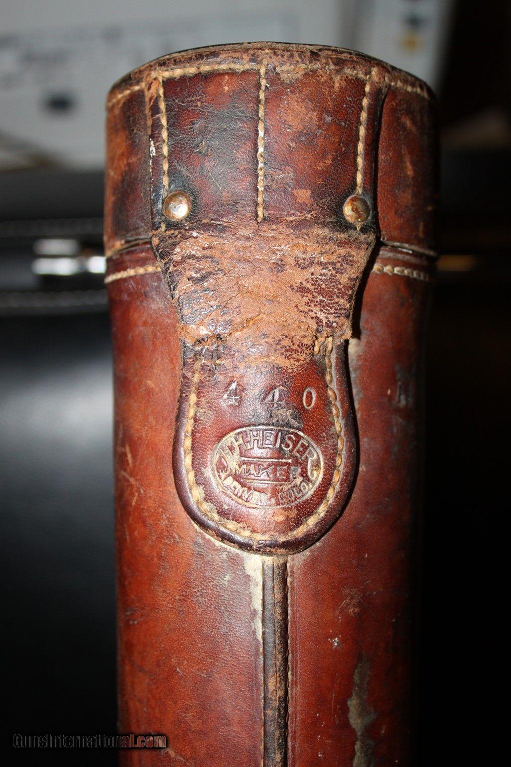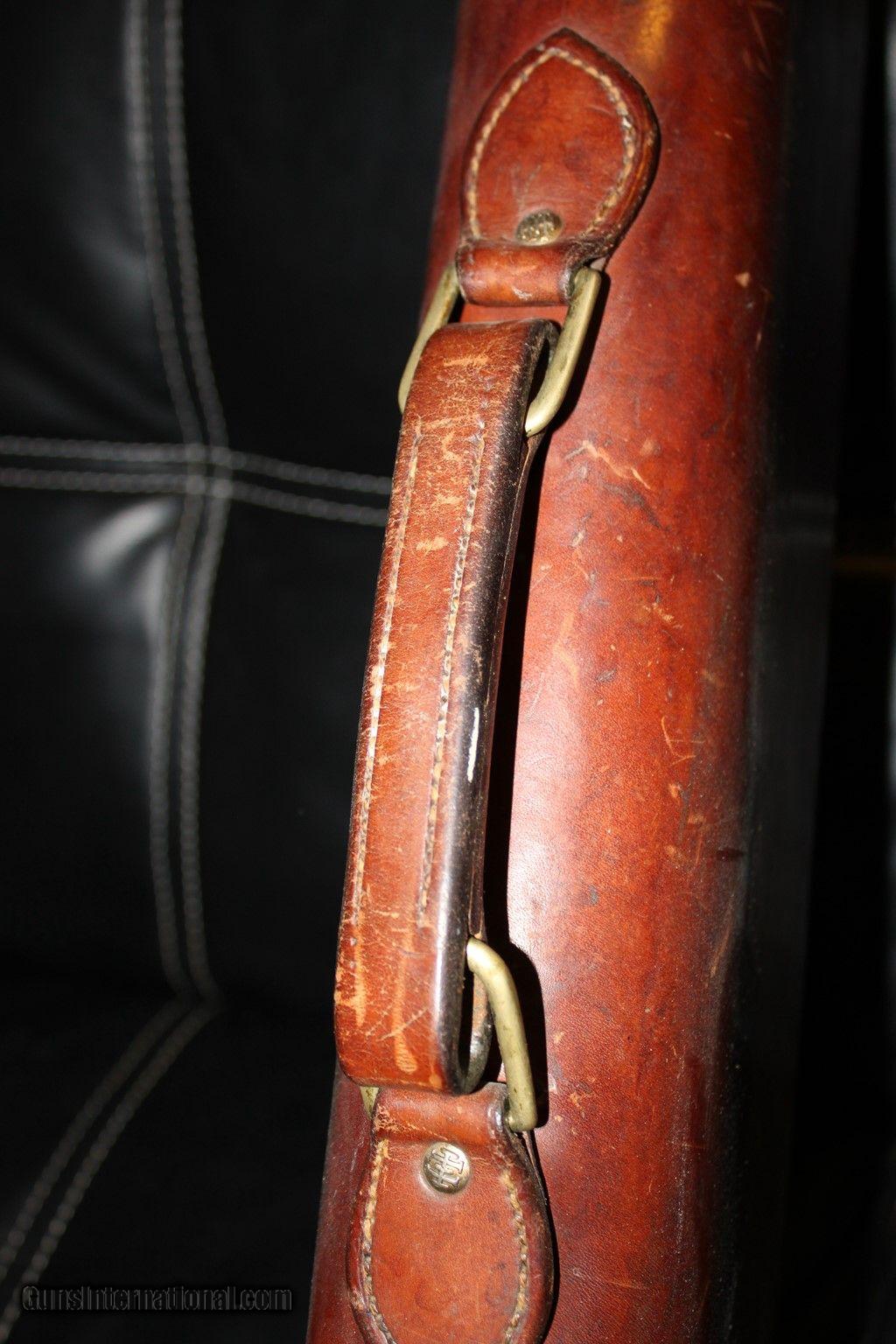 Description: Vintage HH Heiser take down gun case. All original with no repairs. The Leather is soft and has a nice patina and shows numerous marks on the exterior from use. The back strap shows the most wear(see pic #6). The interior is not lined and in good condition. The case is 31.75" long and will hold barrels up to 30". The top lid is 7.5" long and 3.5" wide. All stitching is very good. Please see the pictures for accurate description and condition SOLD |