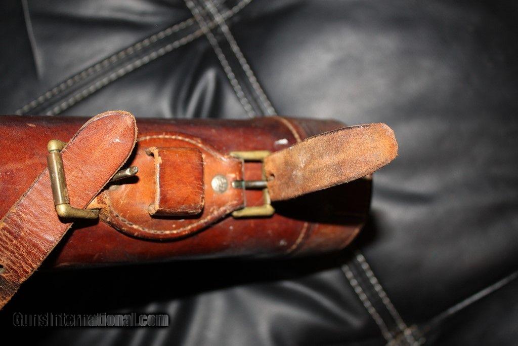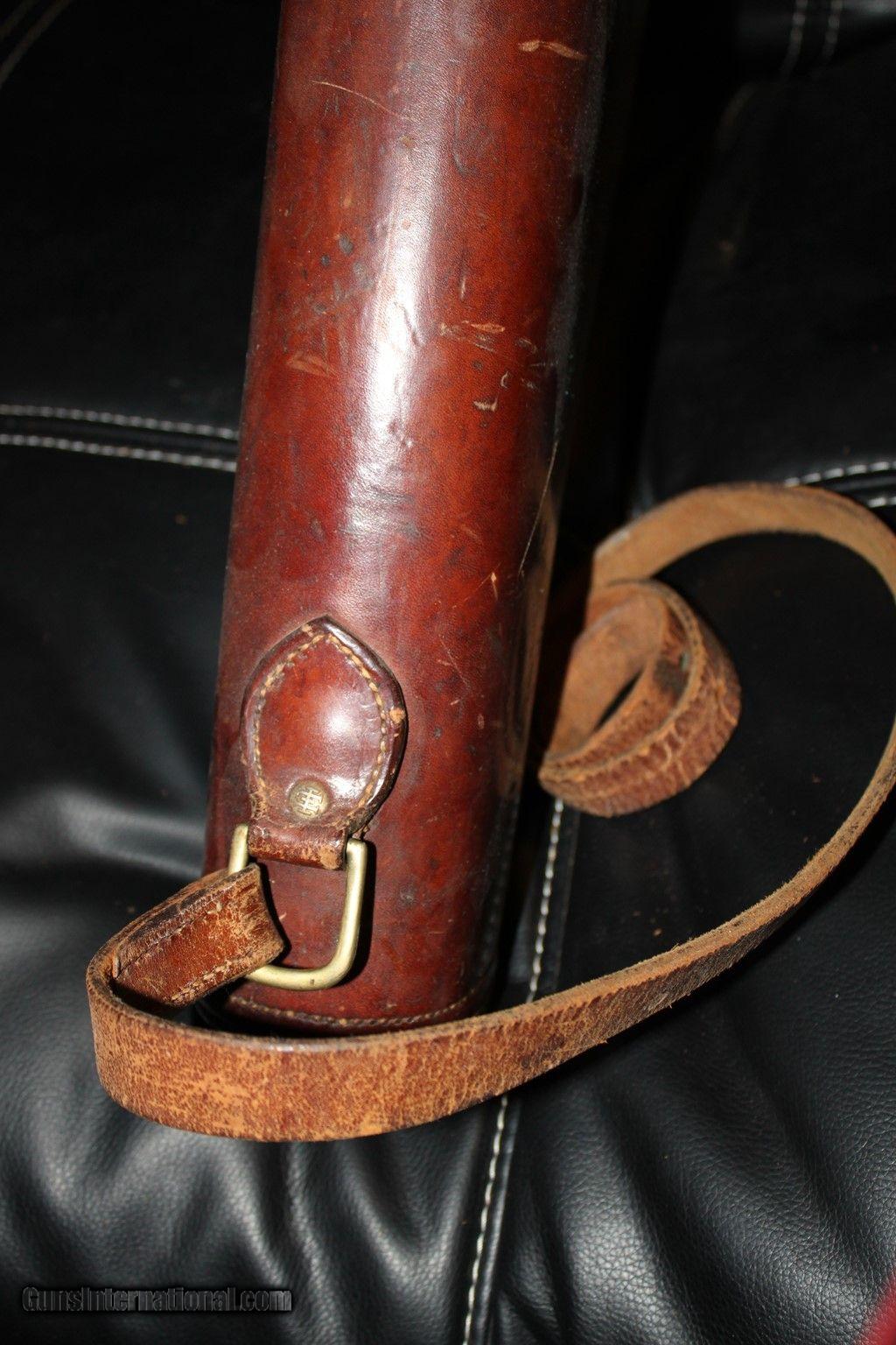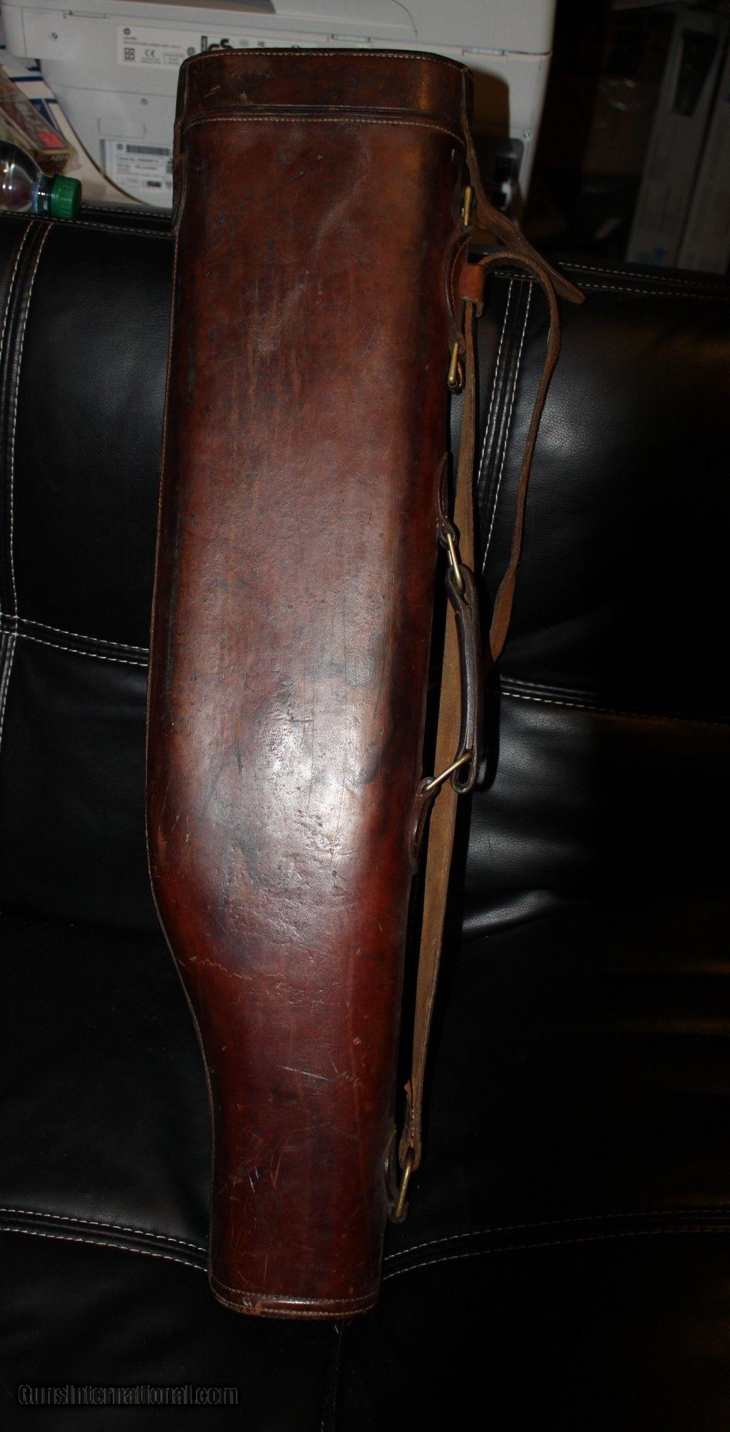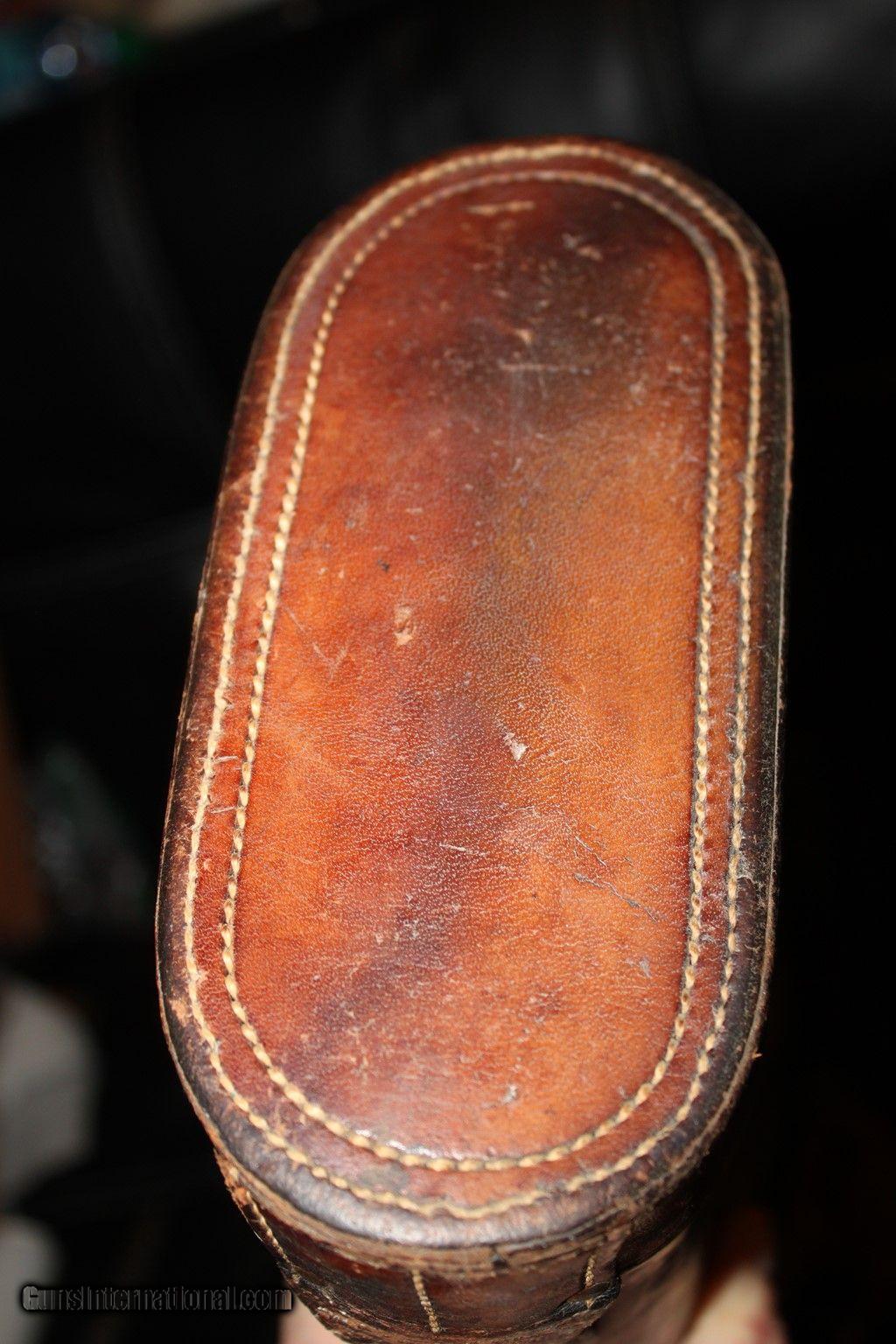 Description: Vintage HH Heiser take down gun case. All original with no repairs. The Leather is soft and has a nice patina and shows numerous marks on the exterior from use. The back strap shows the most wear(see pic #6). The interior is not lined and in good condition. The case is 31.75" long and will hold barrels up to 30". The top lid is 7.5" long and 3.5" wide. All stitching is very good. Please see the pictures for accurate description and condition SOLD |