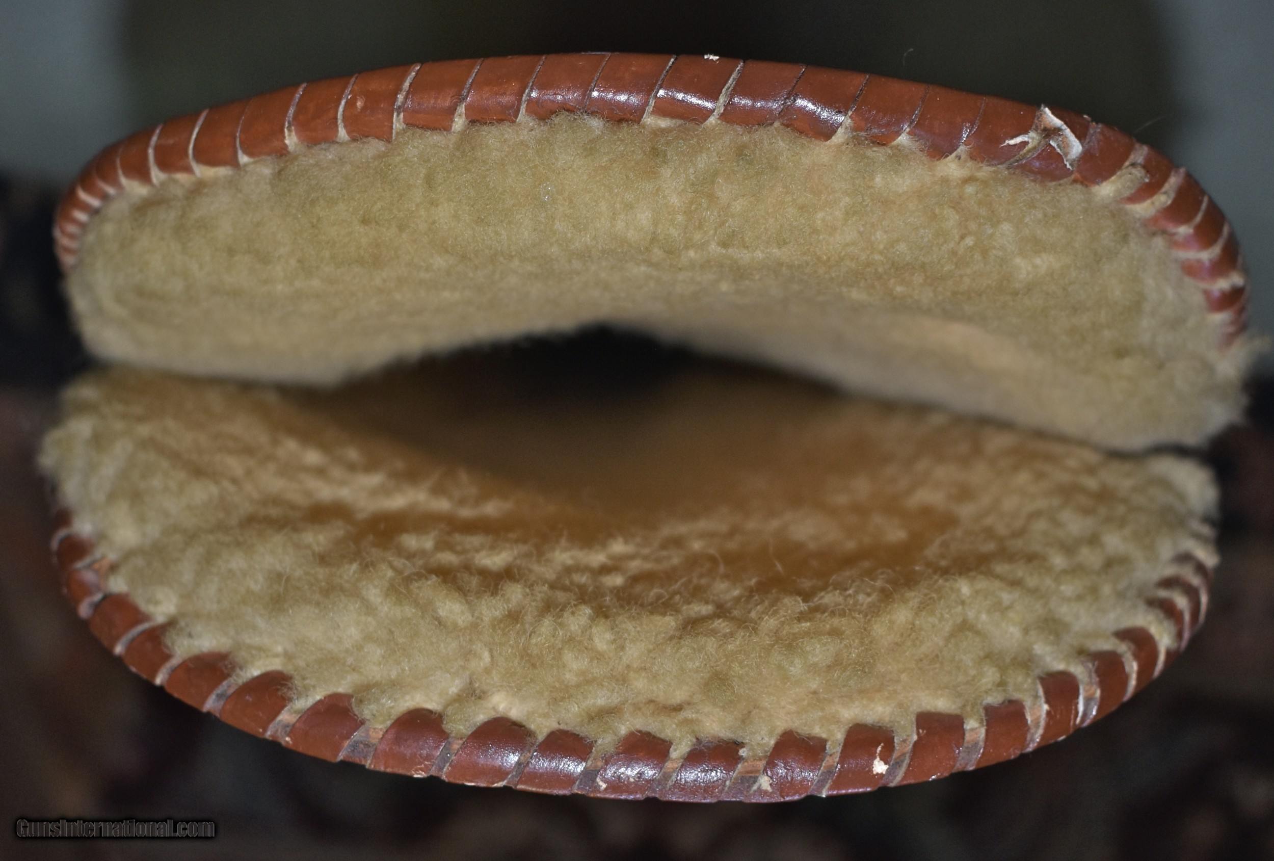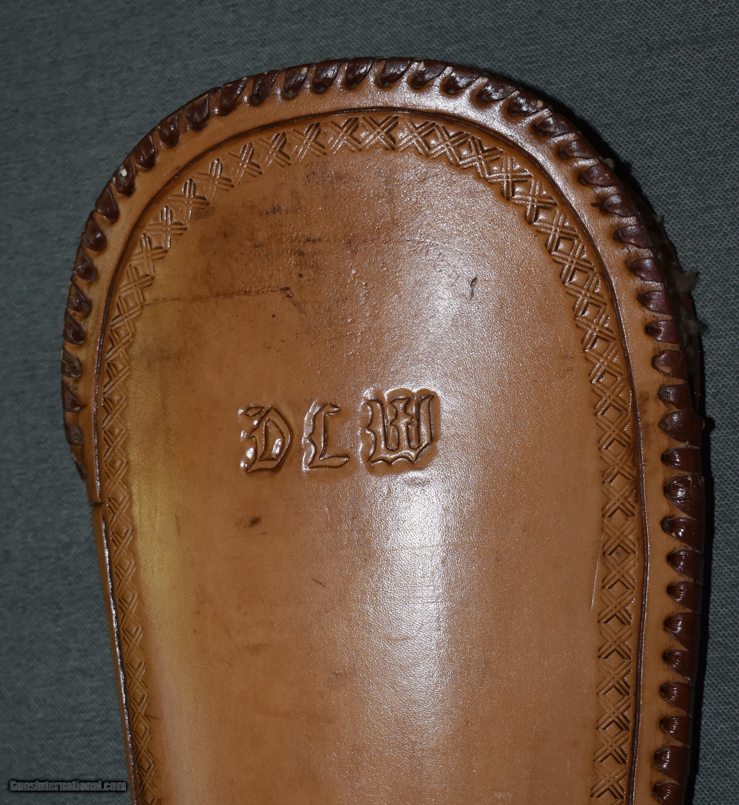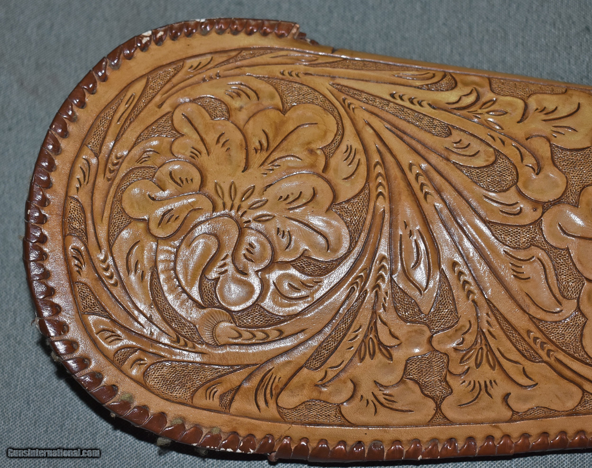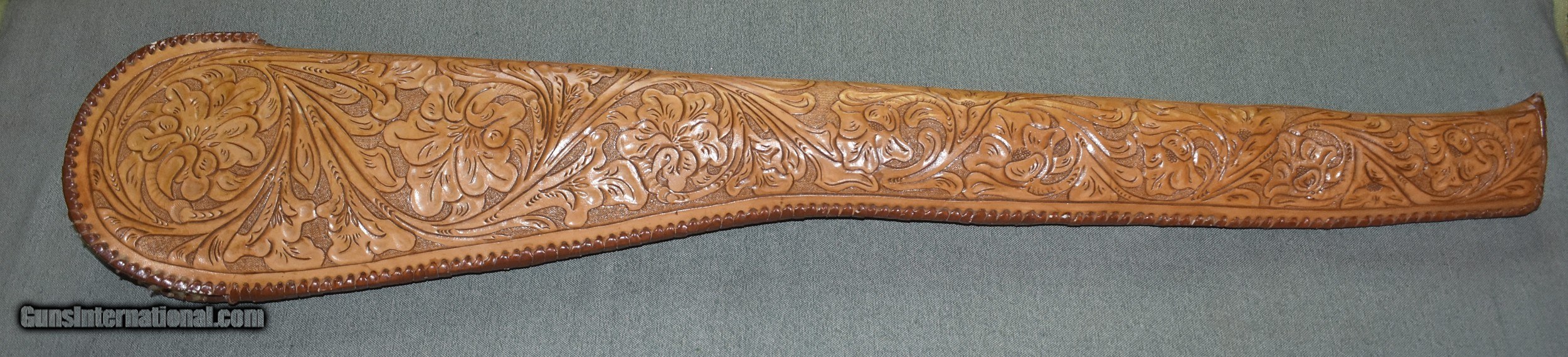 Description: A very well made heavy leather scabbard for a carbine or shotgun. Hand tooled and stiched with heavy fleece lining. Can be attached to a saddle or mounted on an RV. Overall length is 40". Very high quality. SOLD |