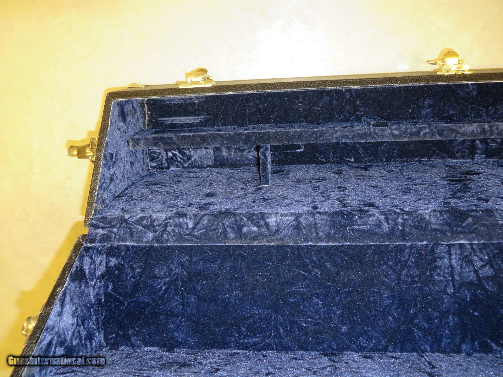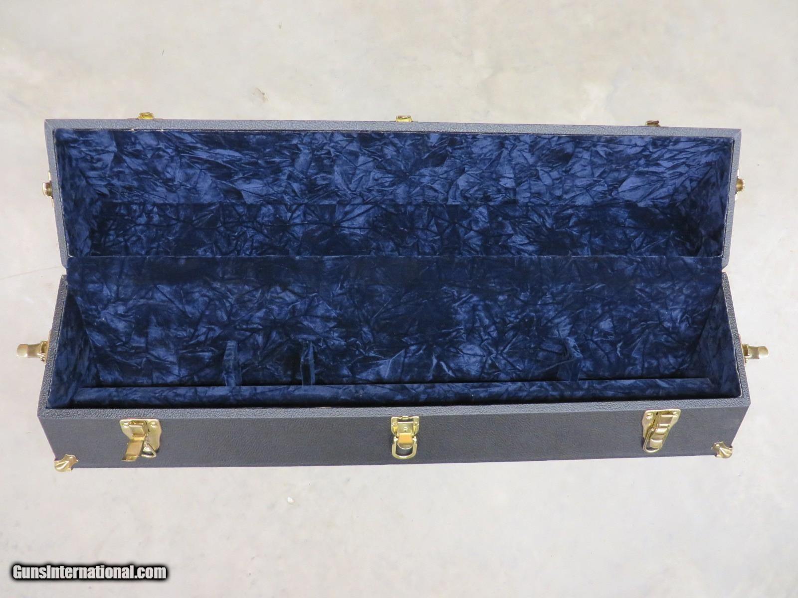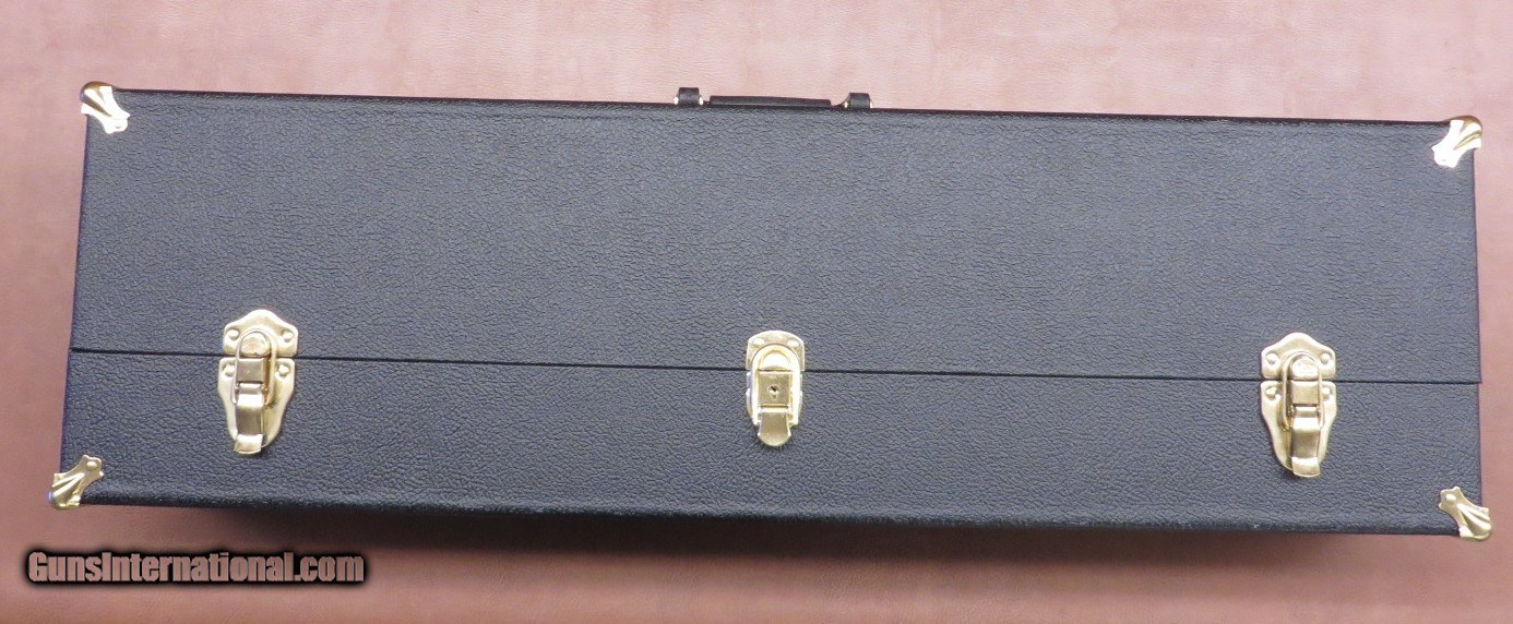 Description: Black case with gold hardware and blue velvet interior. Measures 33x10x6 inches. Comes with key for locking. Compartments for stick mags and drum. Stock removal required. Excellent used condition. SOLD |