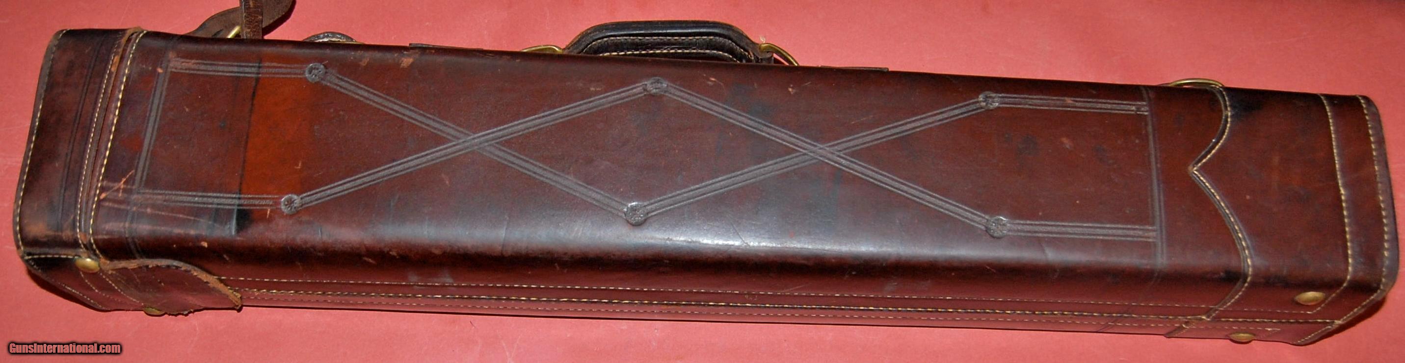 Description: Leather takedown case for shotgun or rifle.This case is 31 1/2" long and 6 1/2" square.It can handle one or two barrels up to 31" long.The case is in excellent condition with brass buckles and fittings.The leather handle,hinge,and shoulder straps are supple and in excellent condtion.The interior is clean and sound.This is an excellent case for doubles,model 12s,or takedown rifles.I cannot find any makers mark on the case,so it is hard to date the case.I am guessing 1940s or 1950s. SOLD |