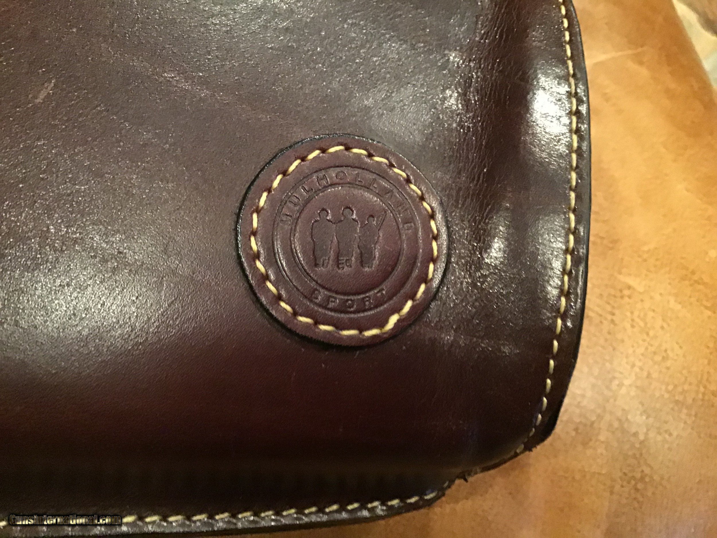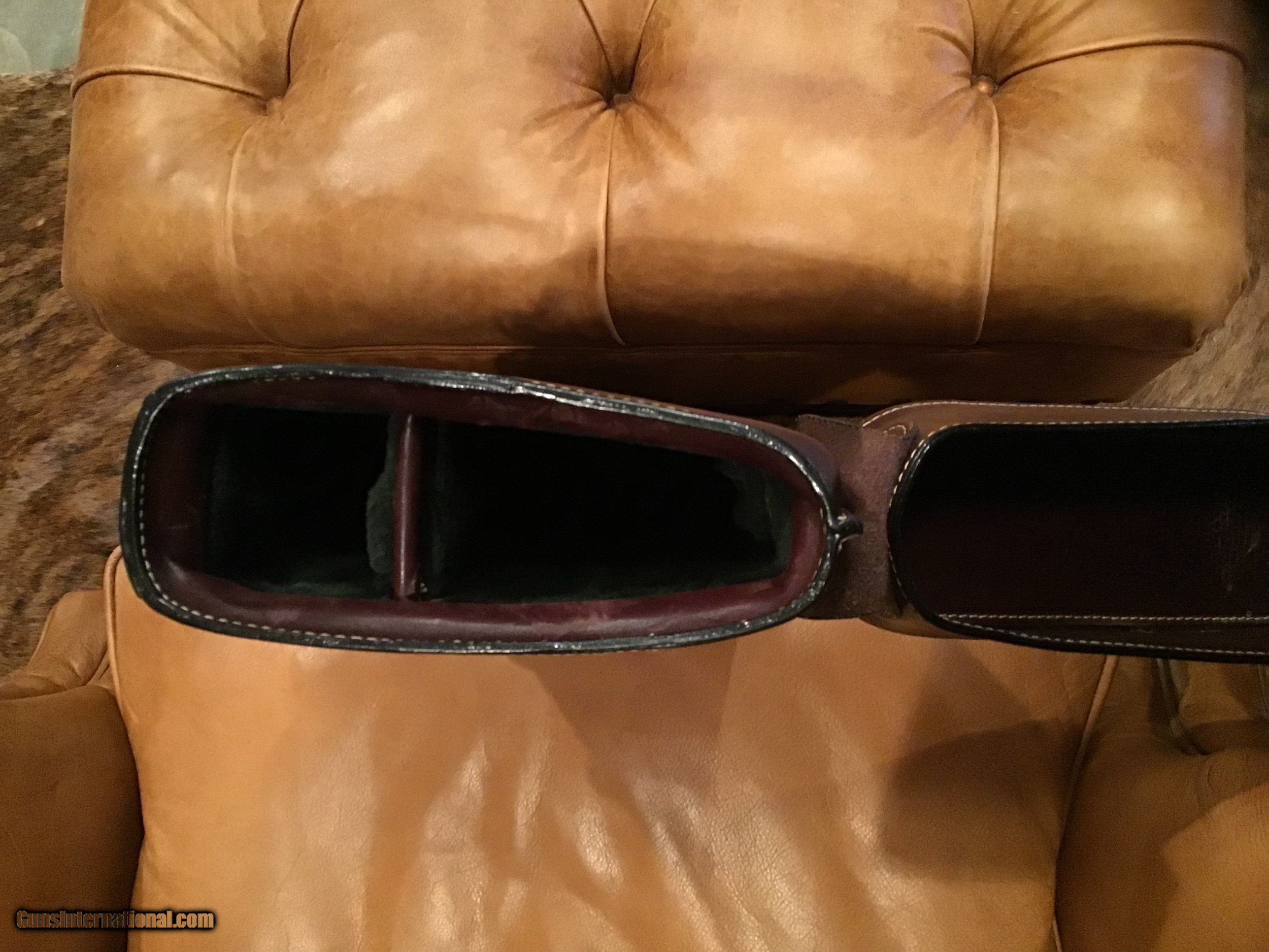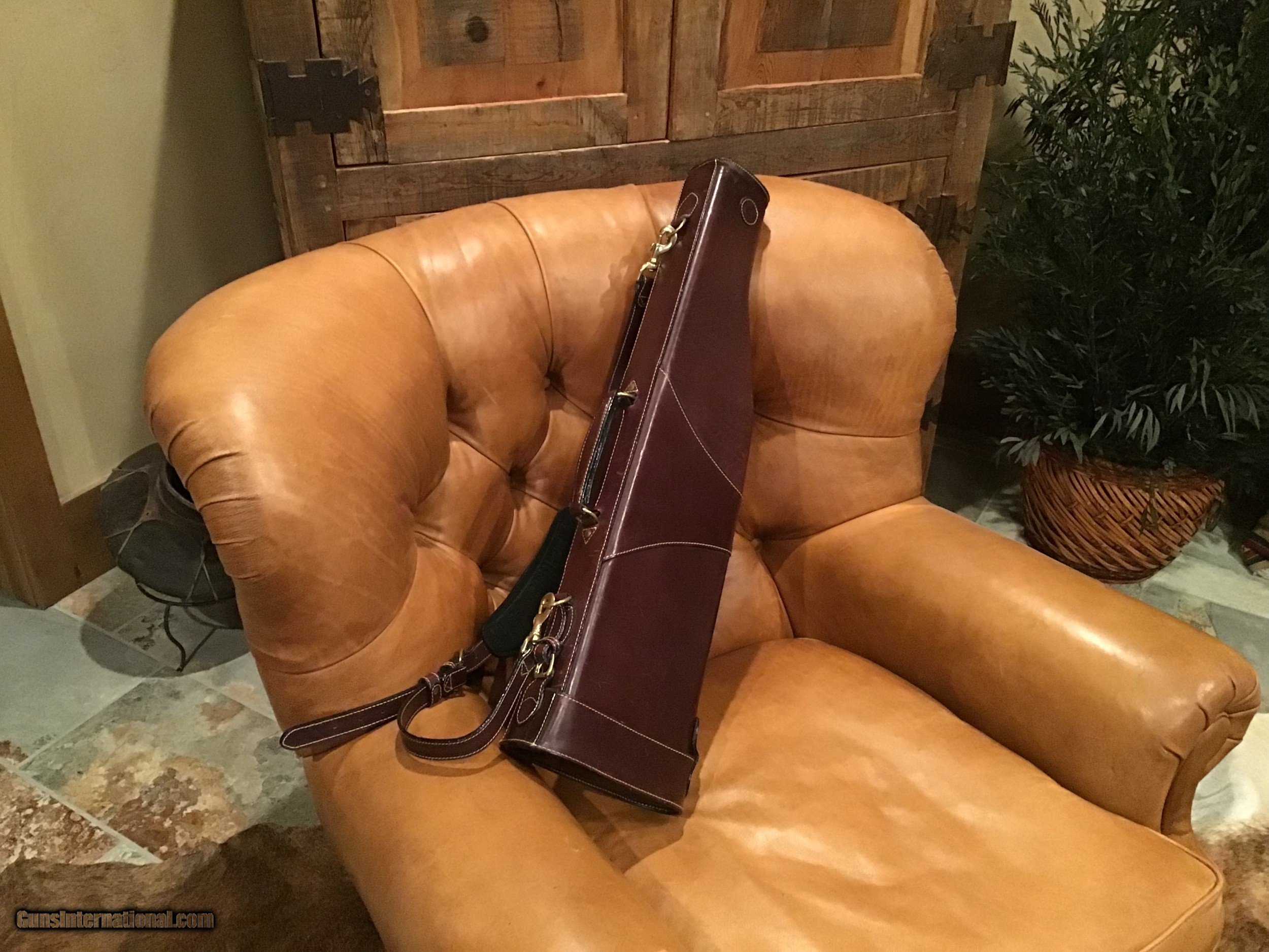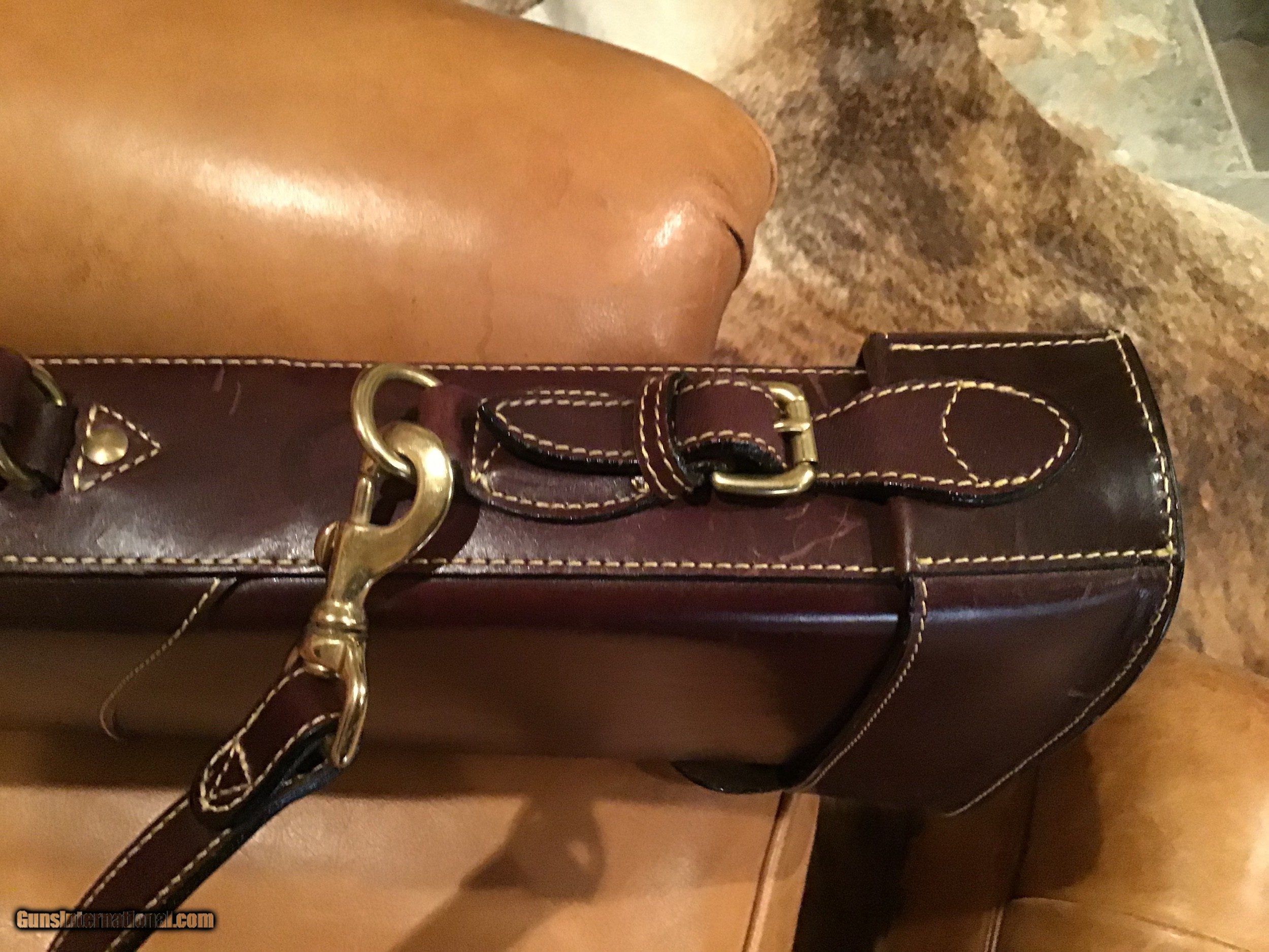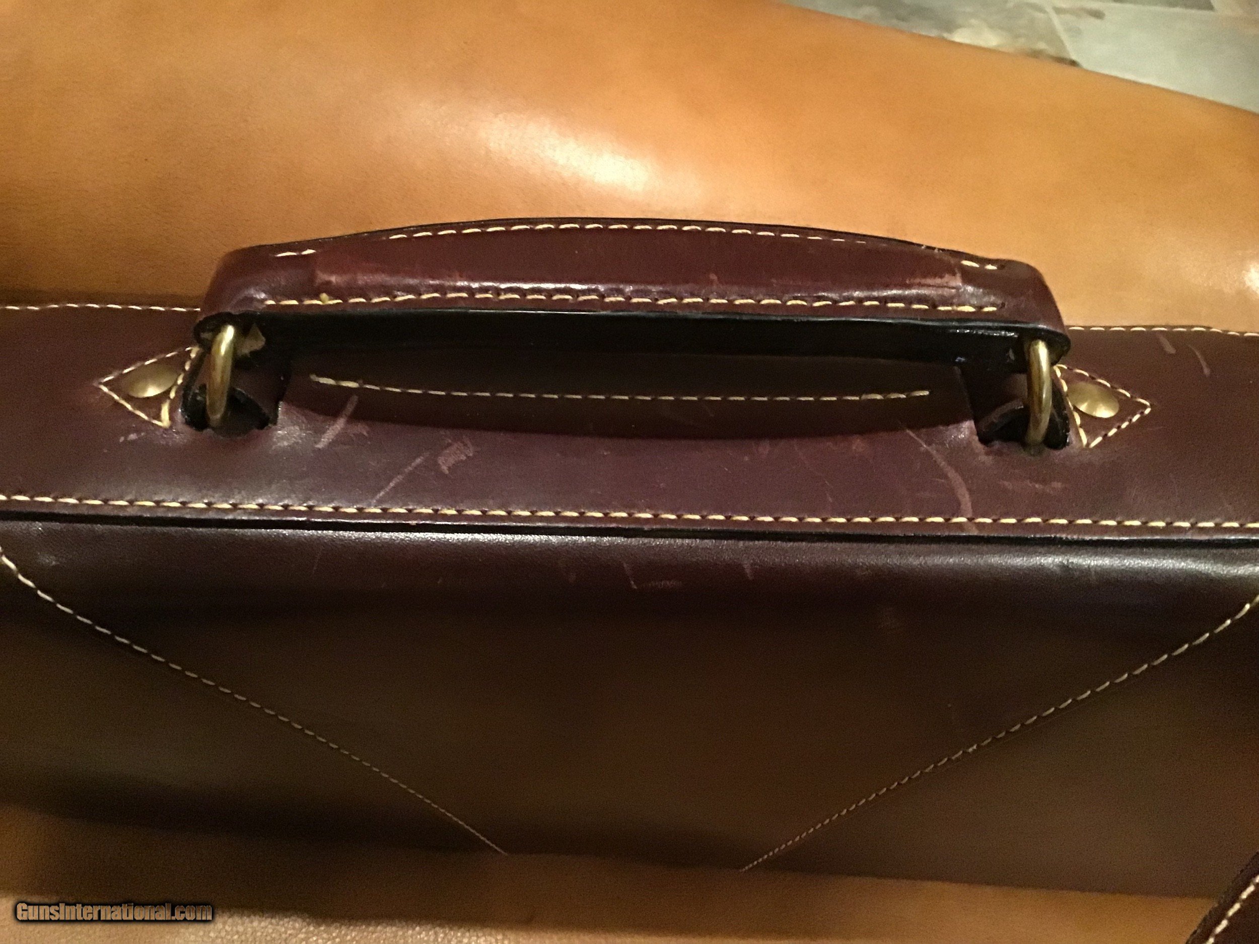 Description: Like new Mulholland Bros. Leg O' Mutton take down case. Highest quality leather work. Will take a 28" SXS or O/U. Soft, green, padded,velour interior. SOLD |