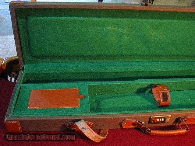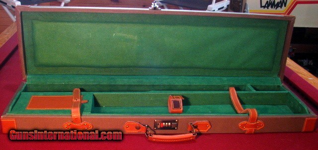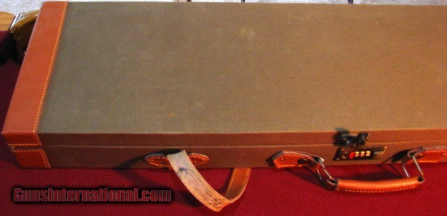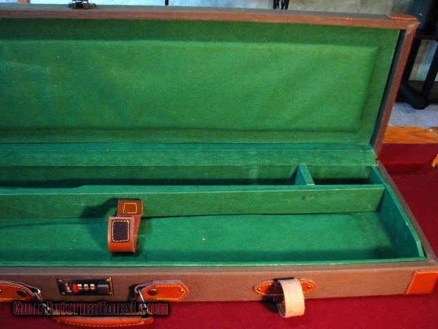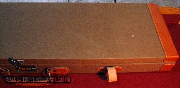 Description: Canvas and leather shotgun trunk case which will accomadate barrels to 33" Combination lock. Not a super high quality case but very servicable and in very nice condition. SOLD |