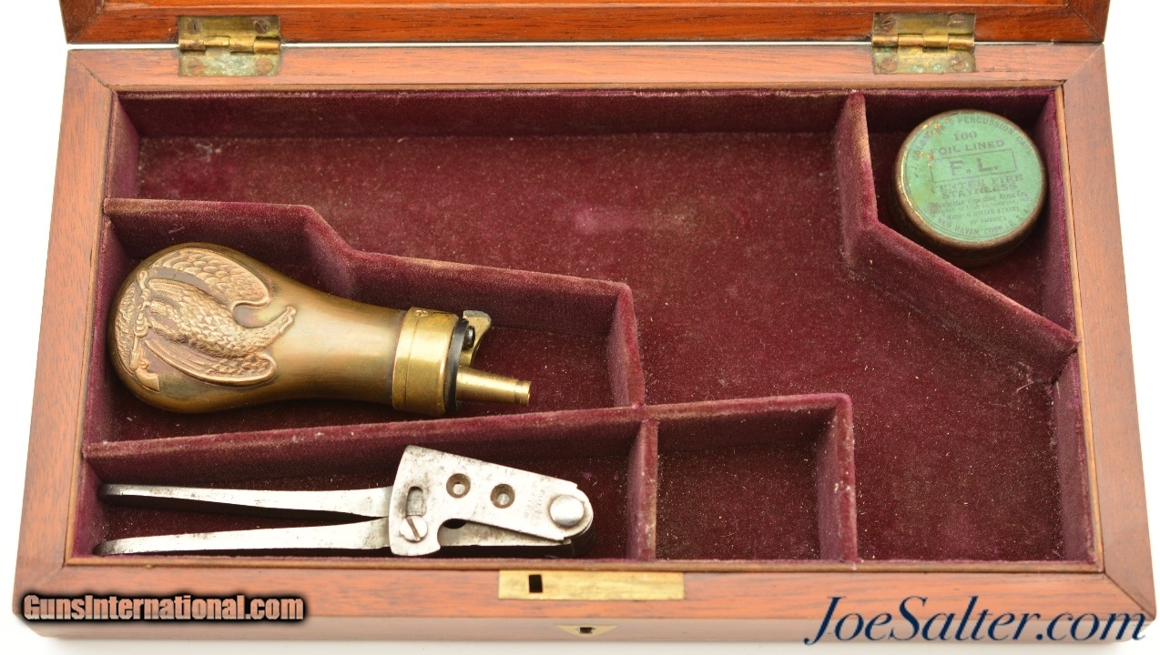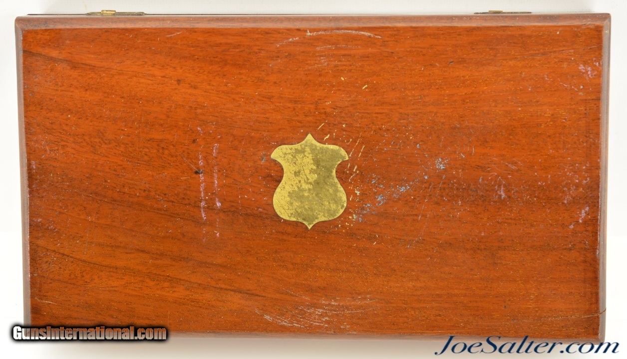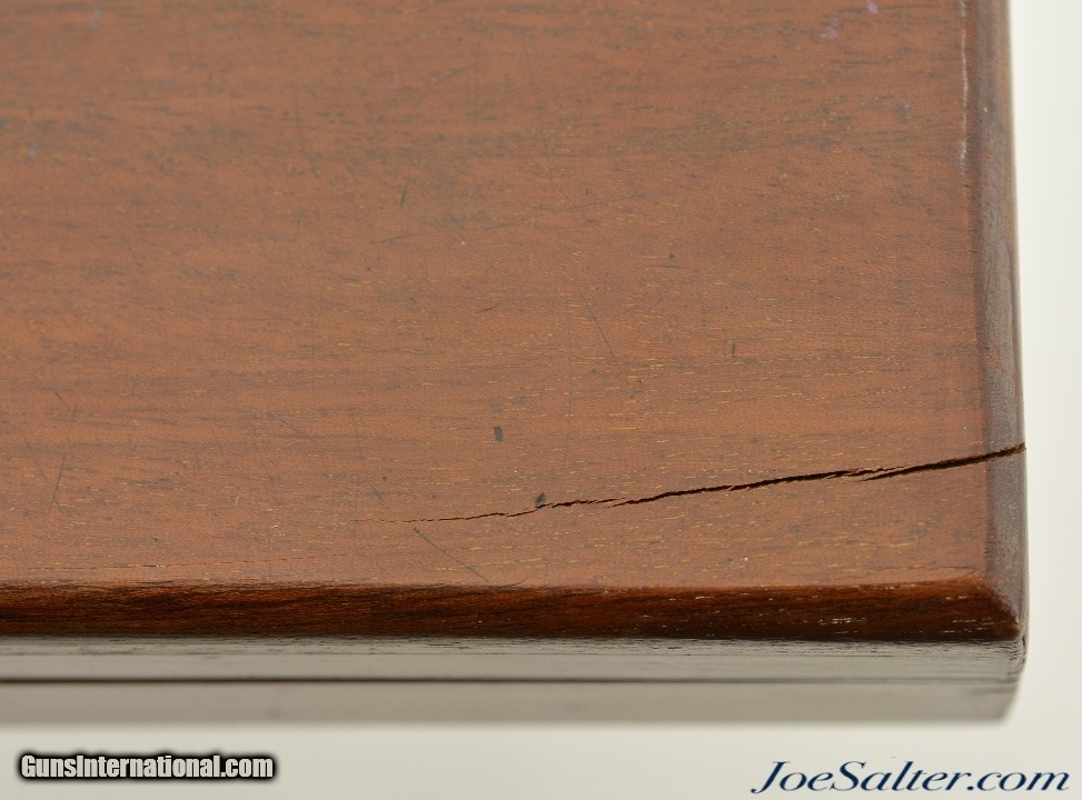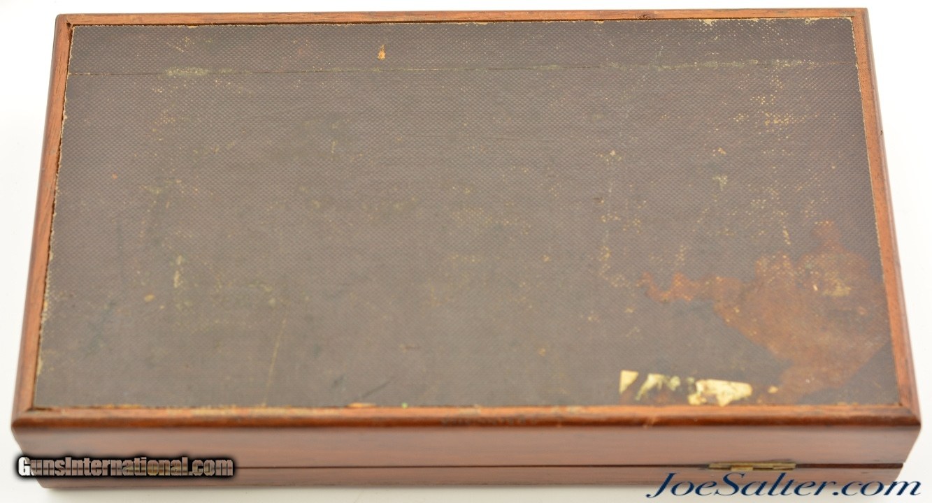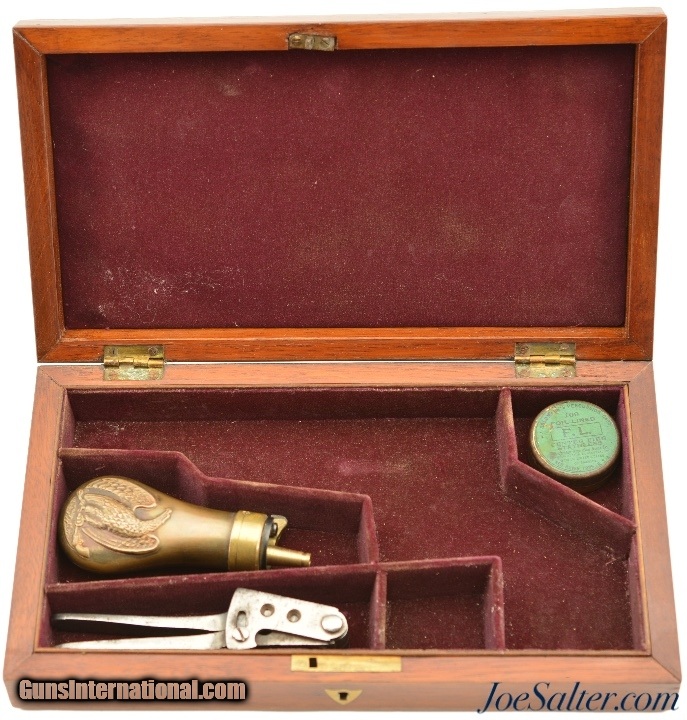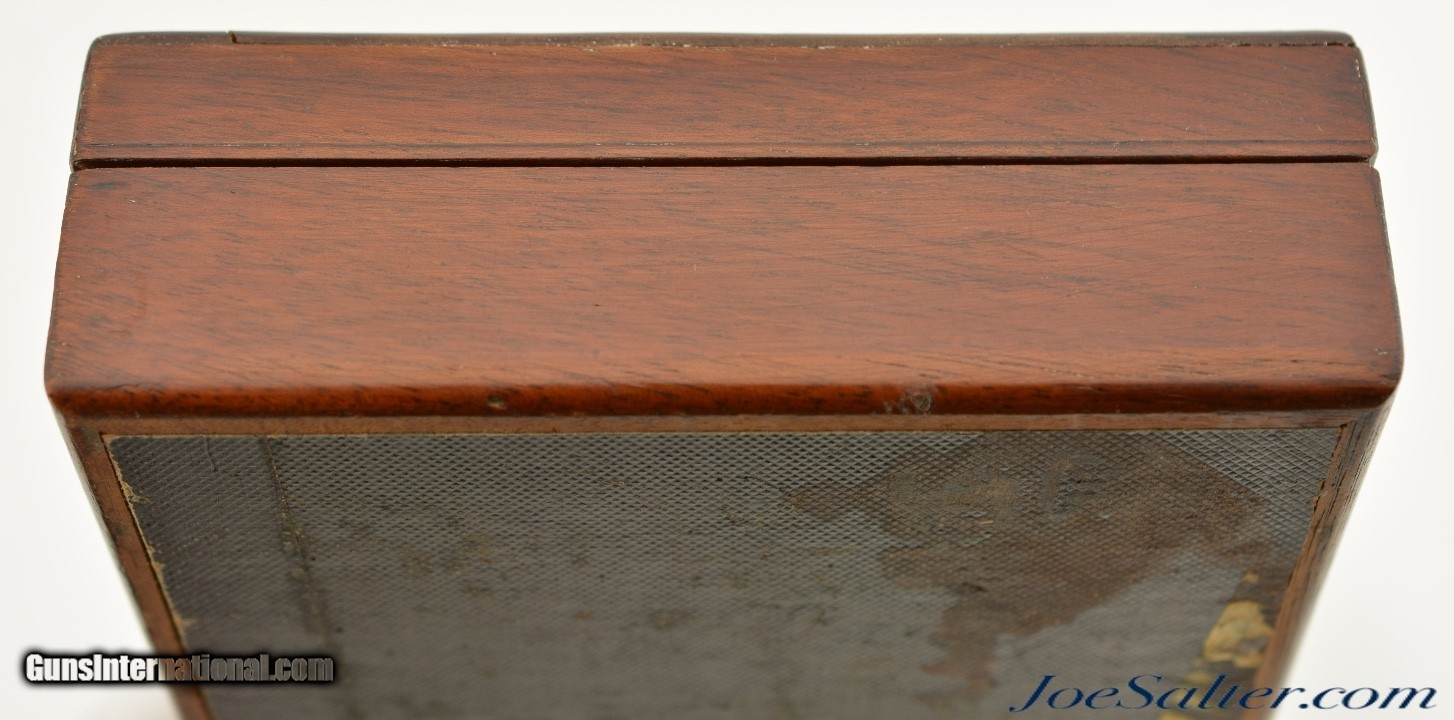 Description: This is an antique red velvet lined wood presentation box for the Colt Model 1849 with barrel lengths up to 4 ½". The hinged mahogany box measures 10 ½" x 6" x 2 1/4" with a brass shield inlay on the top, side lock that is missing the key and has 5 lined compartments for the gun, bullet mold, flask, caps and small parts. The box is in near excellent condition with some light scratches and color transfer on the cover with a small age split on the bottom right corner that is stable. Included is an original .36 caliber bullet mold that is in very good cleaned condition, an eagle holding a revolver motif flask that works but has a missing metal chunk on the thumb release and an empty Winchester tin of foil lined percussion caps marked J. Goldmark's. A very nice assemblage just waiting for a revolver to complete. SOLD |