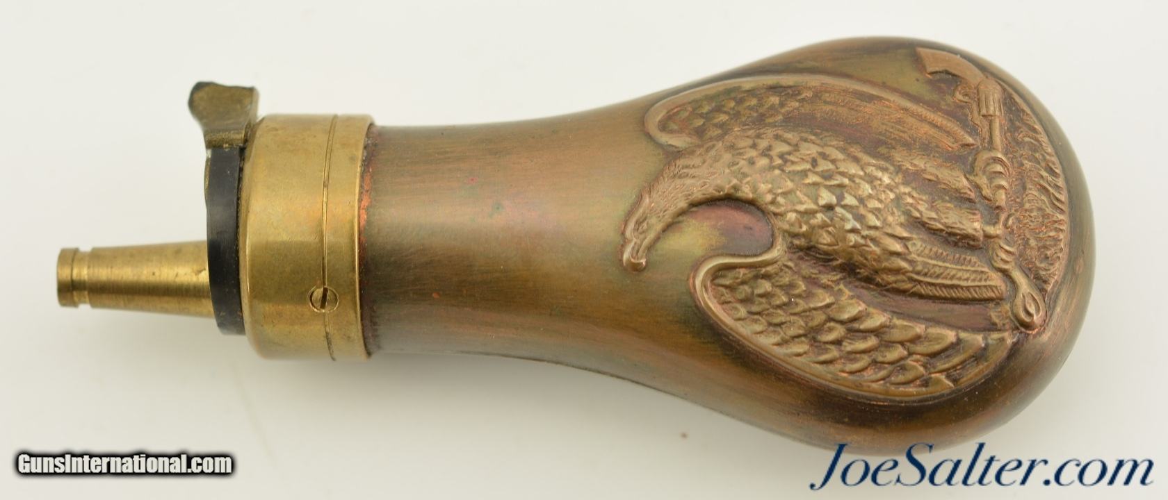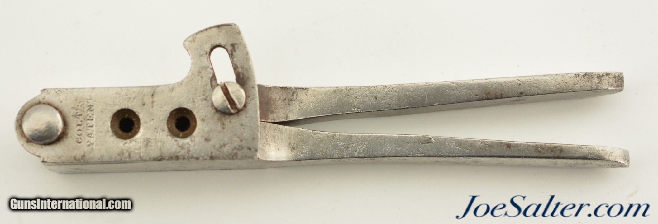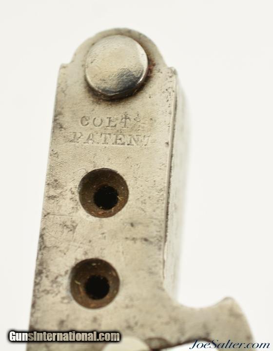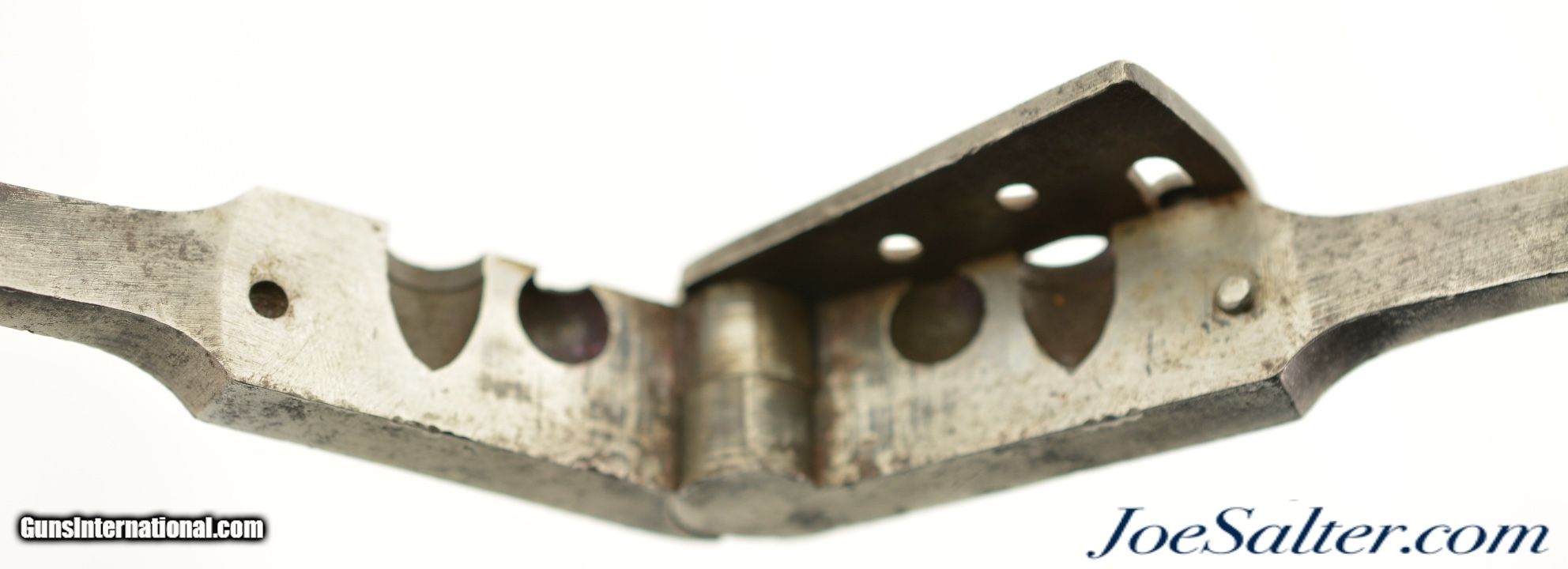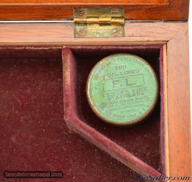 Description: This is an antique red velvet lined wood presentation box for the Colt Model 1849 with barrel lengths up to 4 ½". The hinged mahogany box measures 10 ½" x 6" x 2 1/4" with a brass shield inlay on the top, side lock that is missing the key and has 5 lined compartments for the gun, bullet mold, flask, caps and small parts. The box is in near excellent condition with some light scratches and color transfer on the cover with a small age split on the bottom right corner that is stable. Included is an original .36 caliber bullet mold that is in very good cleaned condition, an eagle holding a revolver motif flask that works but has a missing metal chunk on the thumb release and an empty Winchester tin of foil lined percussion caps marked J. Goldmark's. A very nice assemblage just waiting for a revolver to complete. SOLD |
