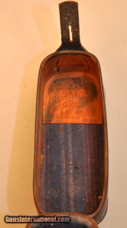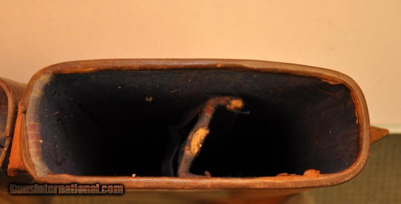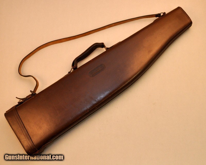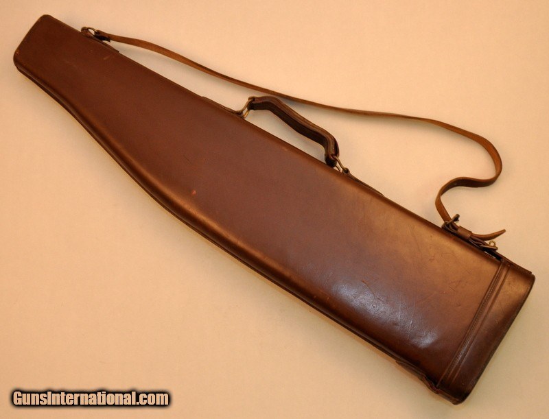 Description: Number G.1405. Leather case with carrying strap for shotguns with 28" or 30" barrels. Cloth lined interior with forend pouch on partition. Inside of lid has ID markings from previous owners. Exterior is in very good condition showing scattered handling marks. Interior shows wear with small tears at top of partition. Priority mail $25.00. SOLD |