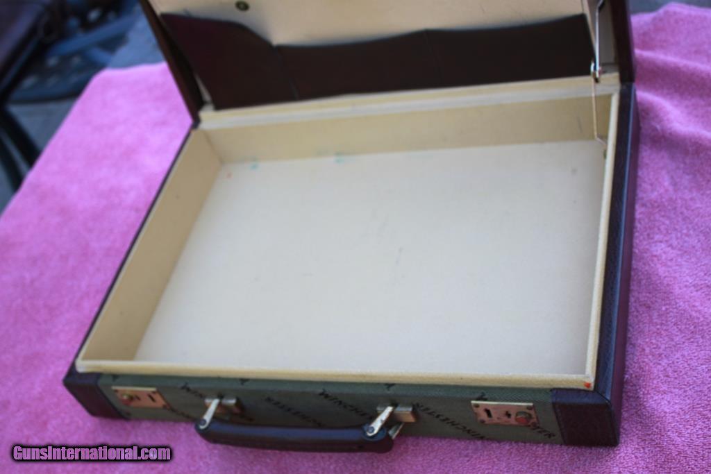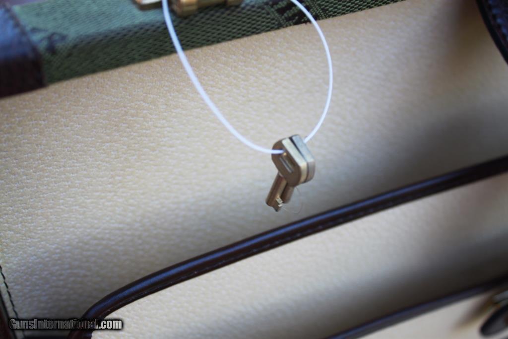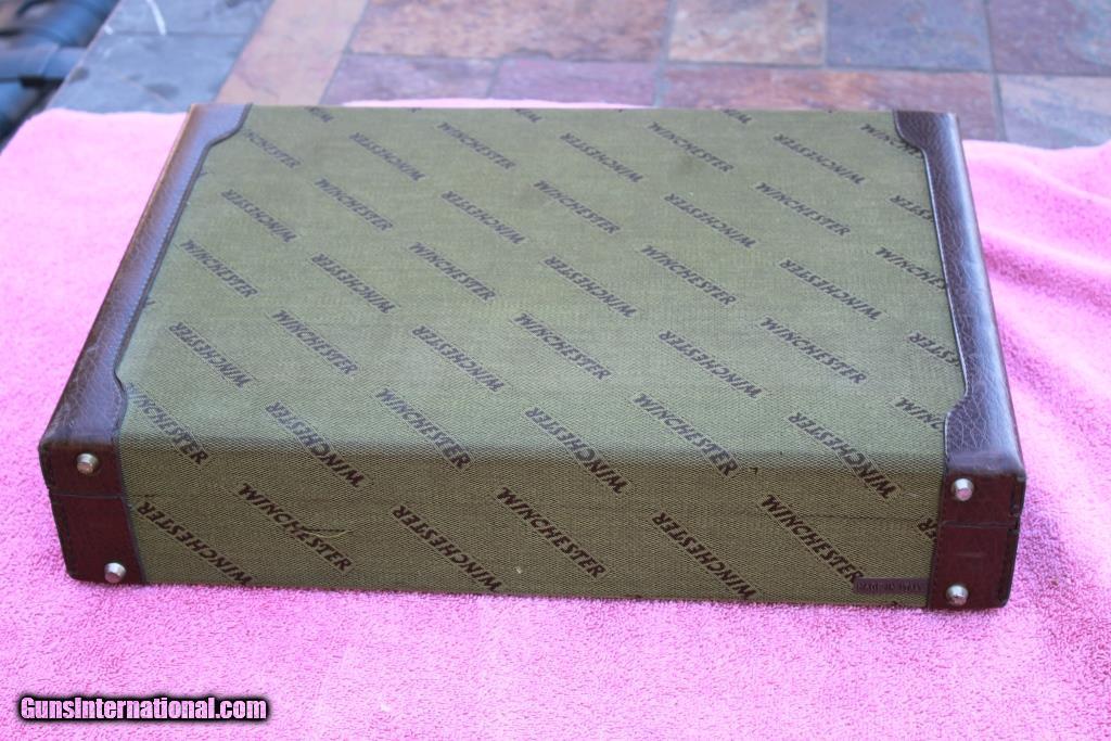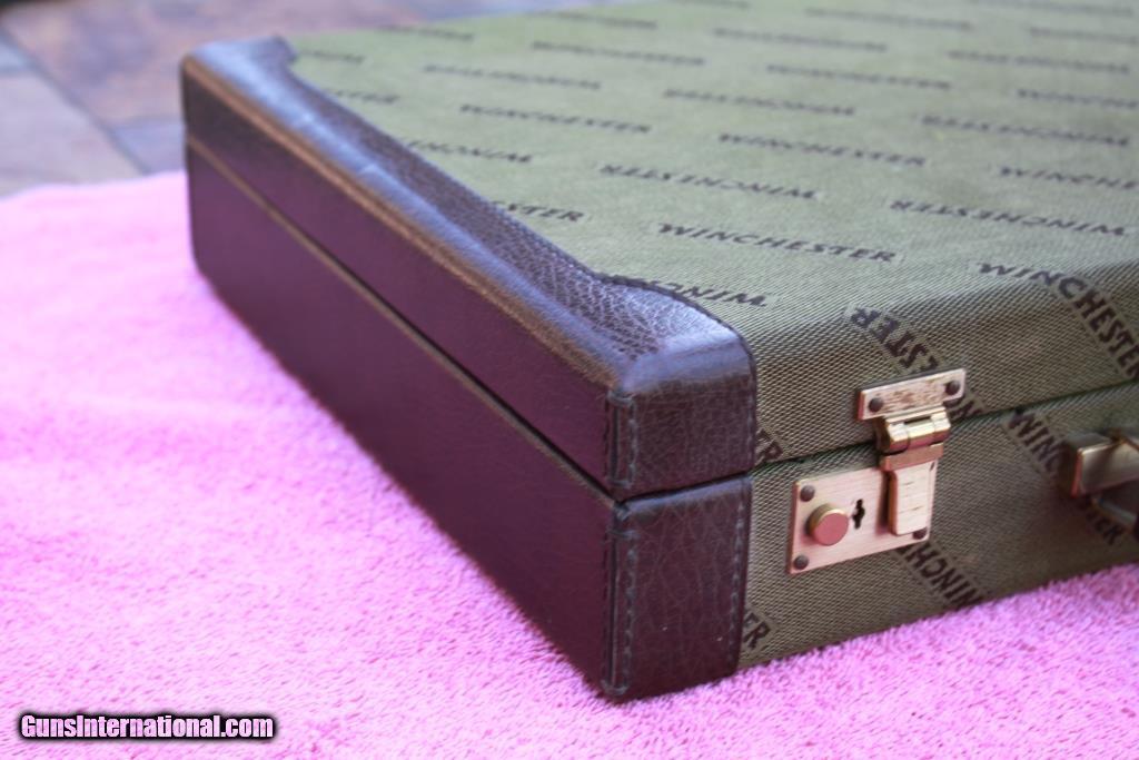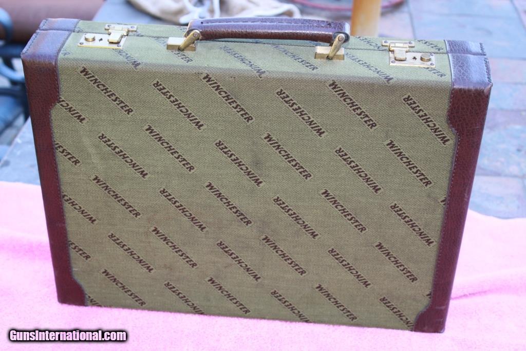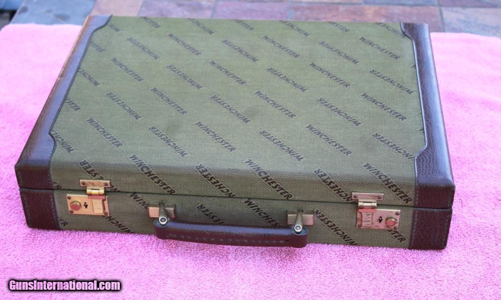 Description: SOLD! - Winchester Briefcase made in Italy by Emmebi. Just like the cases made for model 101 and 23 shotguns. Outstanding condition on the outside showing only slight use. Very good condition inside showing some small marks from use. Dimensions are approx. 20” x 15” x 4.5”. Two original keys are included. Very hard to find Winchester accessory. Please see detailed pictures for accurate description and condition. SOLD |