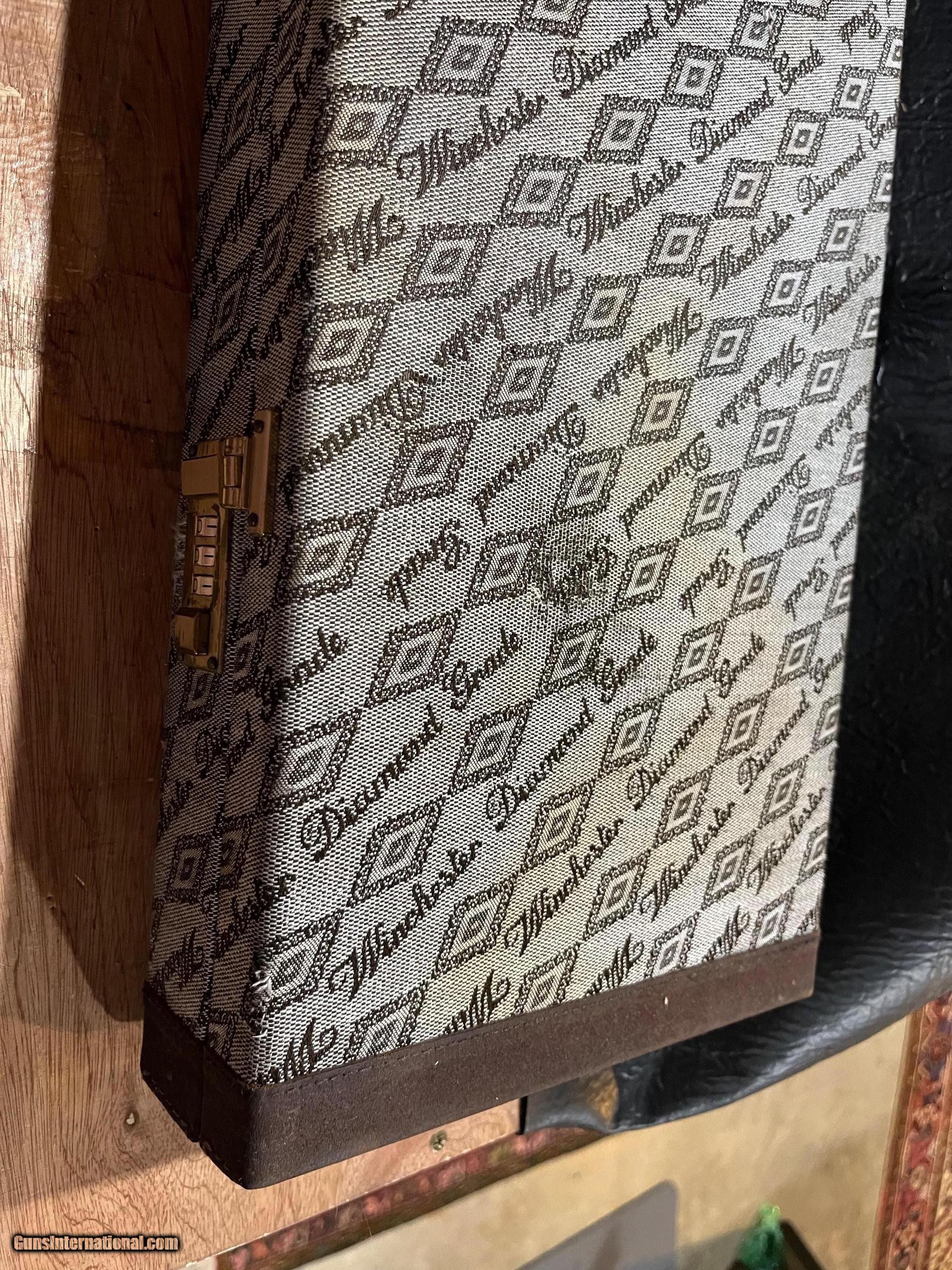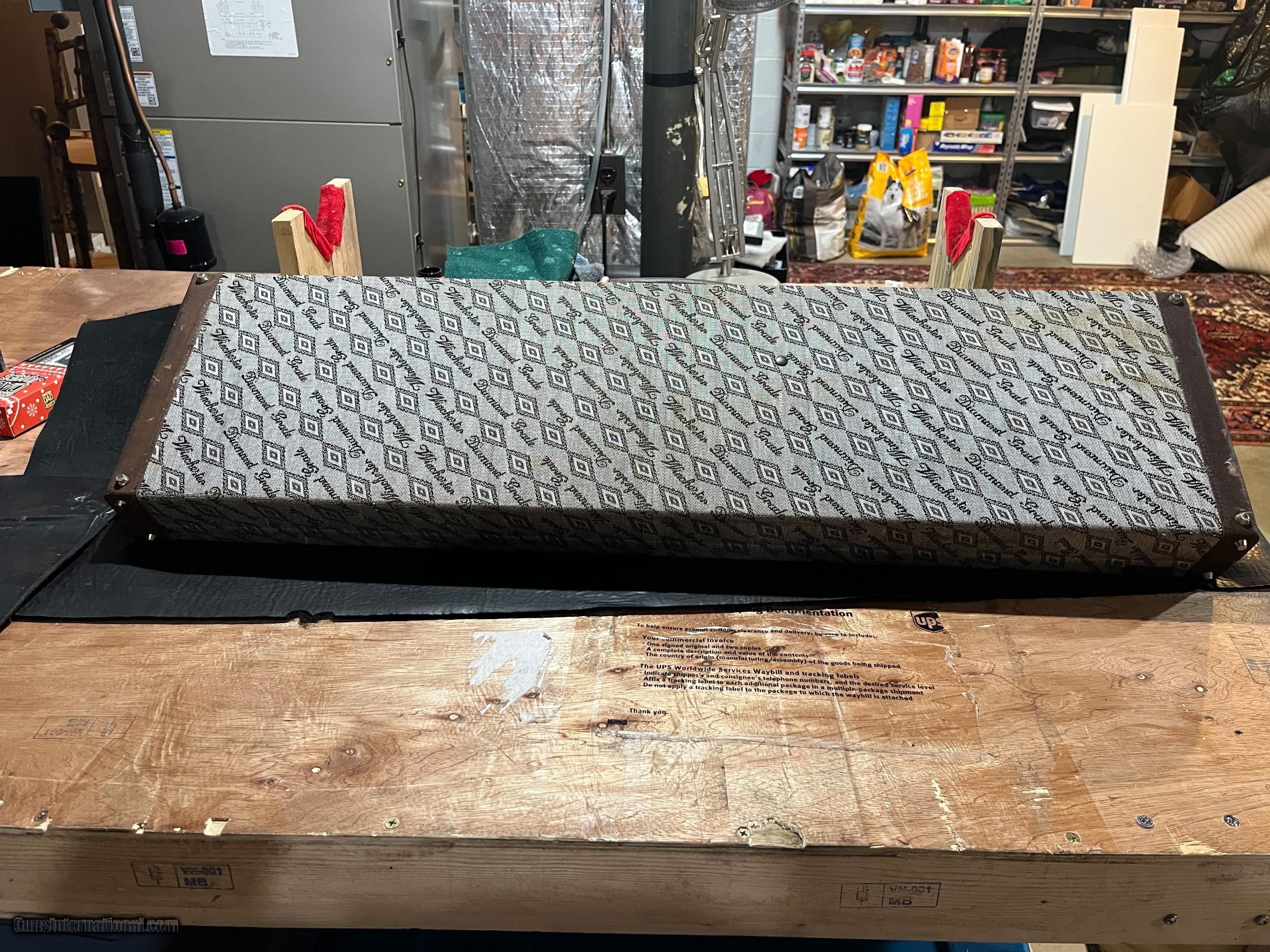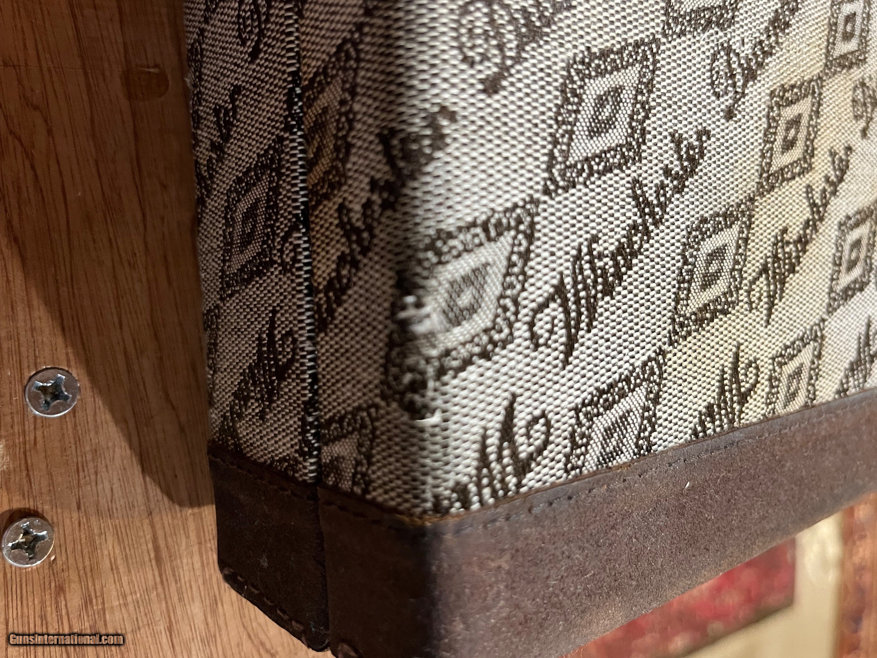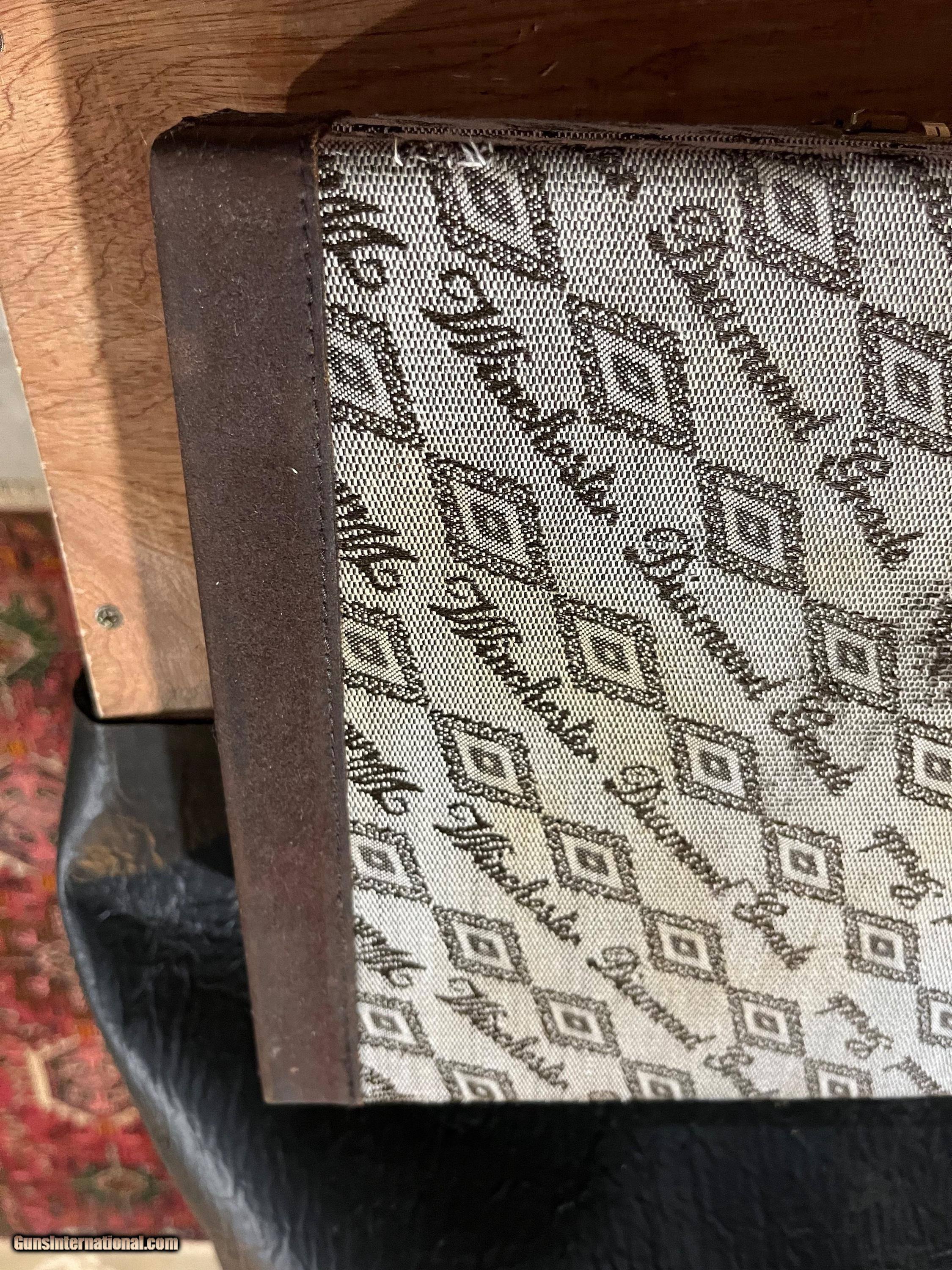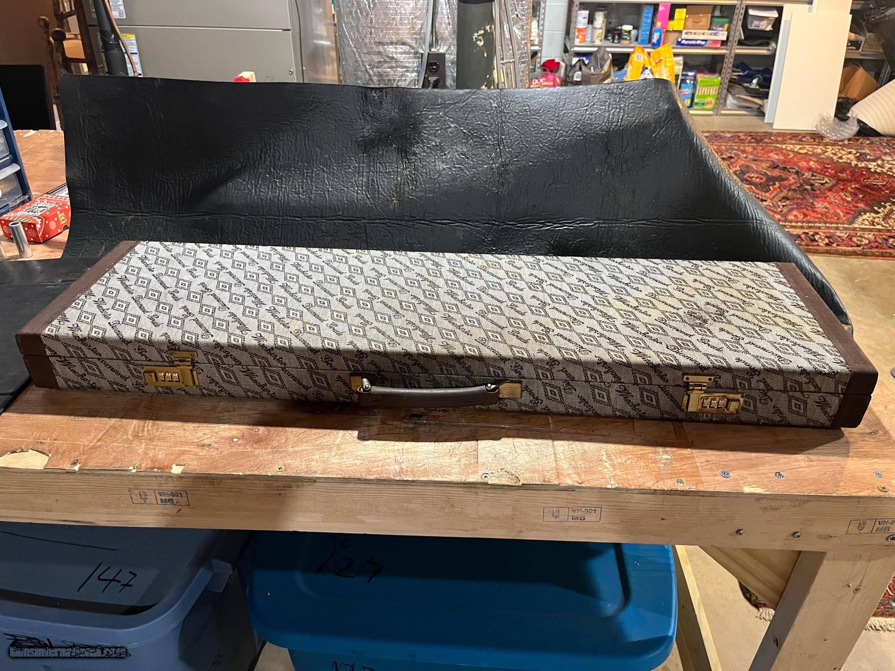 Description: Well used but solid Winchester Diamond Grade case. Combo locks work fine. Interior is intact. Handle is solid. Barrel channel is 34" long. 32" from front edge of glued in block at breech end. One removable block at muzzle end. Exterior shows slight abrasion and pale stain at right end (see photos). SOLD |