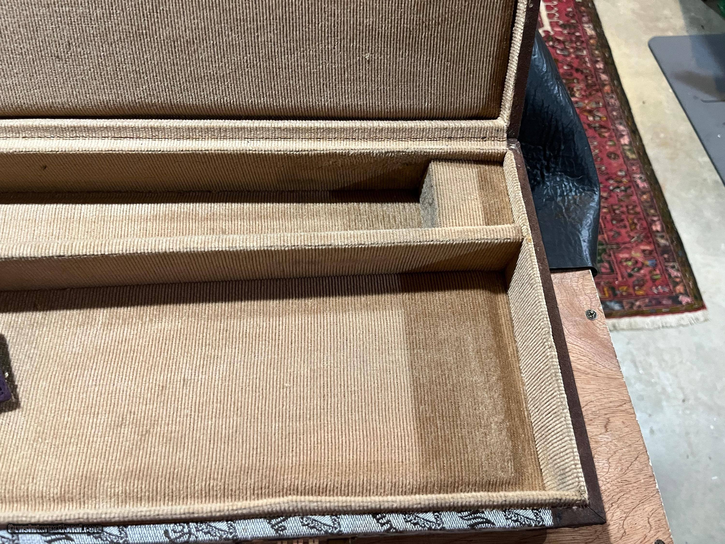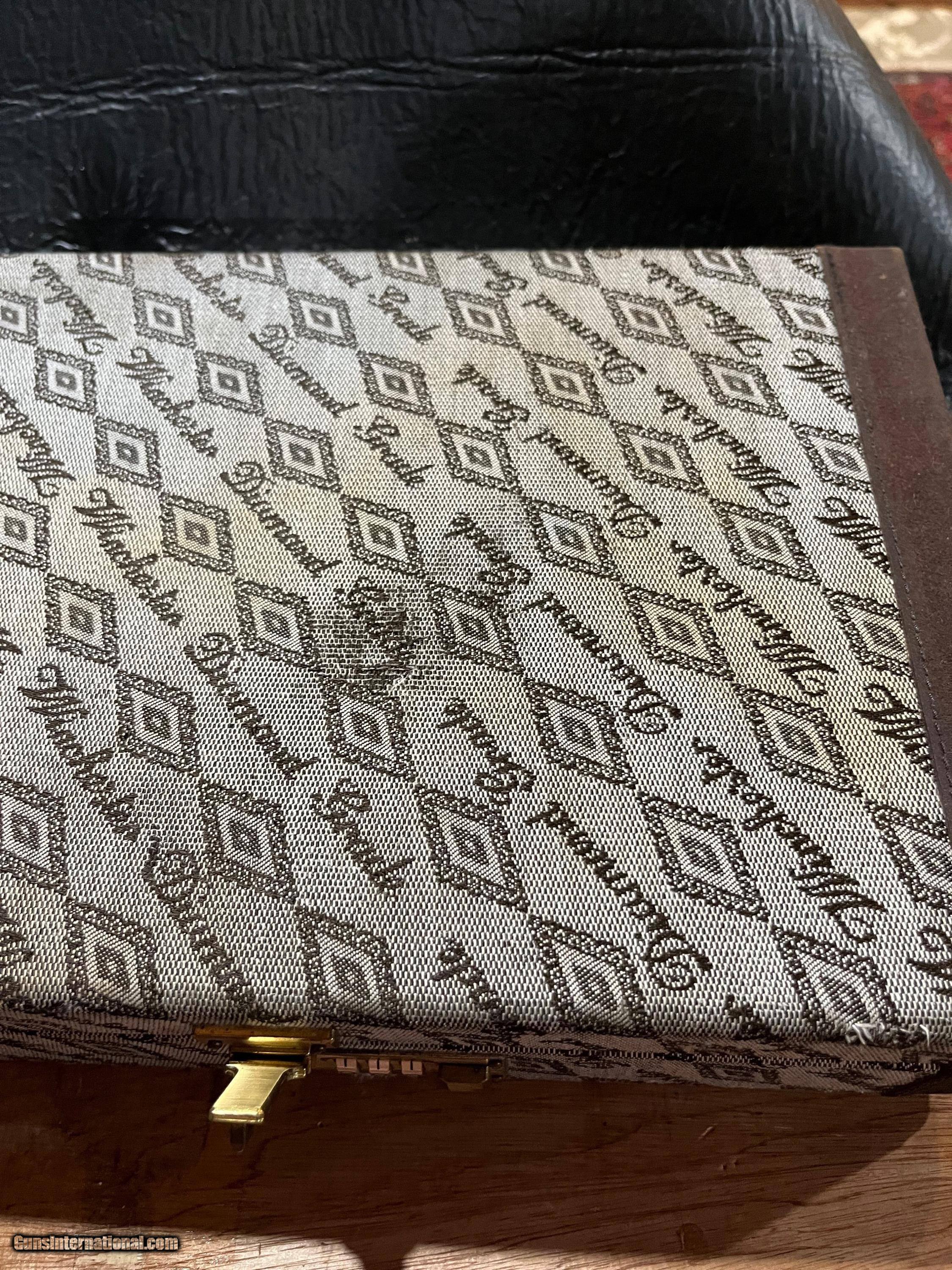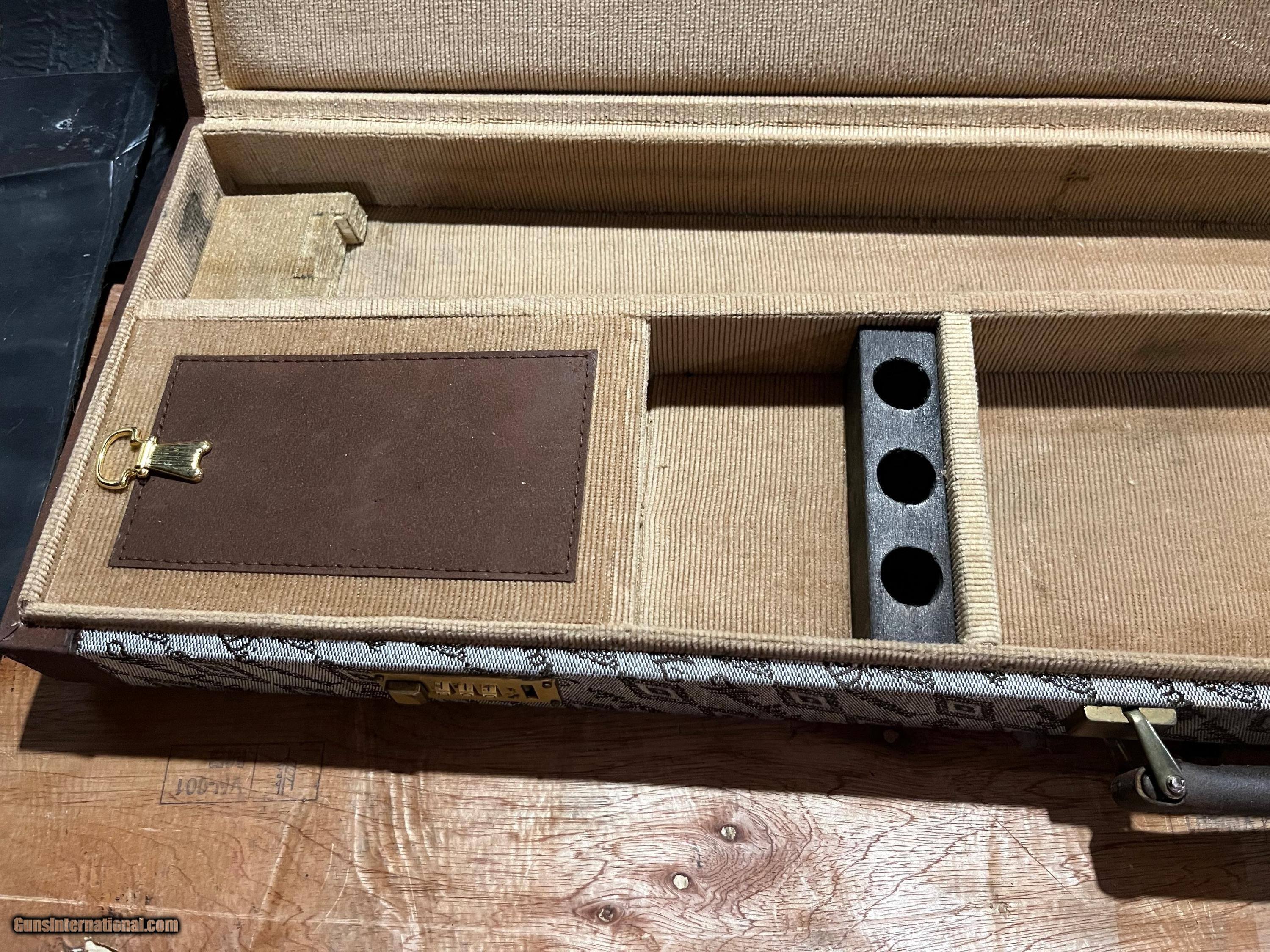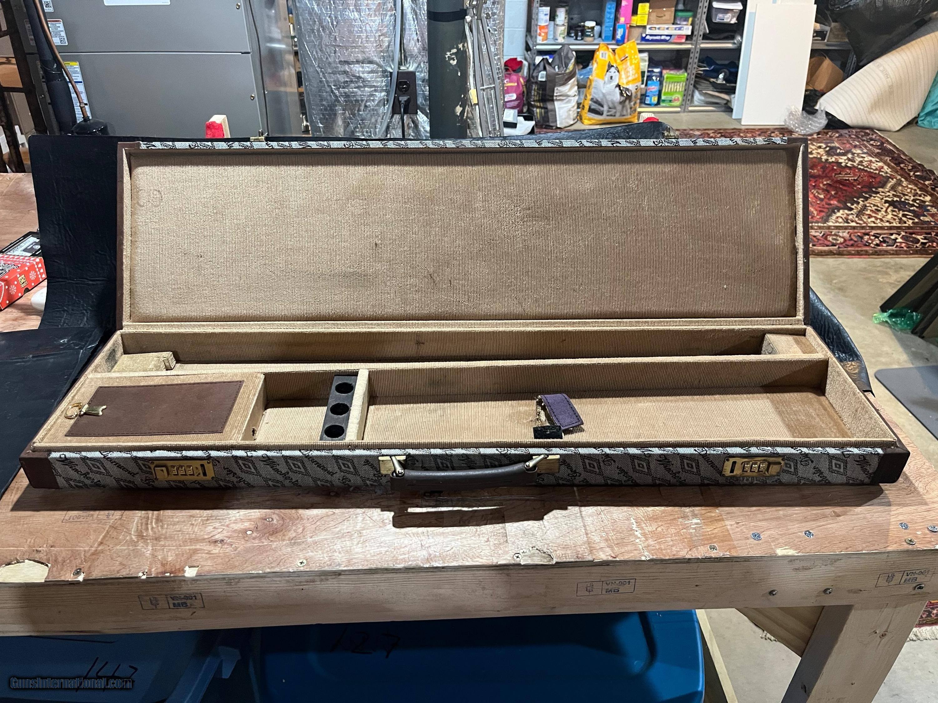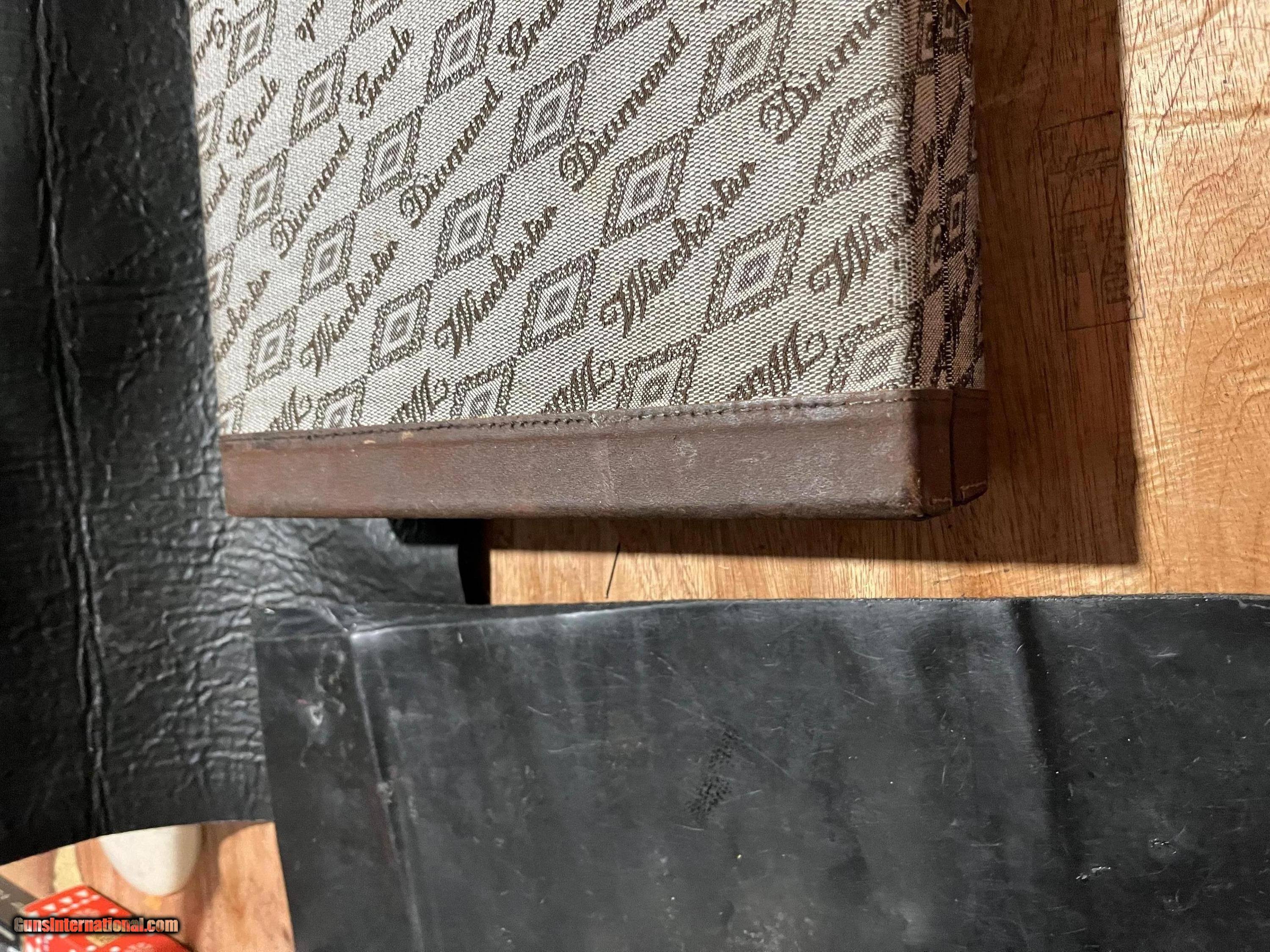 Description: Well used but solid Winchester Diamond Grade case. Combo locks work fine. Interior is intact. Handle is solid. Barrel channel is 34" long. 32" from front edge of glued in block at breech end. One removable block at muzzle end. Exterior shows slight abrasion and pale stain at right end (see photos). SOLD |