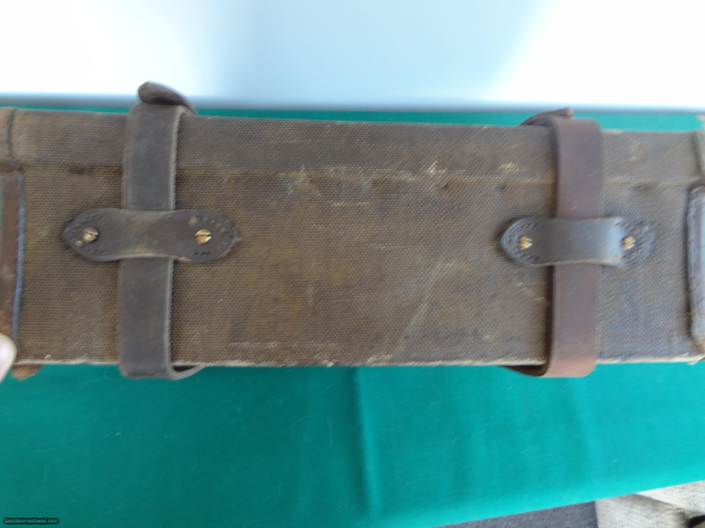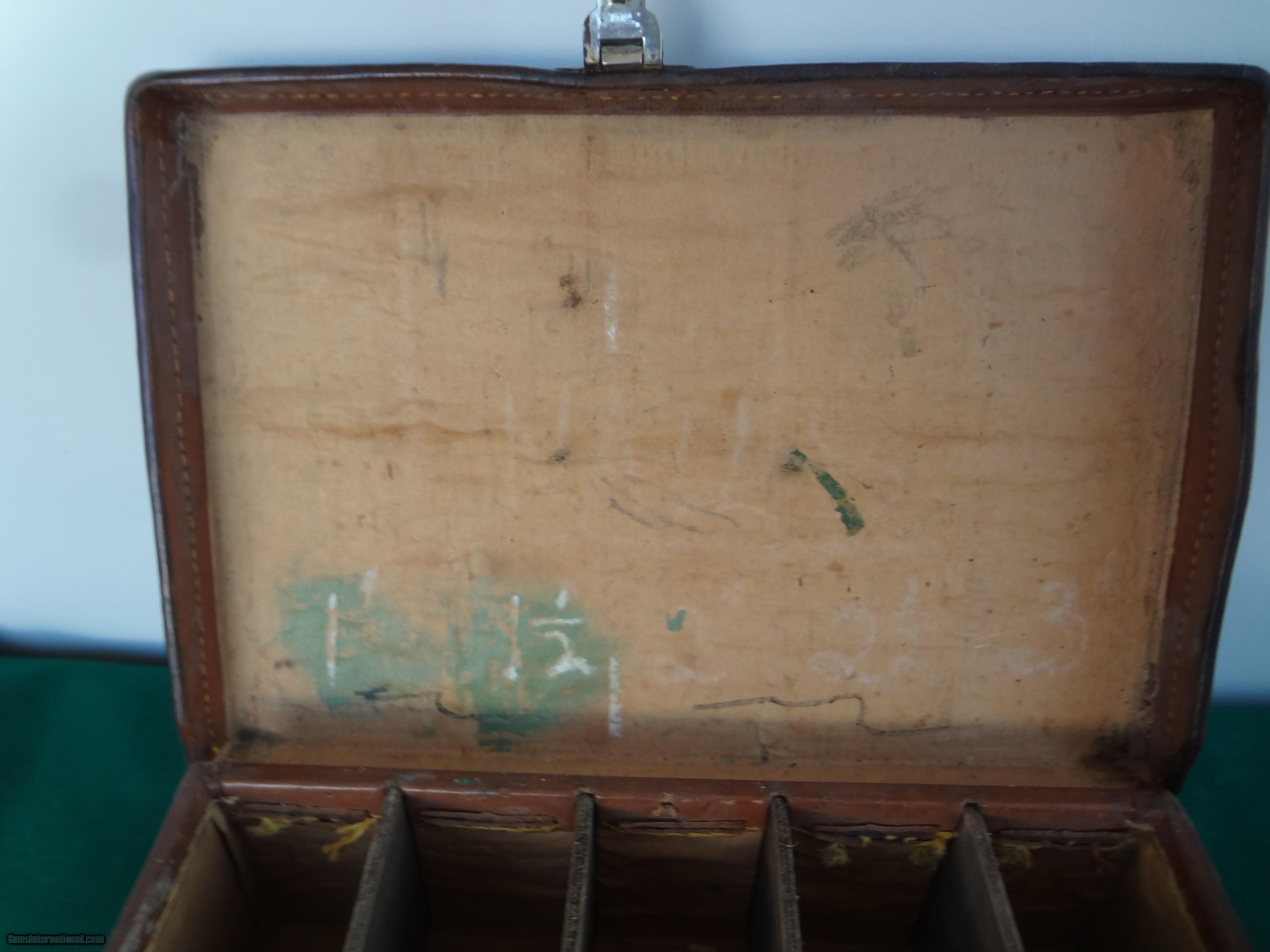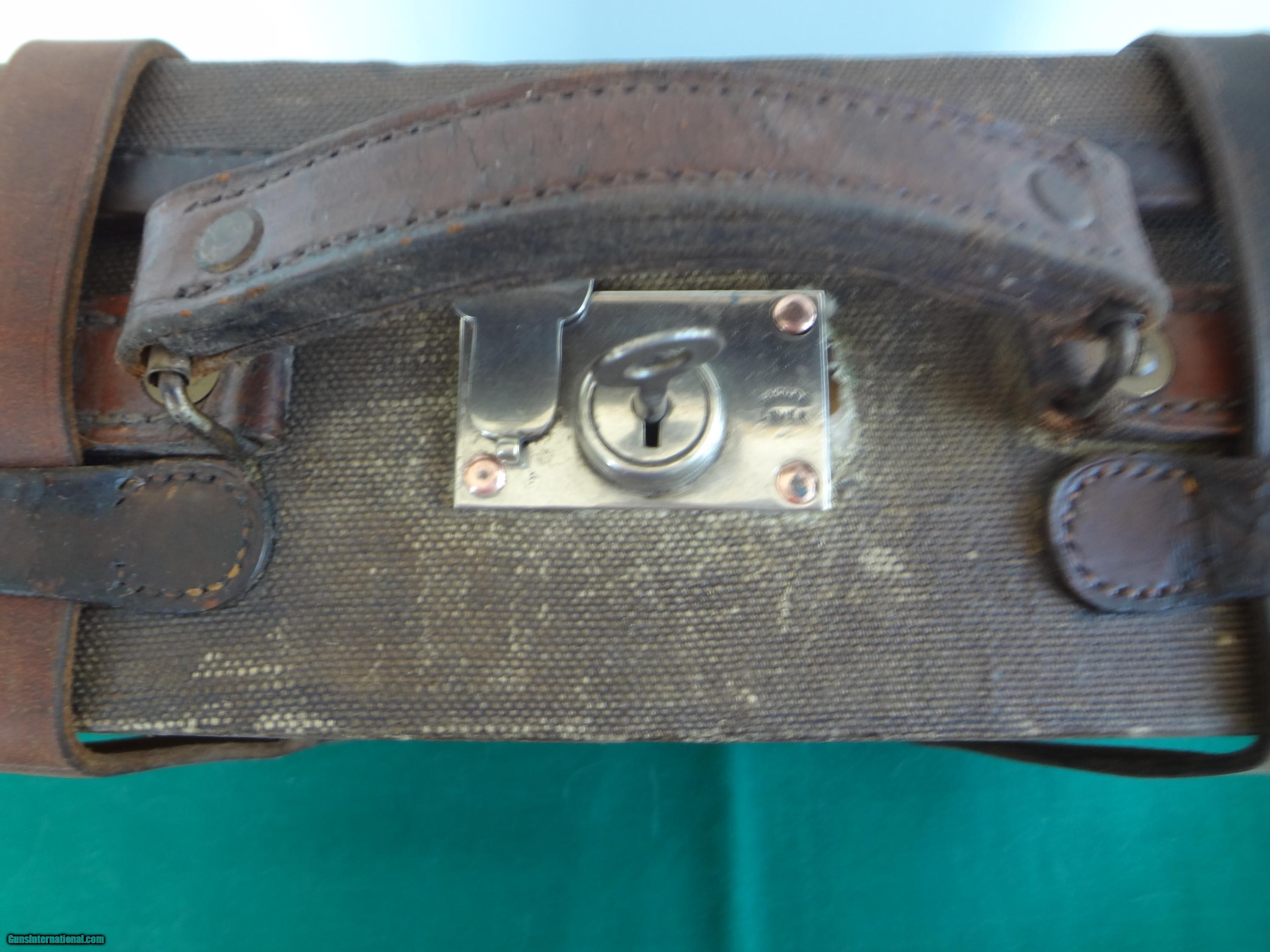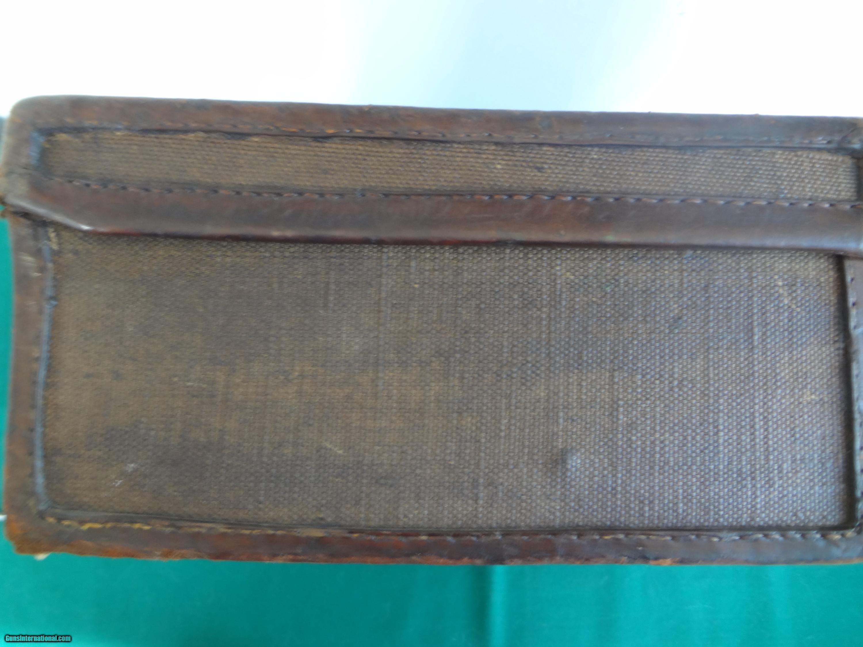 Description: Antique English 12 Bore Cartridge magazine for 250 shells. Canvas and leather over a very solid wood frame. Nicely working lock with key, strong leather handle and case straps. 5 compartments with removeable wood dividers. The interior is lined in tan canvas with some scuffs and marks. Please check out the photos as they do a better job of showing the condition than I can describe. The leather lifter straps have been removed. This case shows well and is very useable at your vintage shoots. Please call if you have any questions to 760 497 7836. Thanks for looking and good shooting! Raff SOLD |