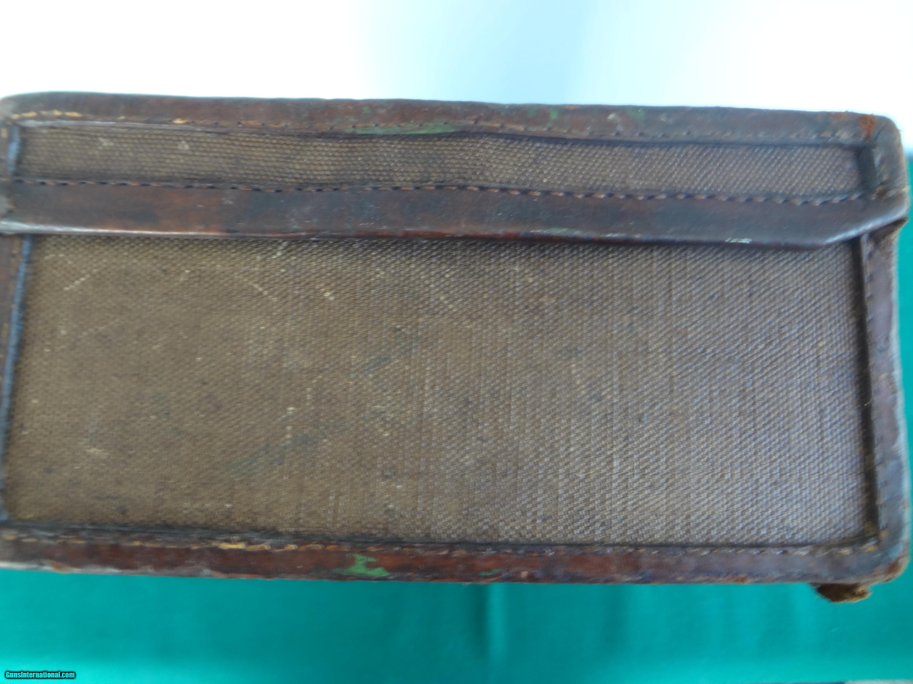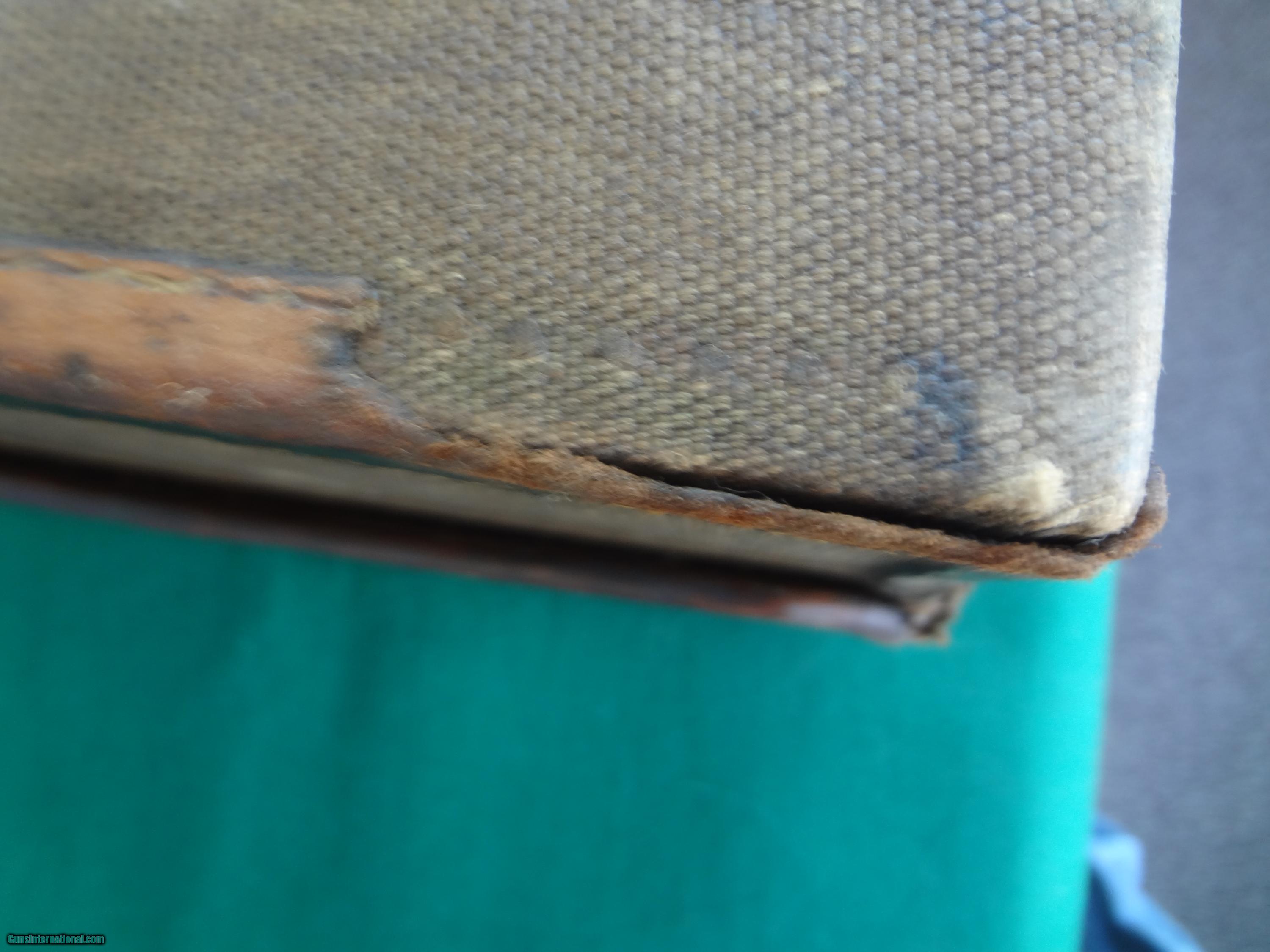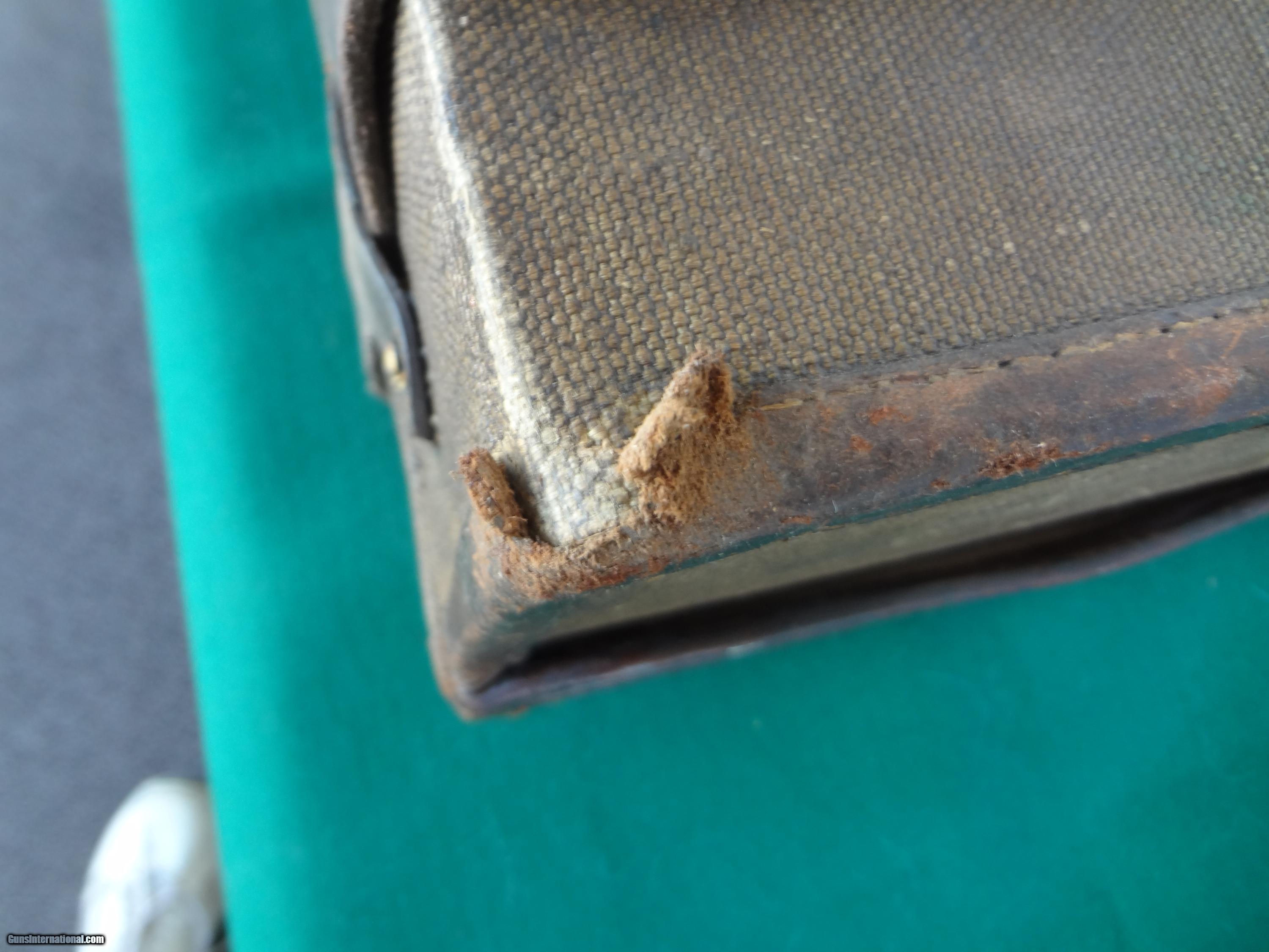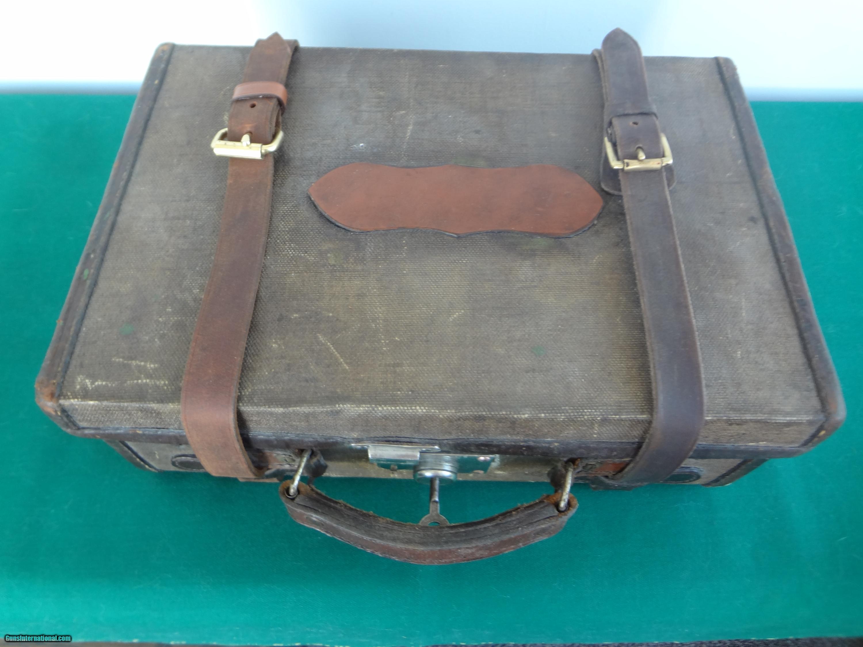 Description: Antique English 12 Bore Cartridge magazine for 250 shells. Canvas and leather over a very solid wood frame. Nicely working lock with key, strong leather handle and case straps. 5 compartments with removeable wood dividers. The interior is lined in tan canvas with some scuffs and marks. Please check out the photos as they do a better job of showing the condition than I can describe. The leather lifter straps have been removed. This case shows well and is very useable at your vintage shoots. Please call if you have any questions to 760 497 7836. Thanks for looking and good shooting! Raff SOLD |