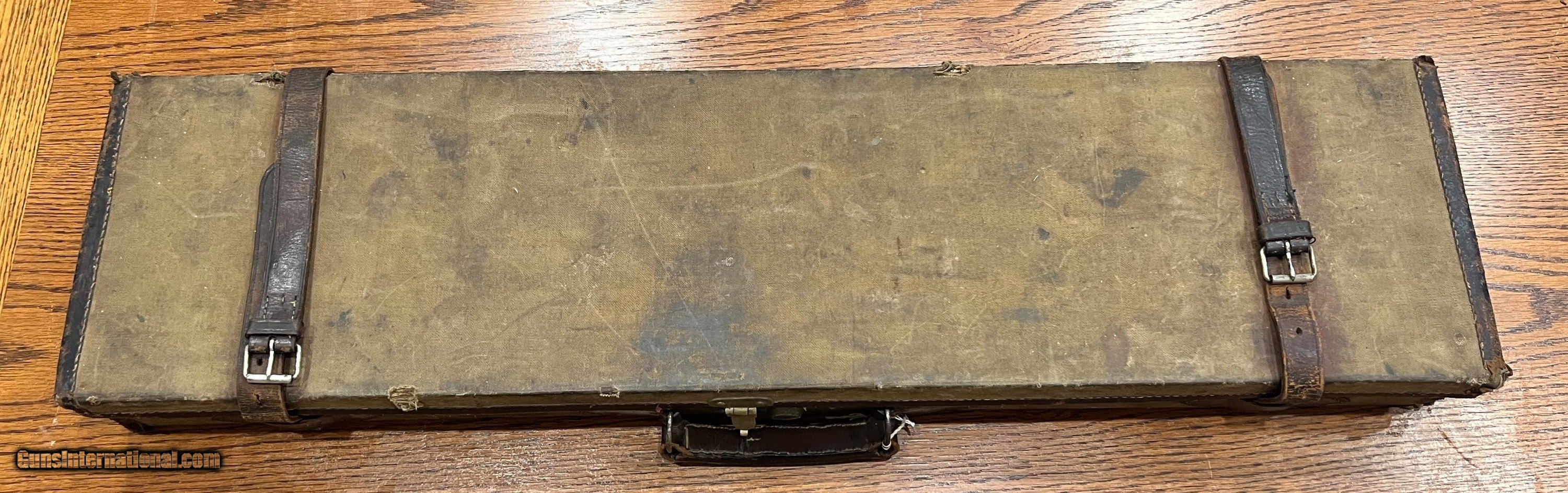 Description: English canvas & leather 12GA gun case Fits up to 32 1/2" barrels Will work with hammer or hammerless gun Good solid condition overall with minor wear, no key for the lock. SOLD Shotgun Gauge: 12 Gauge |