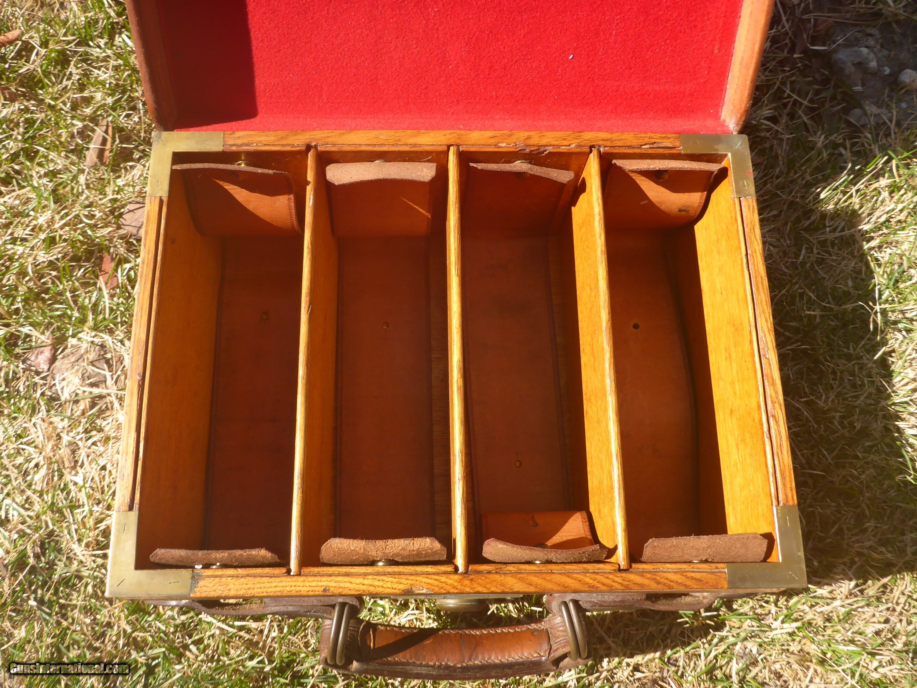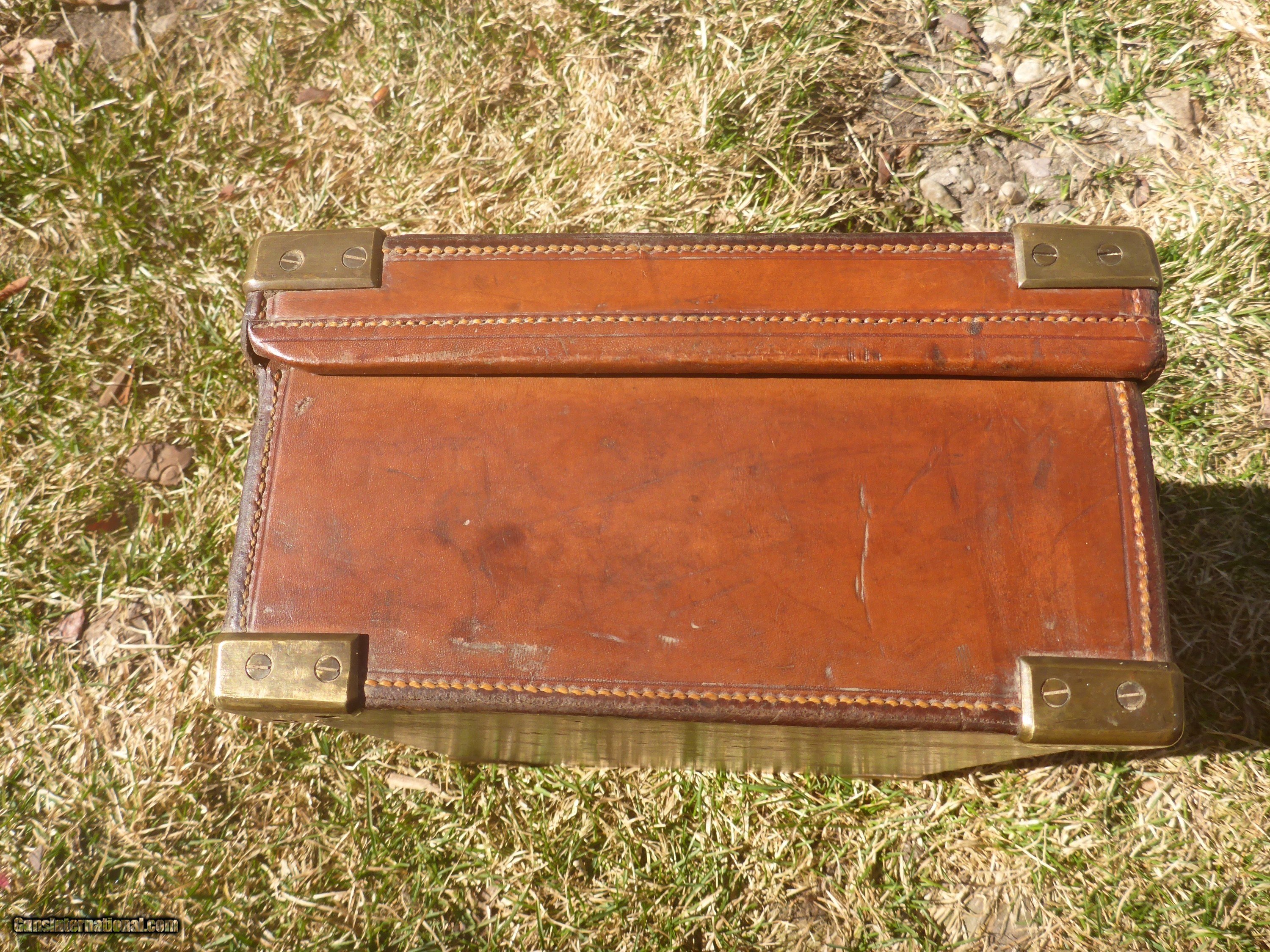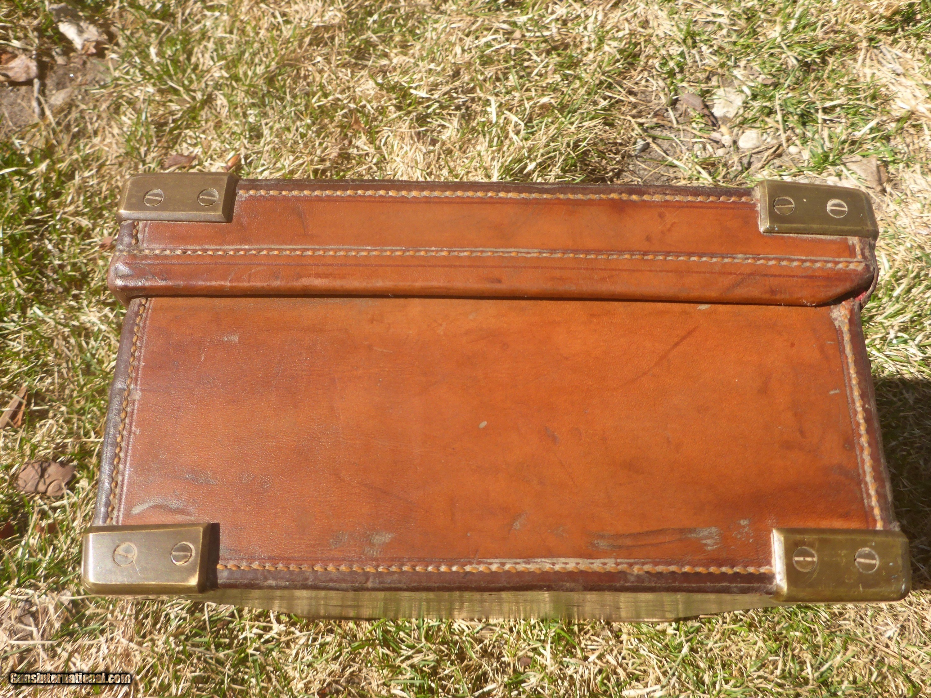 Description: SOLD PENDING FUNDS ......This very rare 200 round+ English Cartirdge Magazine is nearly 100 years old and in SPECTACULAR condition. This is rare because 4 compartment cases are rarely seen for sale ( there are 5 & 6 compartment cases and they are HEAVY when filled and not practical) This case could be in the finest condition you are ever likely to see.....the leather is not dried out , the edges aren't chewed up, no serious dents or tears ...overall excellent condition ! (unpolished brass should remain so ) Original interior straps and strong handle !! Exterior straps are slightly worn but still strong and servicable.Oak frame with only a few small rough areas as seen in photos. Original owner's name embossed on lid as nearly all were during that period. $600 plus $25 shipping.....don't let this one get away !! SOLD |