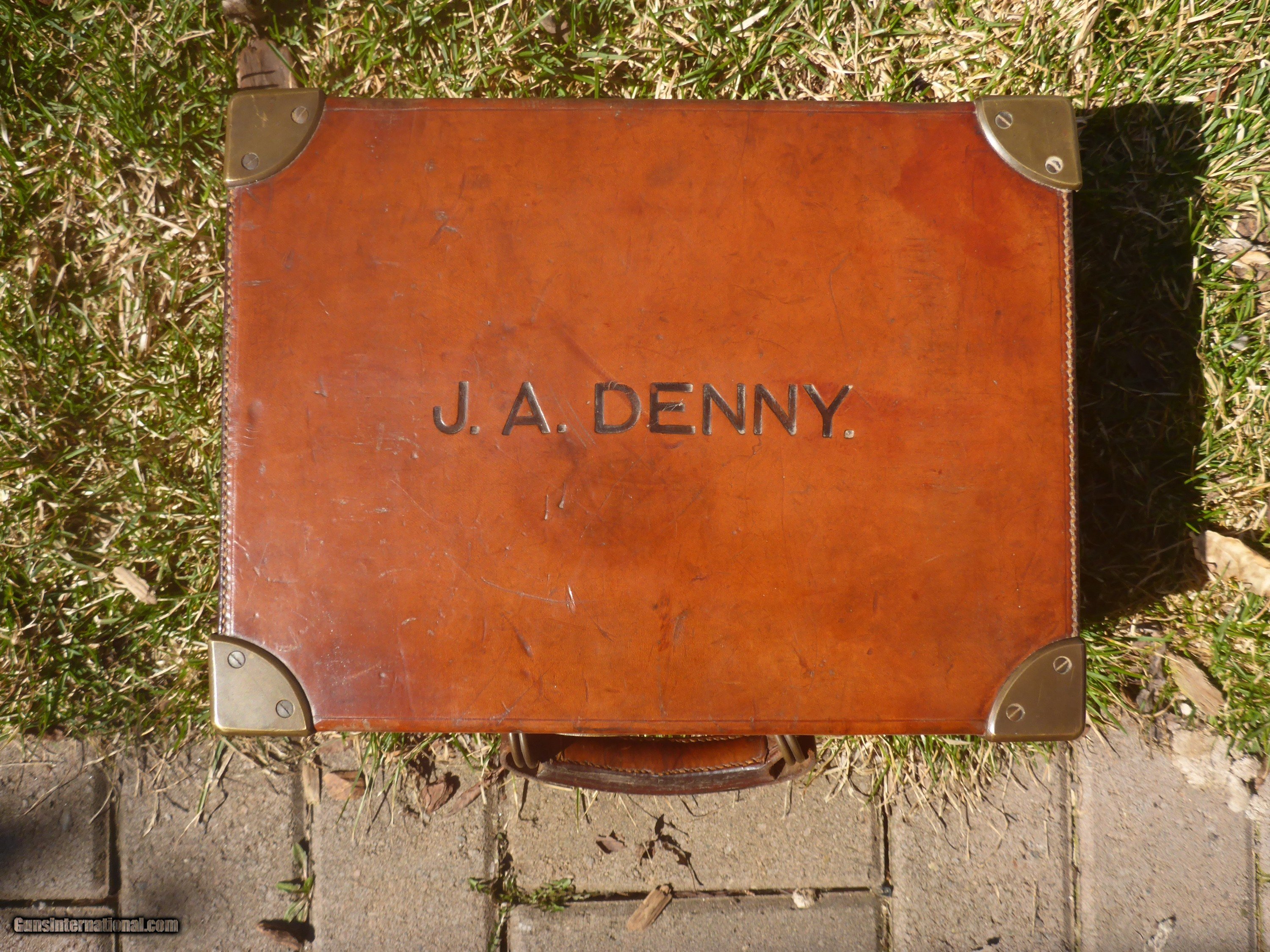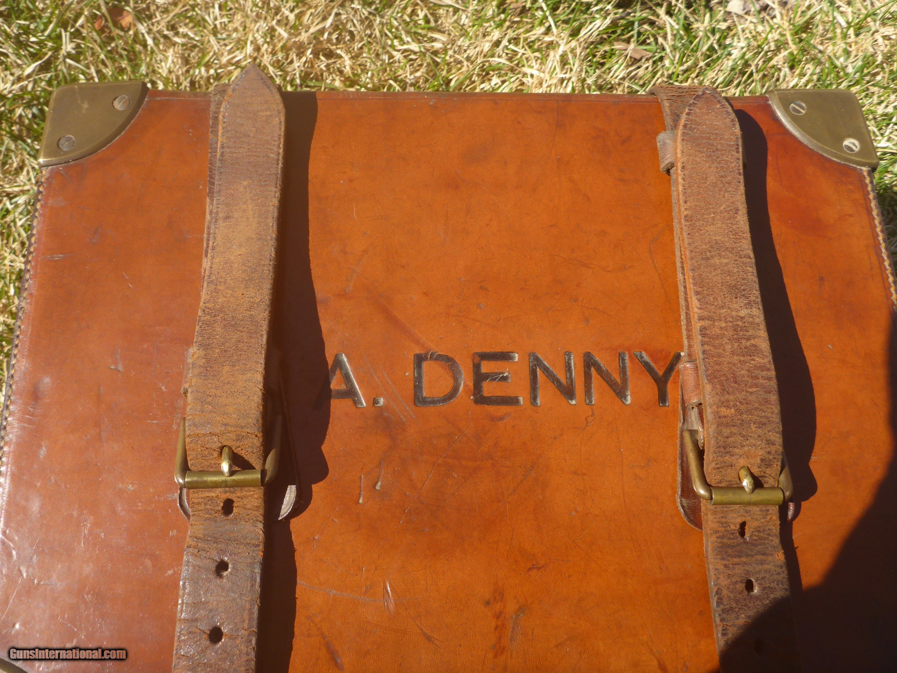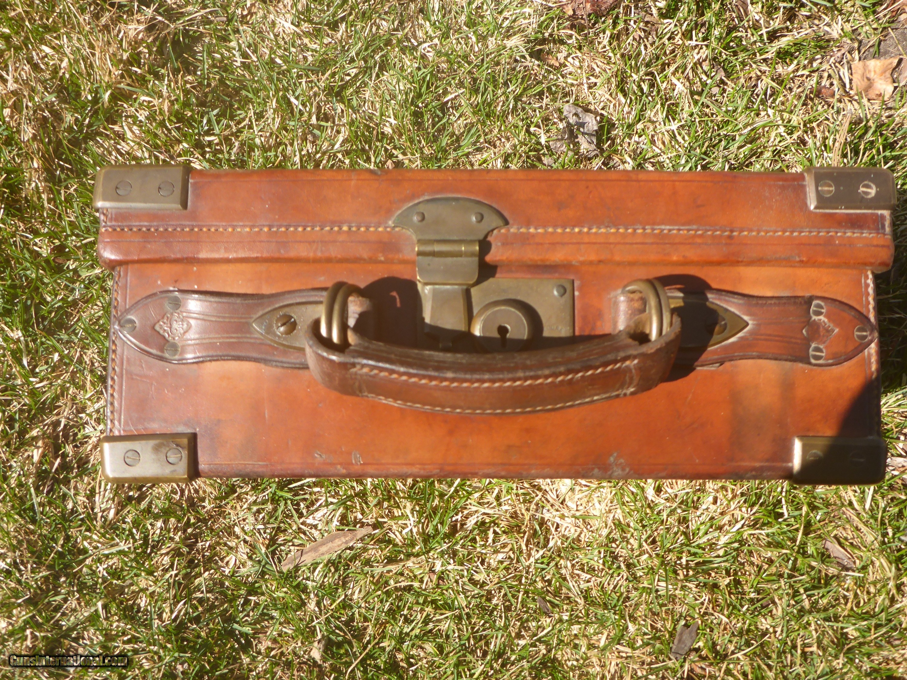 Description: SOLD PENDING FUNDS ......This very rare 200 round+ English Cartirdge Magazine is nearly 100 years old and in SPECTACULAR condition. This is rare because 4 compartment cases are rarely seen for sale ( there are 5 & 6 compartment cases and they are HEAVY when filled and not practical) This case could be in the finest condition you are ever likely to see.....the leather is not dried out , the edges aren't chewed up, no serious dents or tears ...overall excellent condition ! (unpolished brass should remain so ) Original interior straps and strong handle !! Exterior straps are slightly worn but still strong and servicable.Oak frame with only a few small rough areas as seen in photos. Original owner's name embossed on lid as nearly all were during that period. $600 plus $25 shipping.....don't let this one get away !! SOLD |