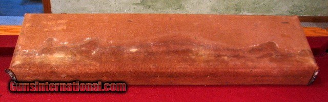Description: English case with W. J. Jeffery trade label. Will accomadate 16 or 20 gauge barrels to 26 inches. Canvas outside shows staining and also shows corner wear but still a very servicable case. No key. Two piece cleaning rod, mop, and brush included. SOLD |