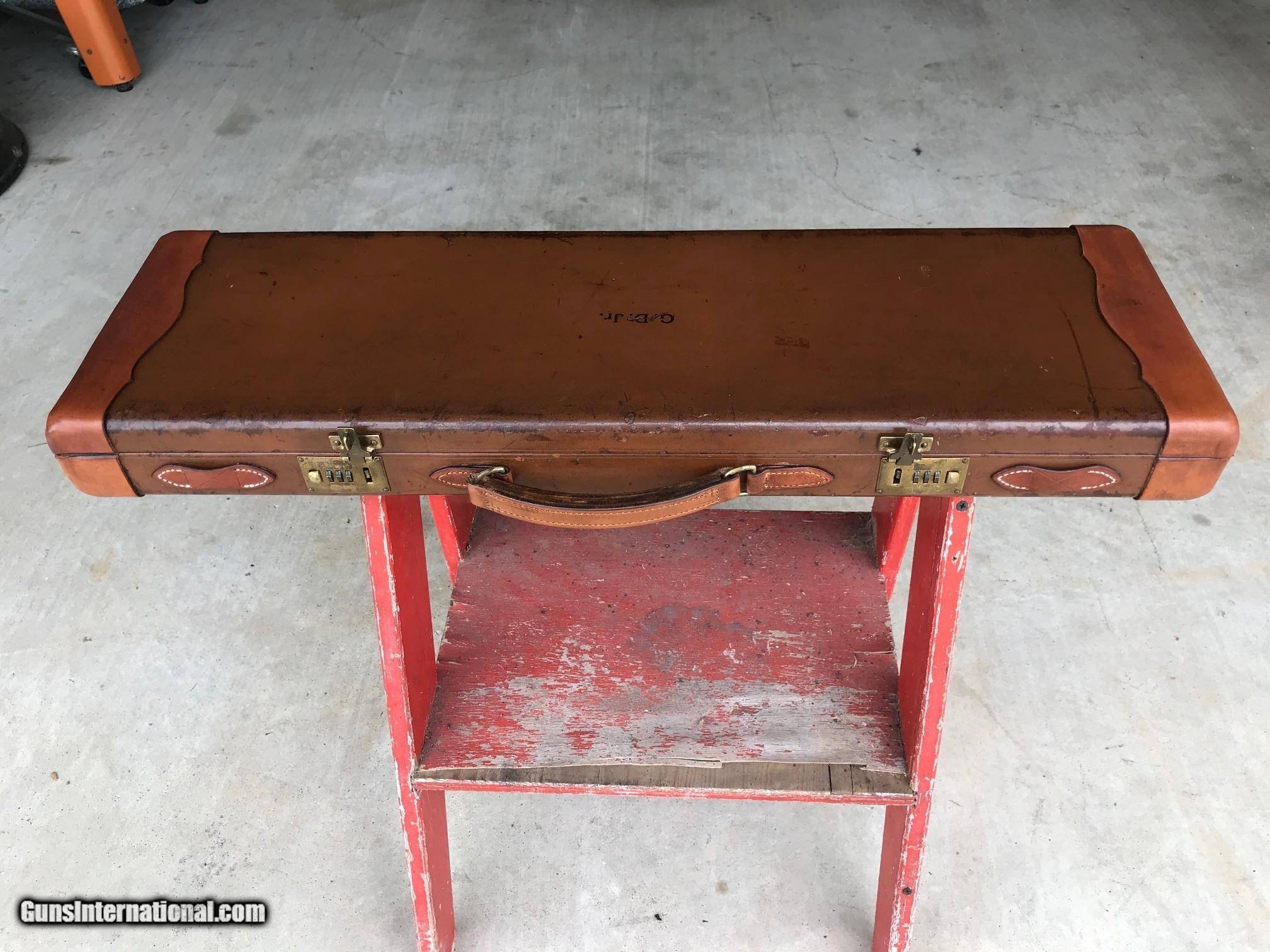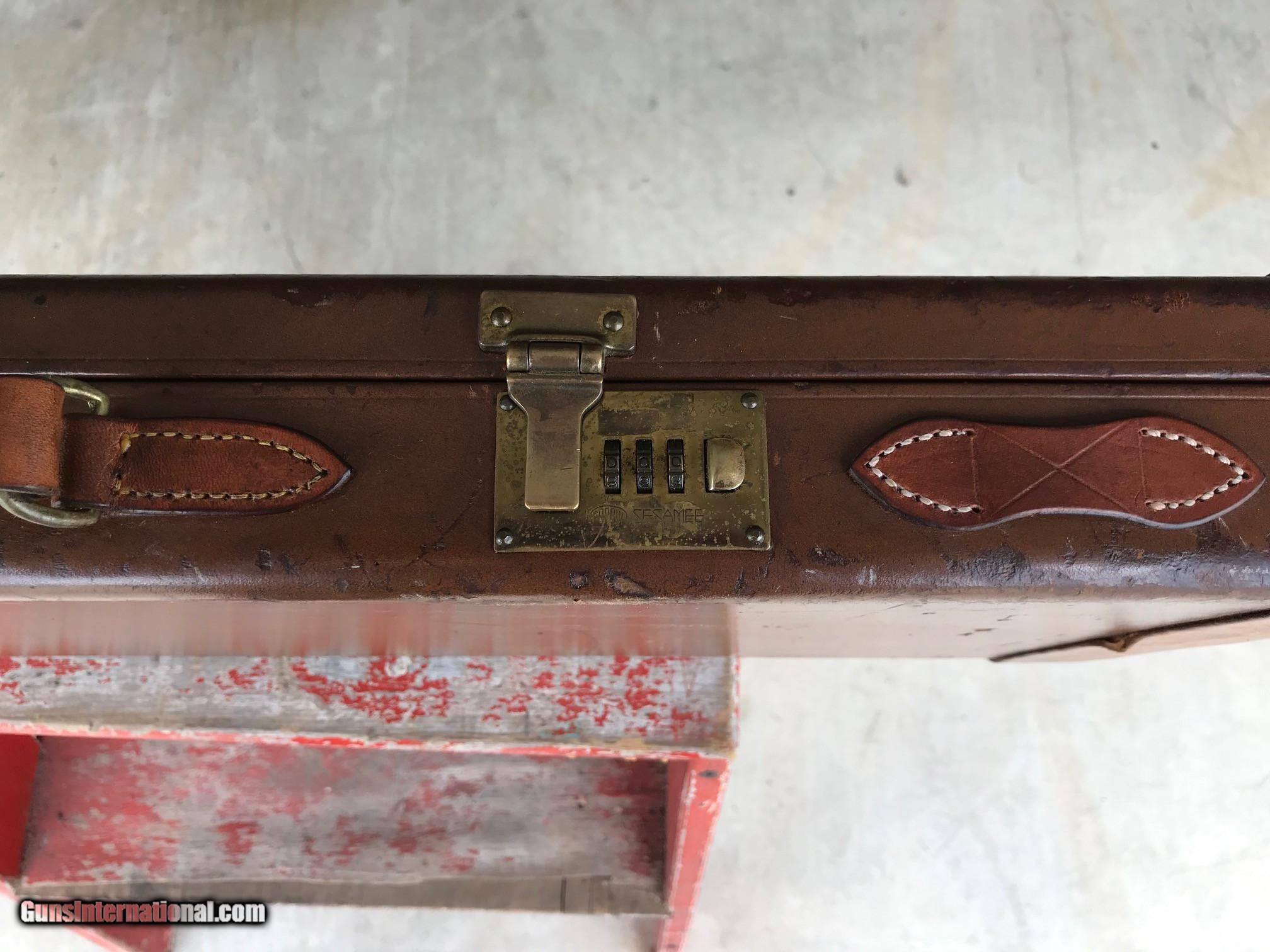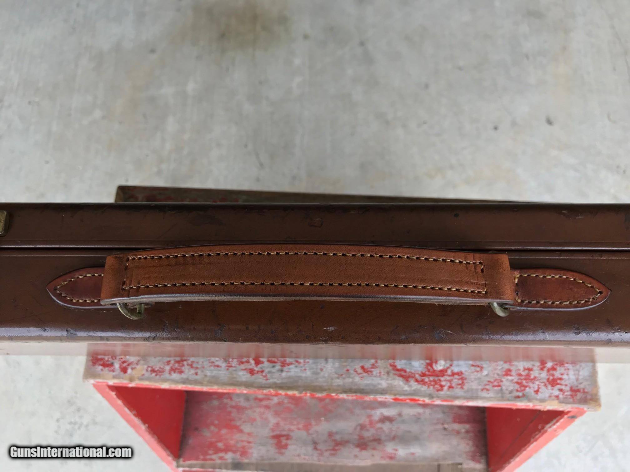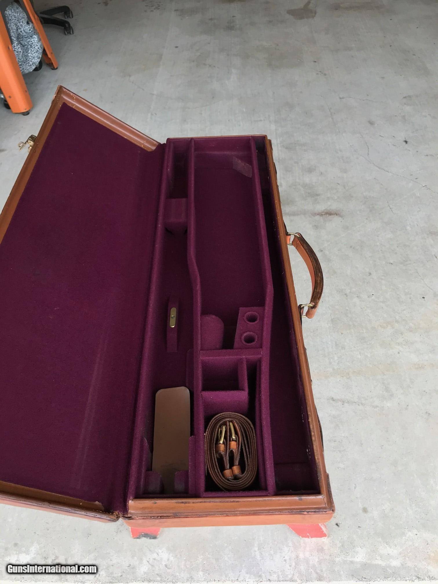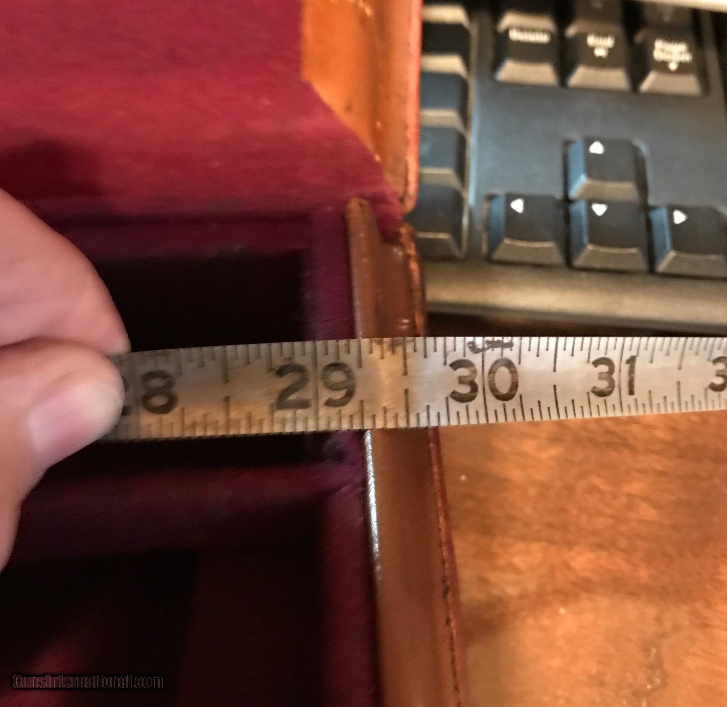 Description: SOLD PENDING FUNDS Nice Vintage English made leather 2 barrel case 20 Ga Snap Cap holes Will hold two 28" barrels plus the rib extension - Total 28 5/8" with the two end blocks in place. With the two end blocks removed you have 29 1/4" Outside Dimensions 30" x 9" x 3" Very solid case with nice interior A 16 Ga barrel will lay flat in the top barrel channel but it is a snug fit. Free Shipping Included in Buy Now Price SOLD |