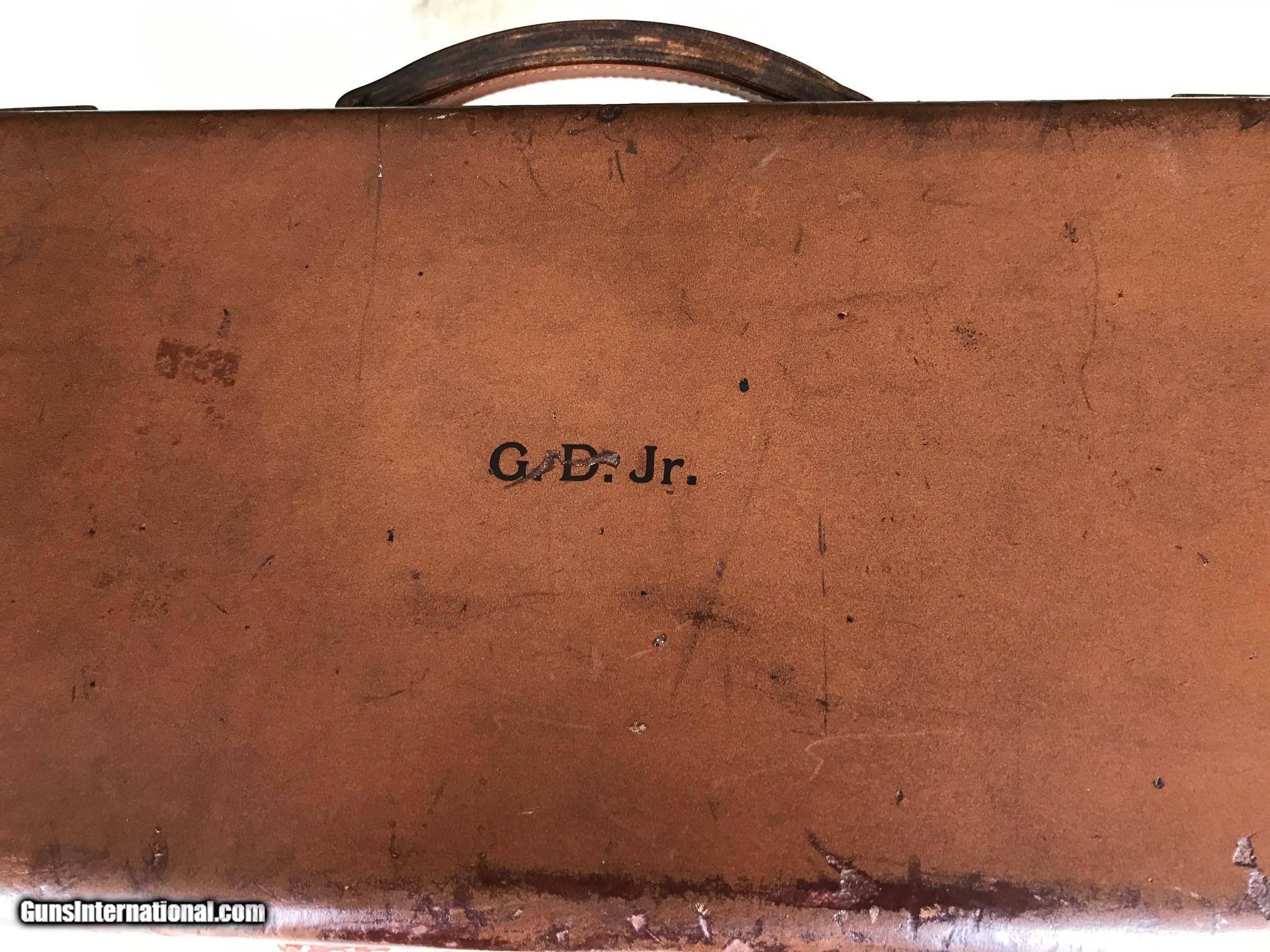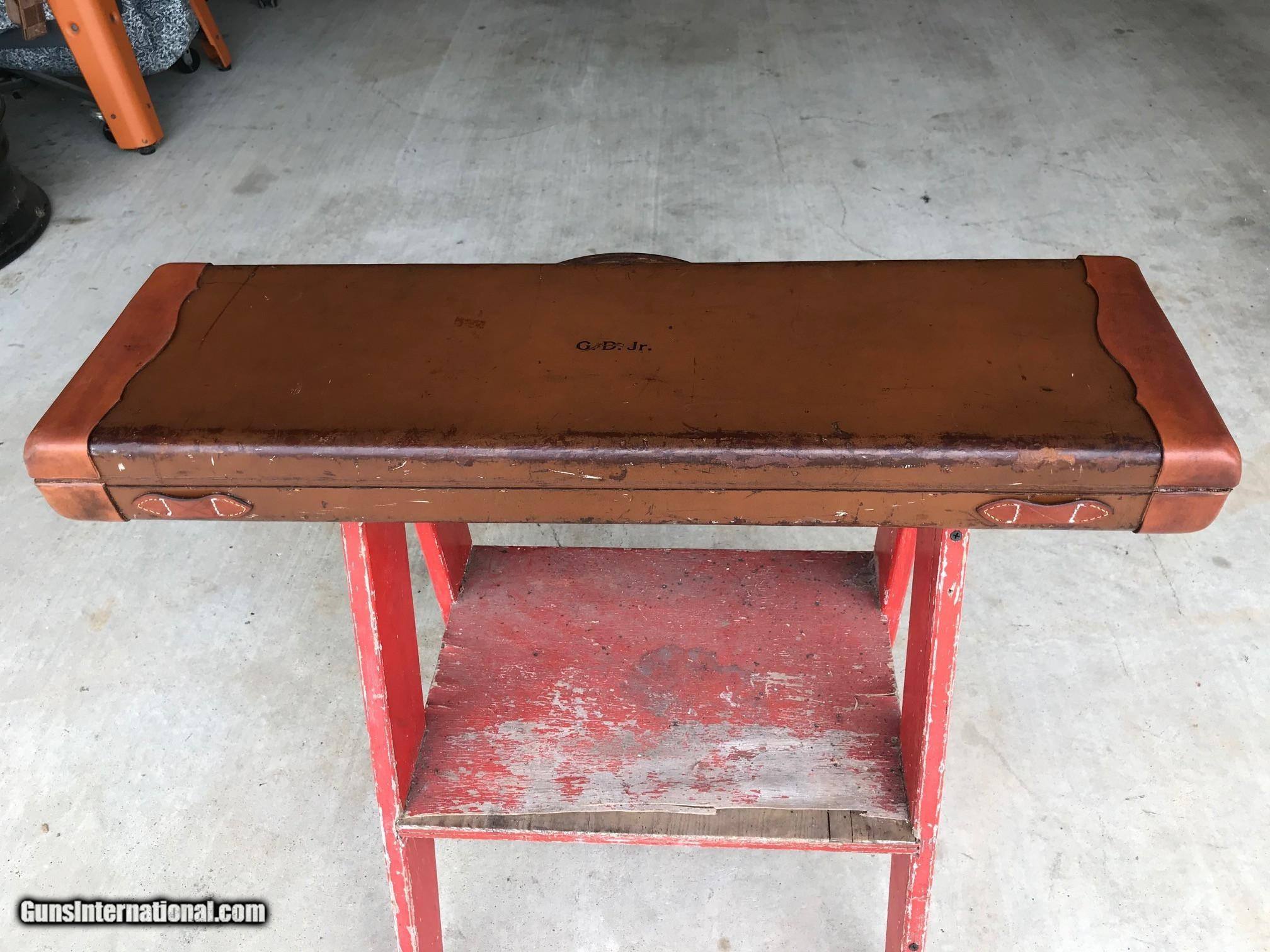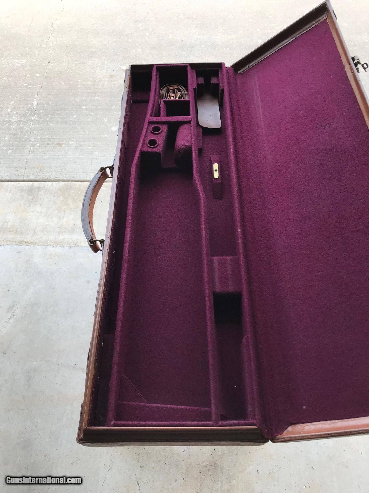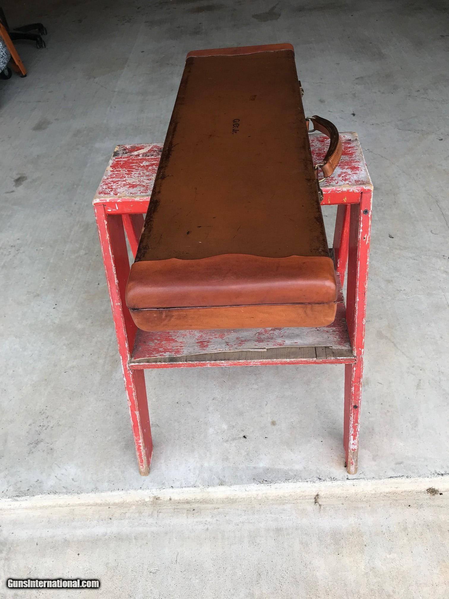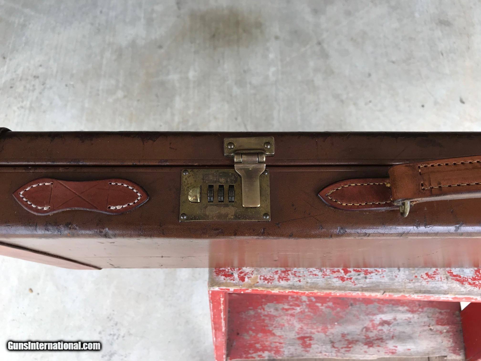 Description: SOLD PENDING FUNDS Nice Vintage English made leather 2 barrel case 20 Ga Snap Cap holes Will hold two 28" barrels plus the rib extension - Total 28 5/8" with the two end blocks in place. With the two end blocks removed you have 29 1/4" Outside Dimensions 30" x 9" x 3" Very solid case with nice interior A 16 Ga barrel will lay flat in the top barrel channel but it is a snug fit. Free Shipping Included in Buy Now Price SOLD |