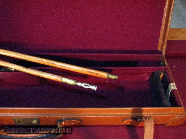 Description: English shotgun case for the 12 or 20 gauge with barrels up to 27 1/2". Shows moderate wear. Stitching on corners has come loose and they have been glued on. One strap repaired. Not pristine but very servicable overall condition. Cleaning rod and oil bottle included. SOLD |