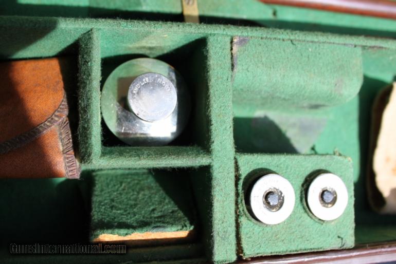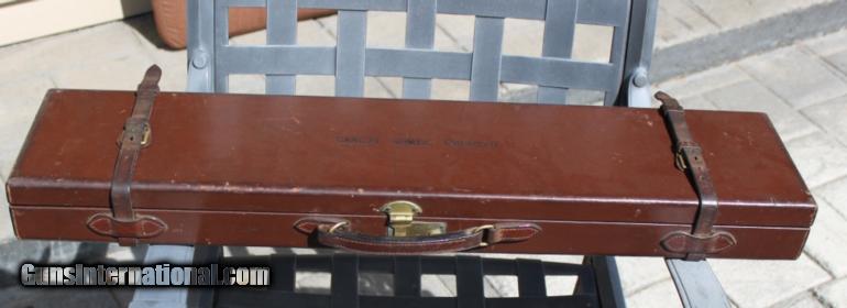 Description: SOLD!!! Holland & Holland original toe-under leather case with accessories. Set up for a SxS gun with 30" barrels. Snap caps, Oil bottle, Cleaning rod, and canvas socks are included. Original labels for gun 33738. A very fine case! Sale price includes shipping in the Cont. US. Please see my other items for more vintage cases. SOLD |