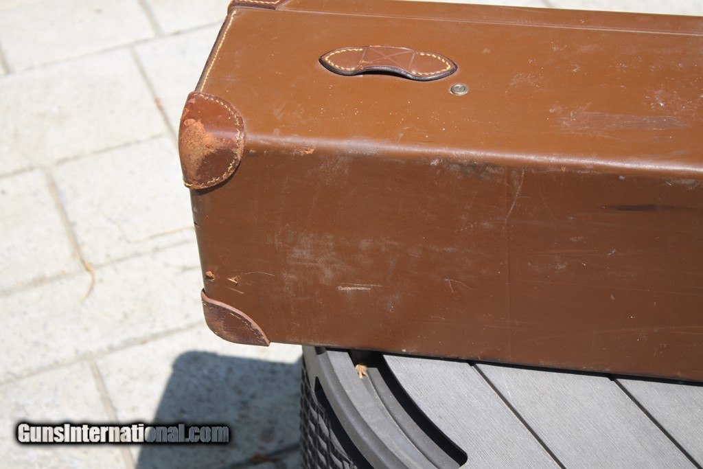 Description: Original Purdey 3 gun English leather motor case in very good condition. Set up for 28" barrels with storage under the barrel slots. Exterior shows some wear. All stitching is excellent. Purdey will make you one up today for about £3500. Please see pictures for accurate condition and description SOLD |