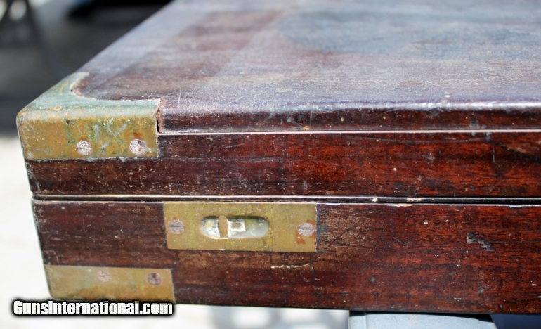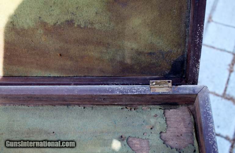 Description: SOLD!! Here is nice original solid Mahogany shotgun case with brass corners that is ready for restoration. The outside measures 34 3/8” x 10” x 3” and internal dimensions are 33.25” x 8.75" x 2.25". A good quality sporting gun case with brass corners. It will need new rear hinges and a complete refitting on the inside. The center handle on the top is intact but the stationary piece is missing. The finger latches on the front are in good working order. Great project case for your English gun! Please see pictures for accurate description and condition. Sale price includes FREE shipping in the Cont. US. Please see my other listings for more vintage cases. SOLD |
