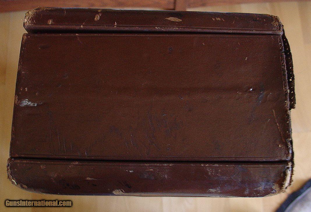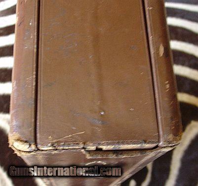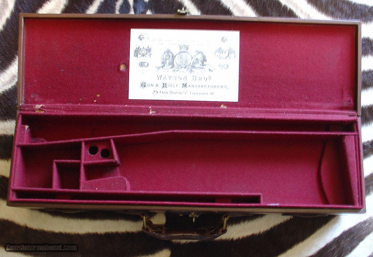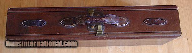 Description: Watson Bros 2 Gun Case for a pair of 25 inch guns. Interior is in very good usable condition. Locks work. Exterior has one corner with loose leather. Handle is strong. Straps are in case. One strap loop is loose. Lables are excellent. Nice case just to adorne your gun room. Priced at: $250.00 plus $25.00 ground shipping. SOLD |
