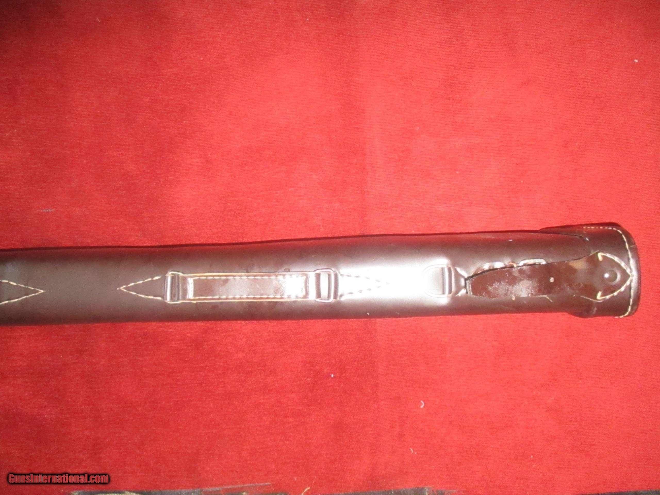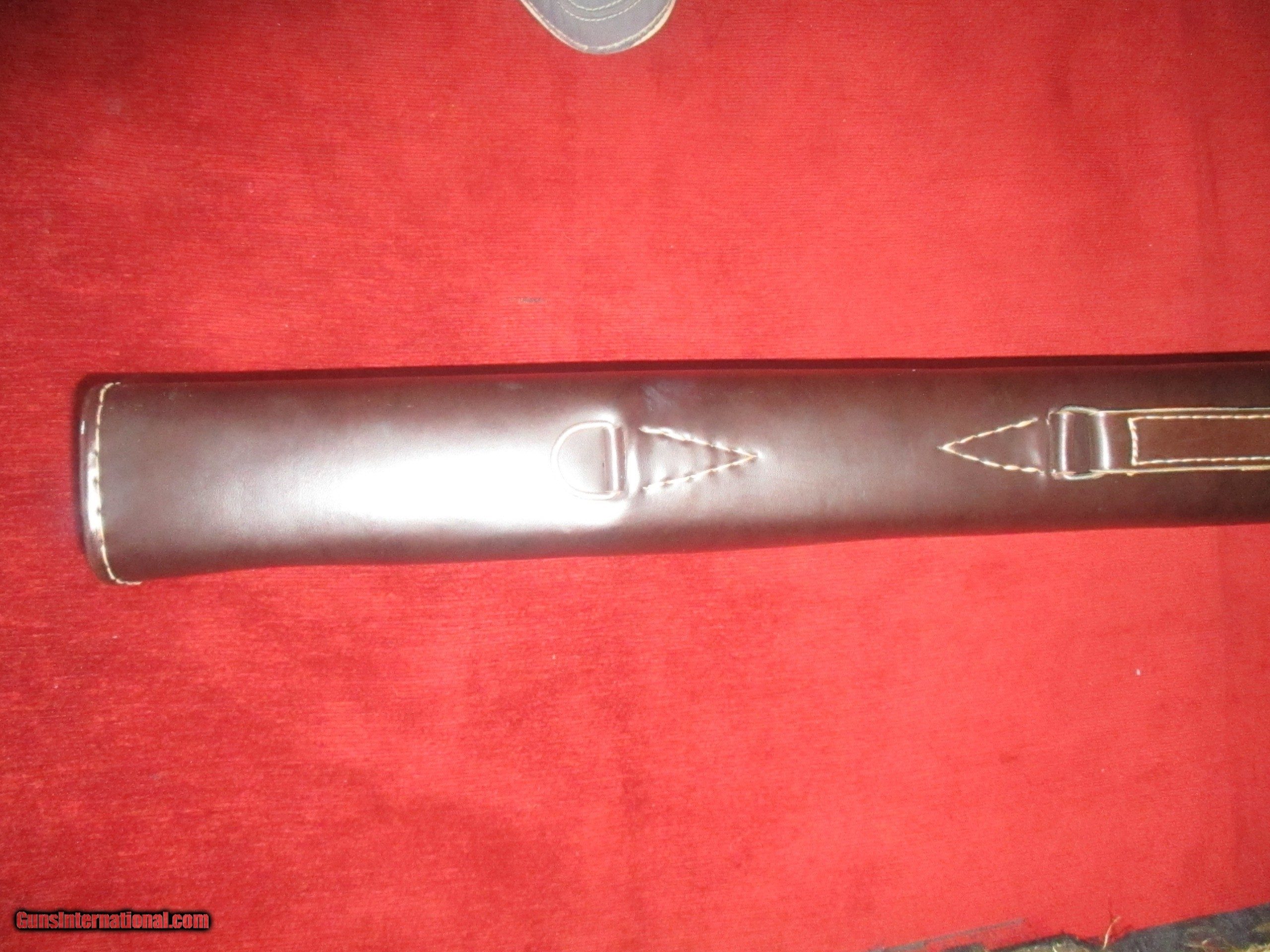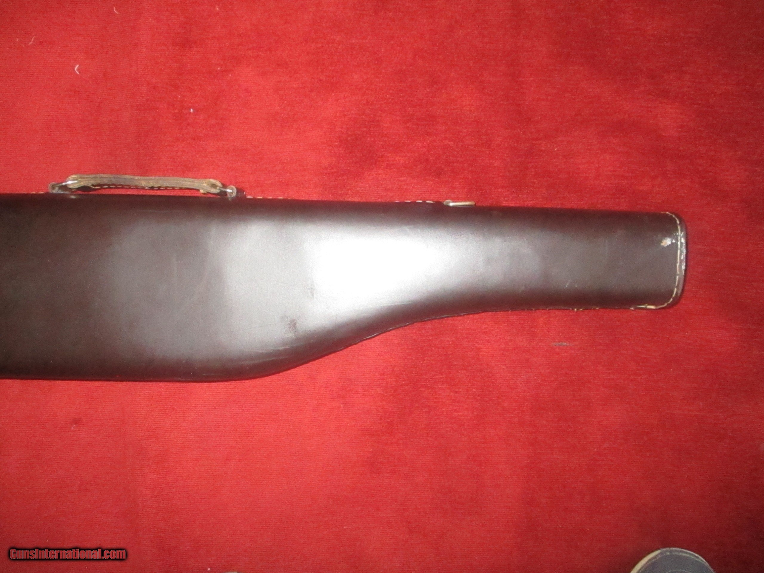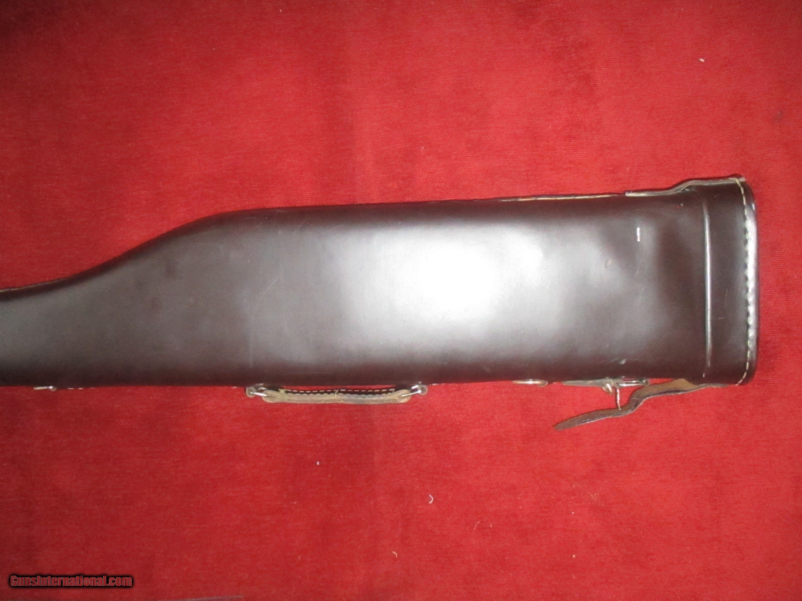 Description: dark brown walnut case, fleese lined for finish safety, accomadates to 28" bbls., carry handle needs leather or canvas shoulder strap probably one in closet, as new condition SOLD |