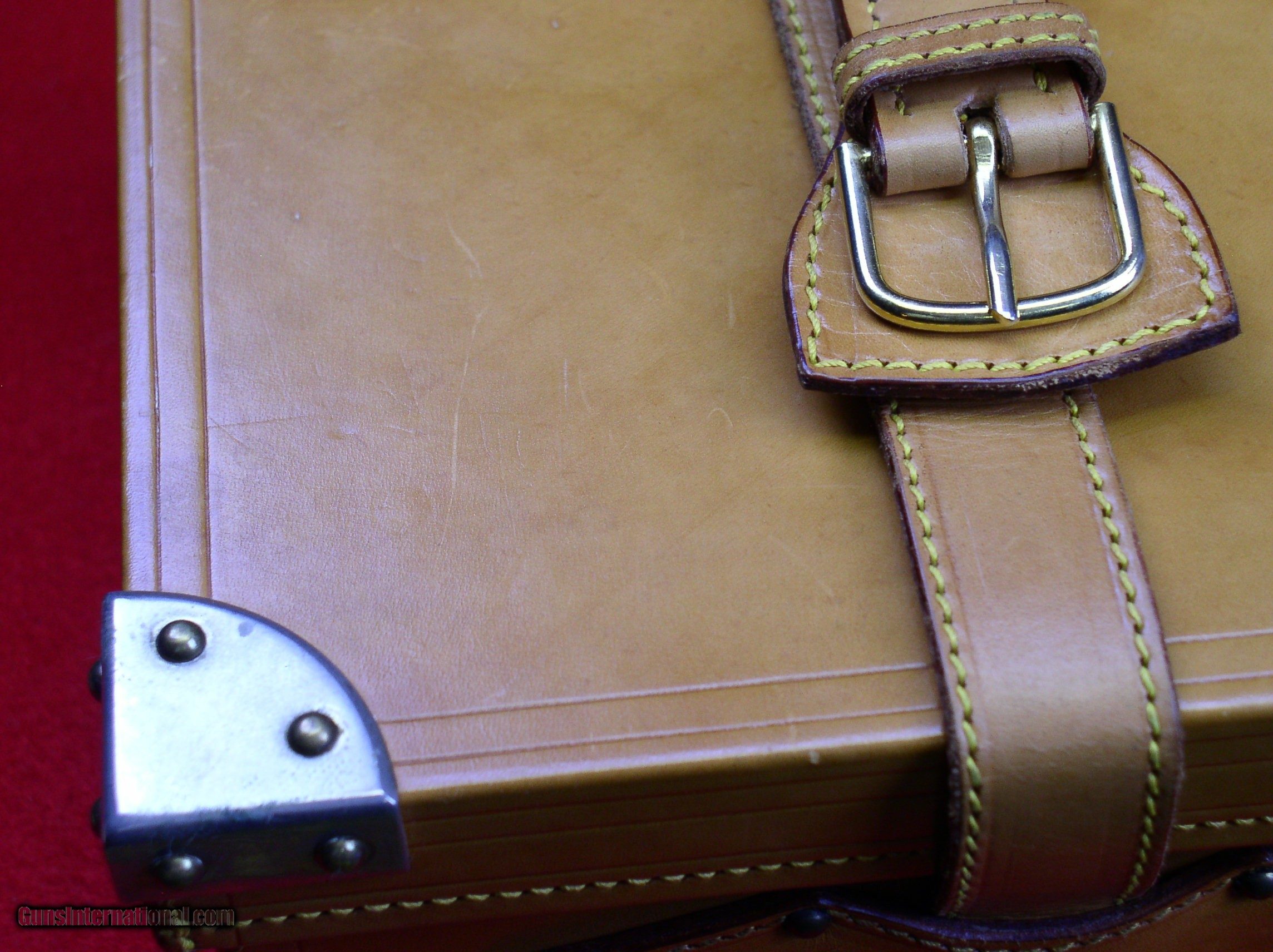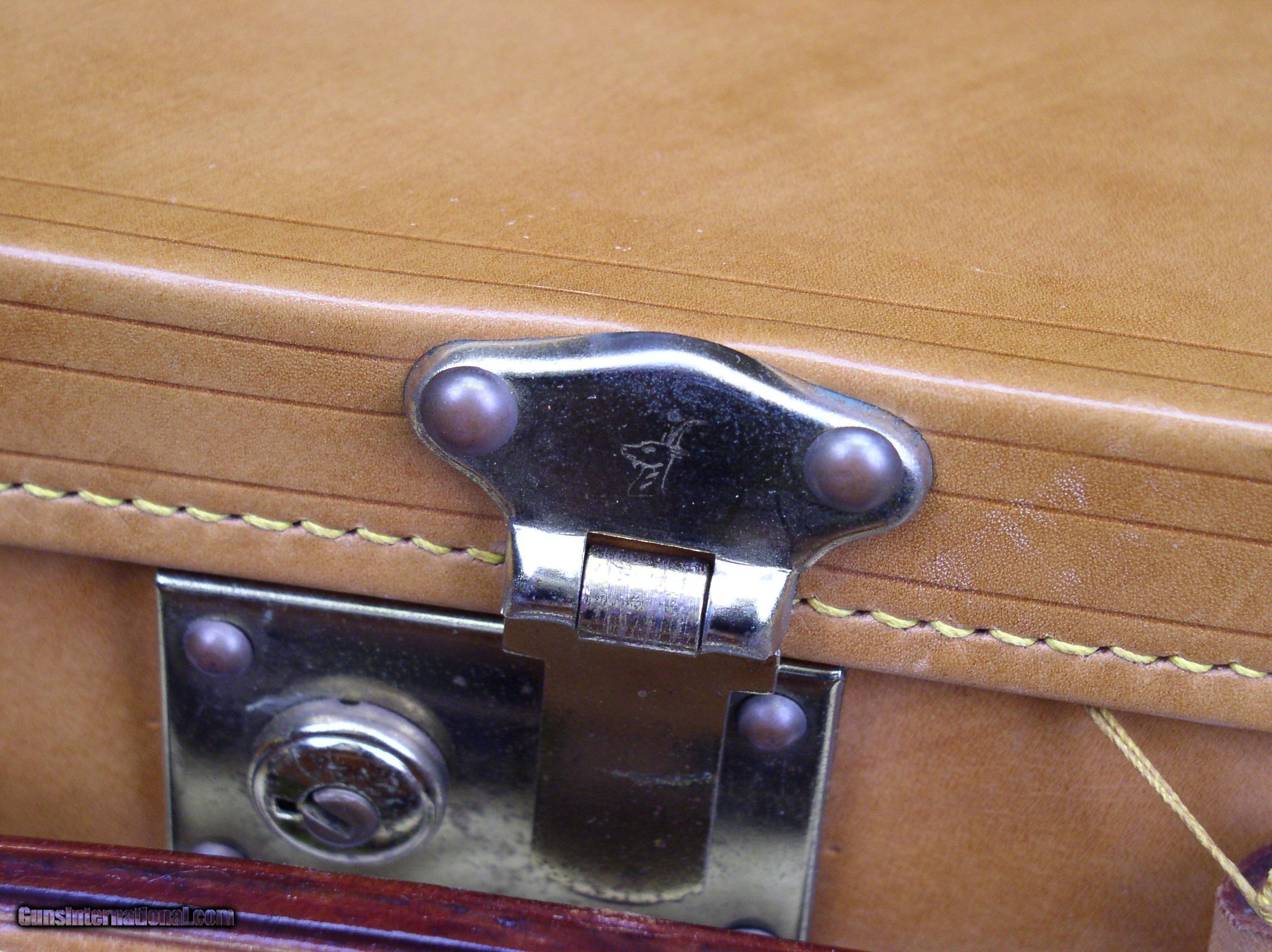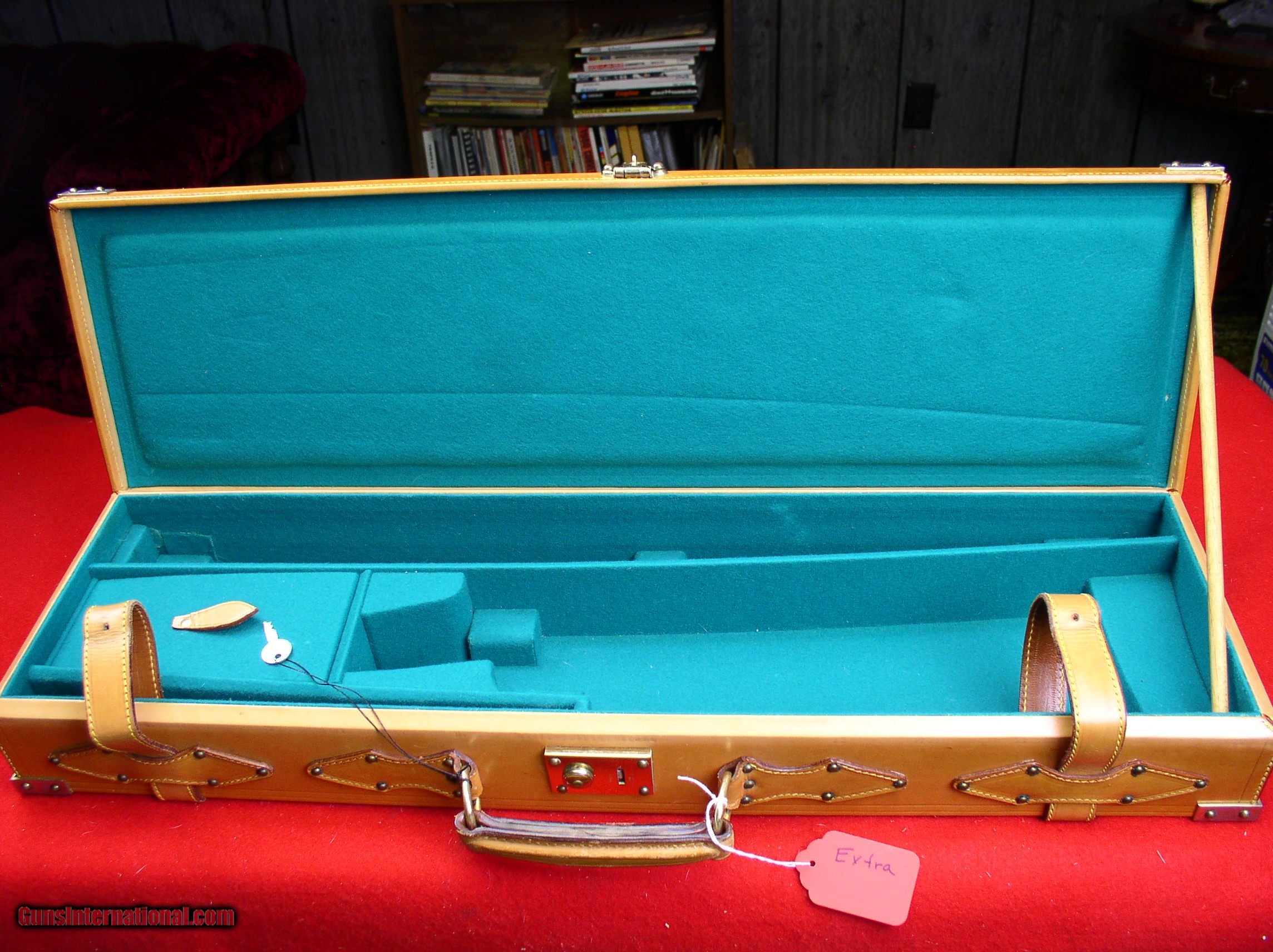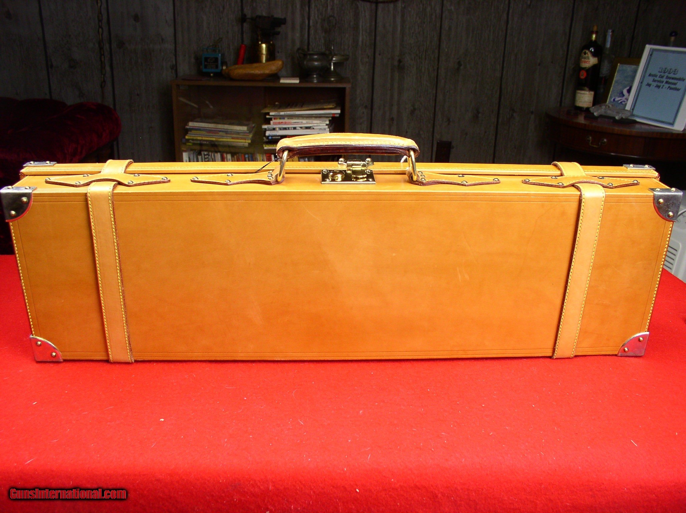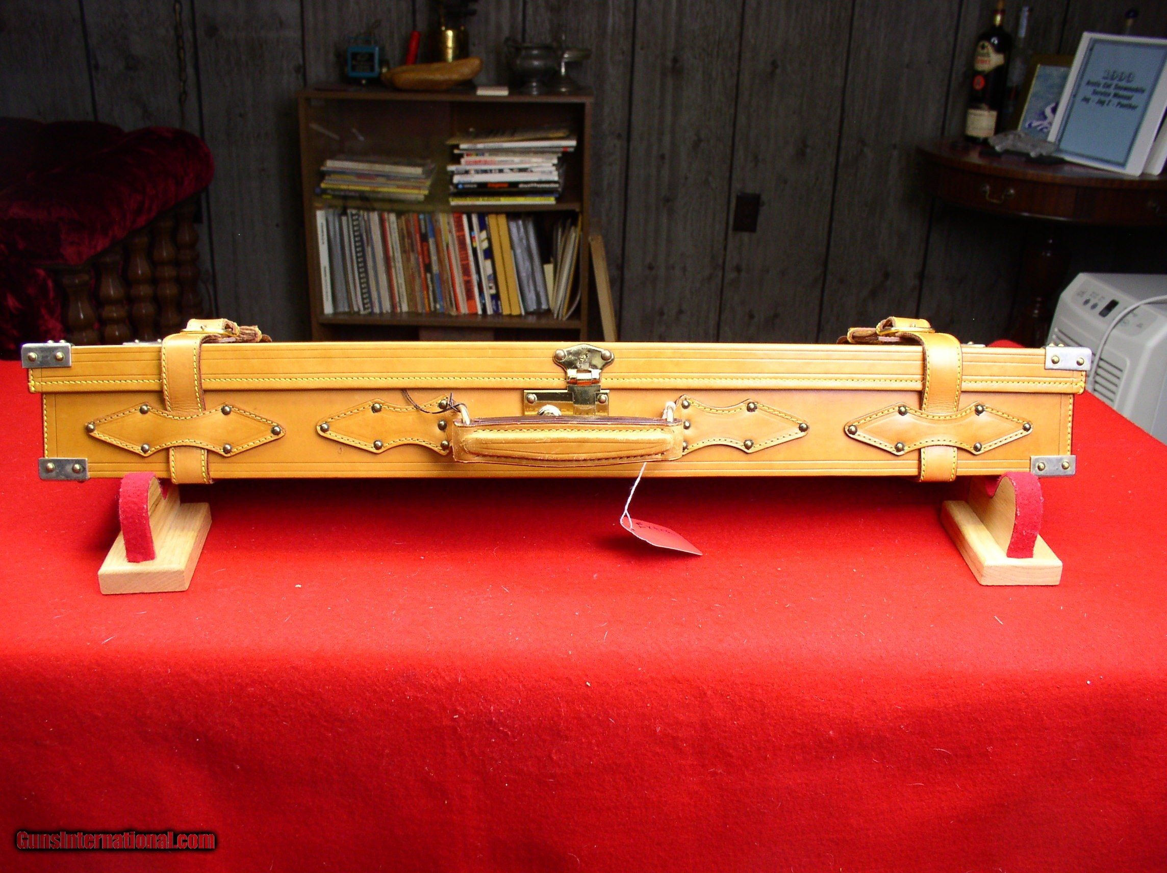 Description: HIGH QUALITY SPANISH ALL LEATHER TAKEDOWN CASE WITH LEATHER STRAPS AND "BRASS" CORNERS MANUFACTURER - F. ESPOSITO. WILL HANDLE SINGLE SET OF BARRELS TO 29". MEASURES 30 1/2" X 9" X 4" EXCELLENT USED CONDITION. INTERIOR COLOR IS THE GREEN FELT SEEN IN THE LAST PICTURE. FOR SOME REASON THE CAMERA WAS BEING COLOR FOOLED IN THE OTHER TWO (2) INTERIOR PICTURES. $425 PLUS ACTUAL SHIPPING SOLD |