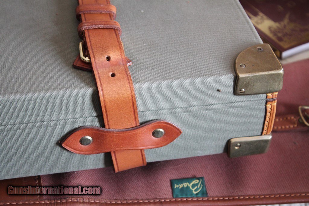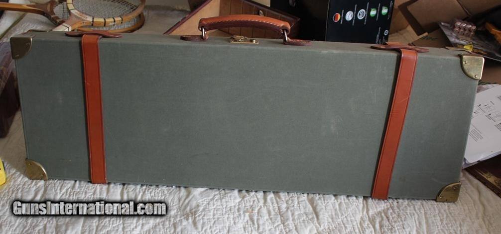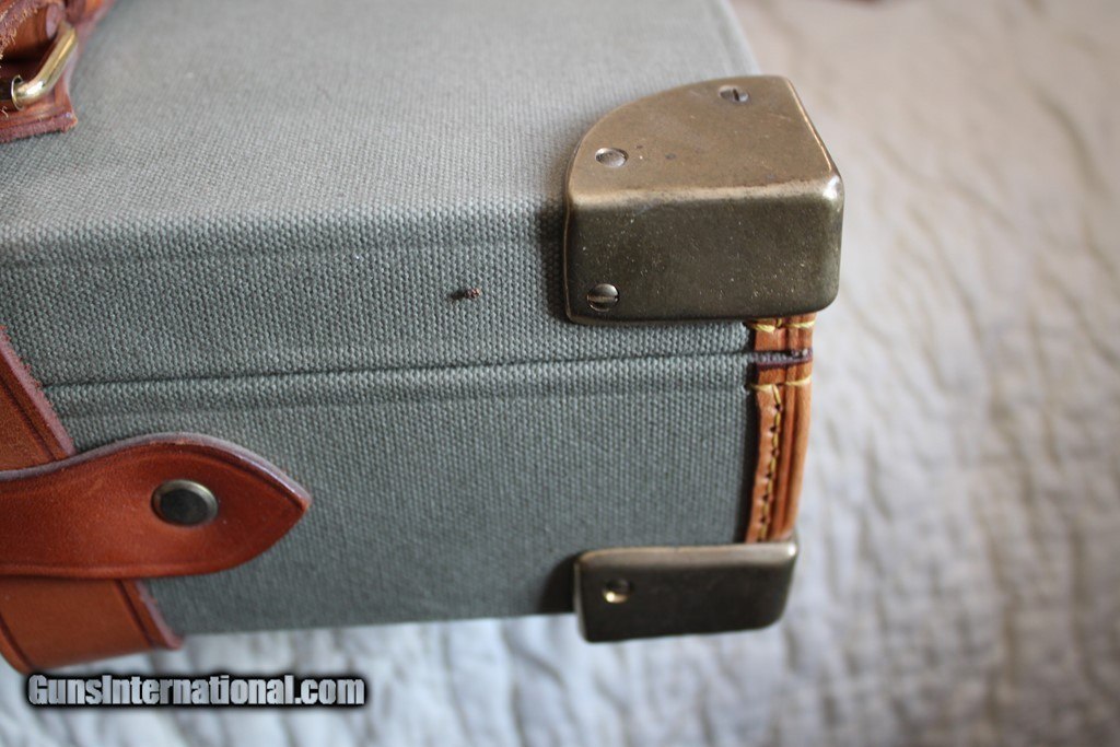 Description: SOLD! Outstanding canvas and leather two barrel case with Beretta label. There is no makers name but I am pretty sure this is Nizzoli. Very high quality case with brass corners. This case is like new inside and out. The barrel slots are blocked for 28" barrels and max length is 30". This is a super nice case. Please see pictures for accurate condition and description. SOLD |