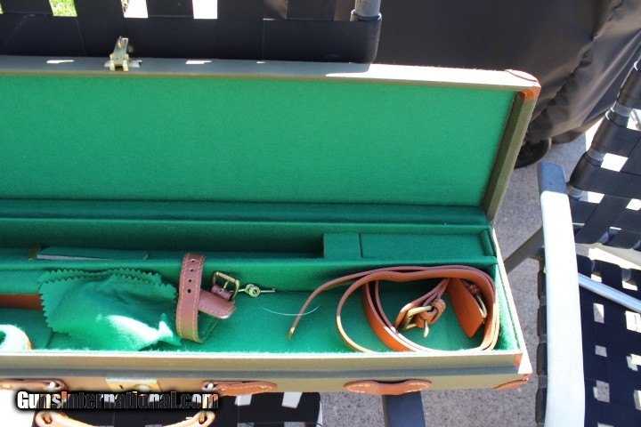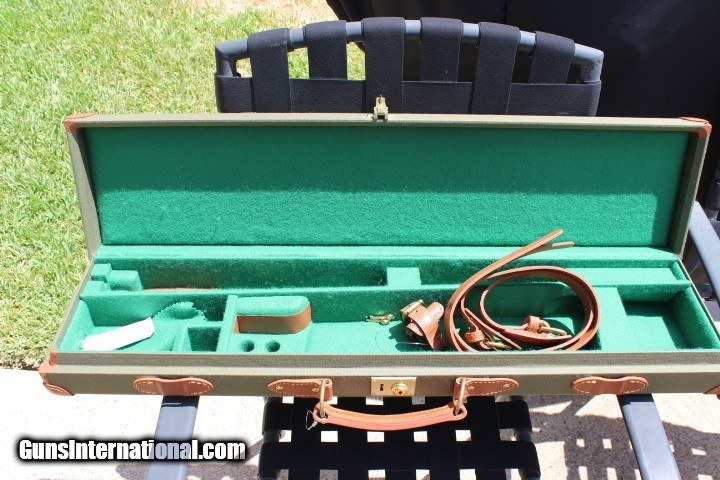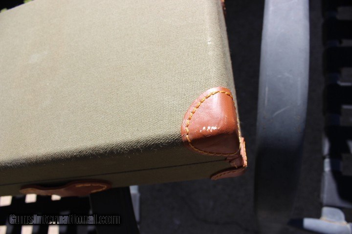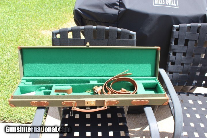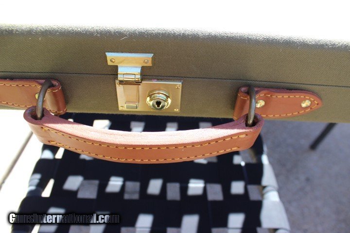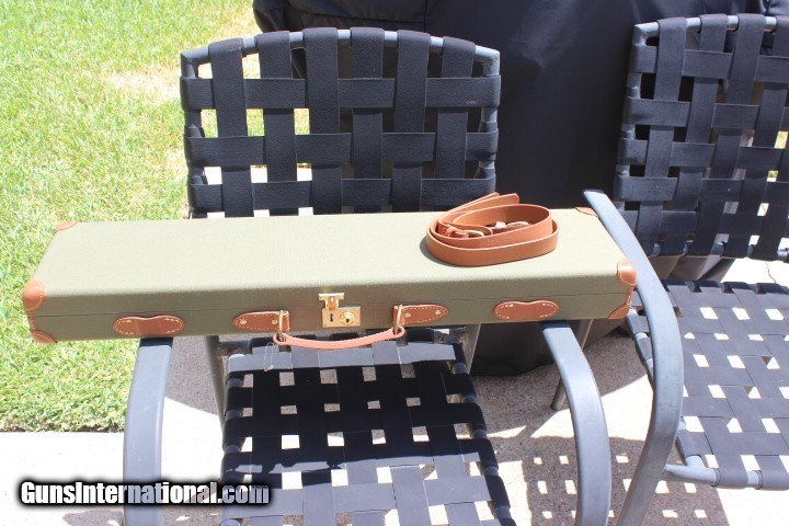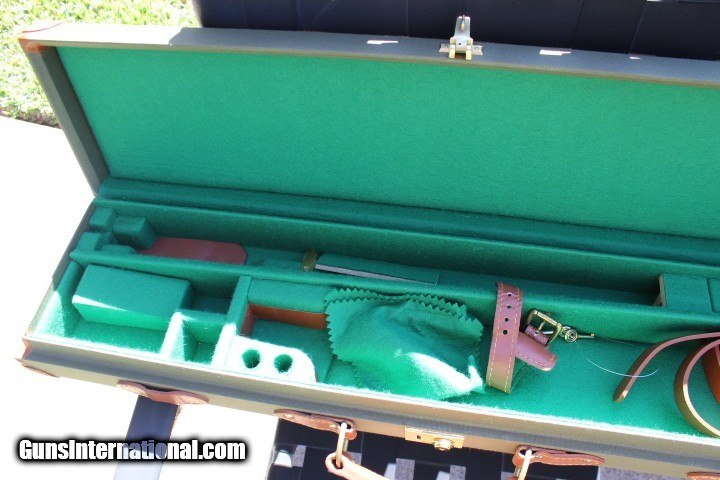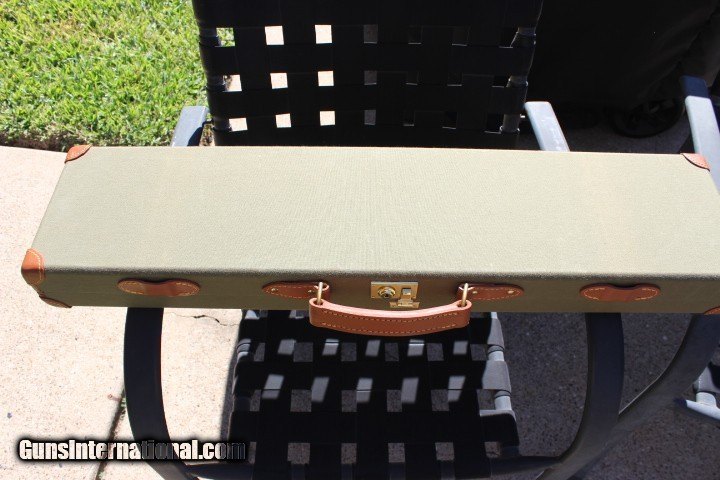 Description: Canvas & Leather Gun case. 20/28 ga. Side by Side for 28" bbls. I have available a nice looking canvas & leather gun case for sale. It has green exterior canvas with brown leather corners. Inside you have elegant green felt lining. You have a separate compartment for an oil bottle and snap caps you also have a larger compartment for what nots?. The case is for a 20 ga but will be fine for a 28 ga. . The case has leather case straps. Has extra fabric for a custom fit and a block to block back the barrels to a shorter length. Has the keys for the brass center lock. This case is new, never had nothing in it. The straps have never been put on the case. It is not marked as to who made it. I have imported cases from Emmebi, Caces, Radar, Exposito and other European makers just to name a few. So who knows where it came from. Now the price. $249 plus shipping. John Boyd Quality Arms, Houston, TX 713-818-2971 SOLD Shotgun Gauge: 20 Gauge |