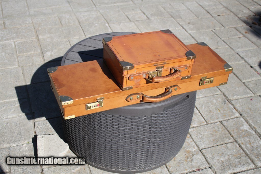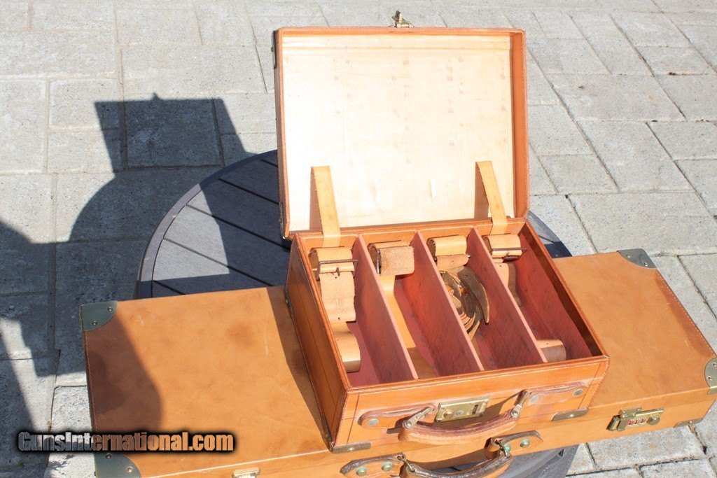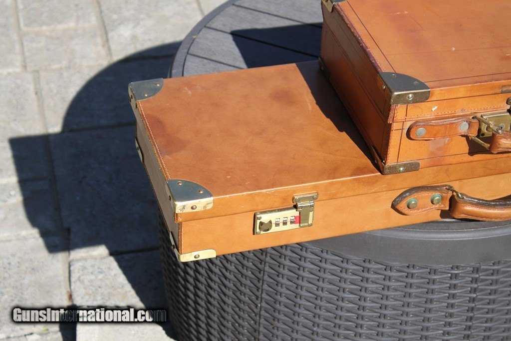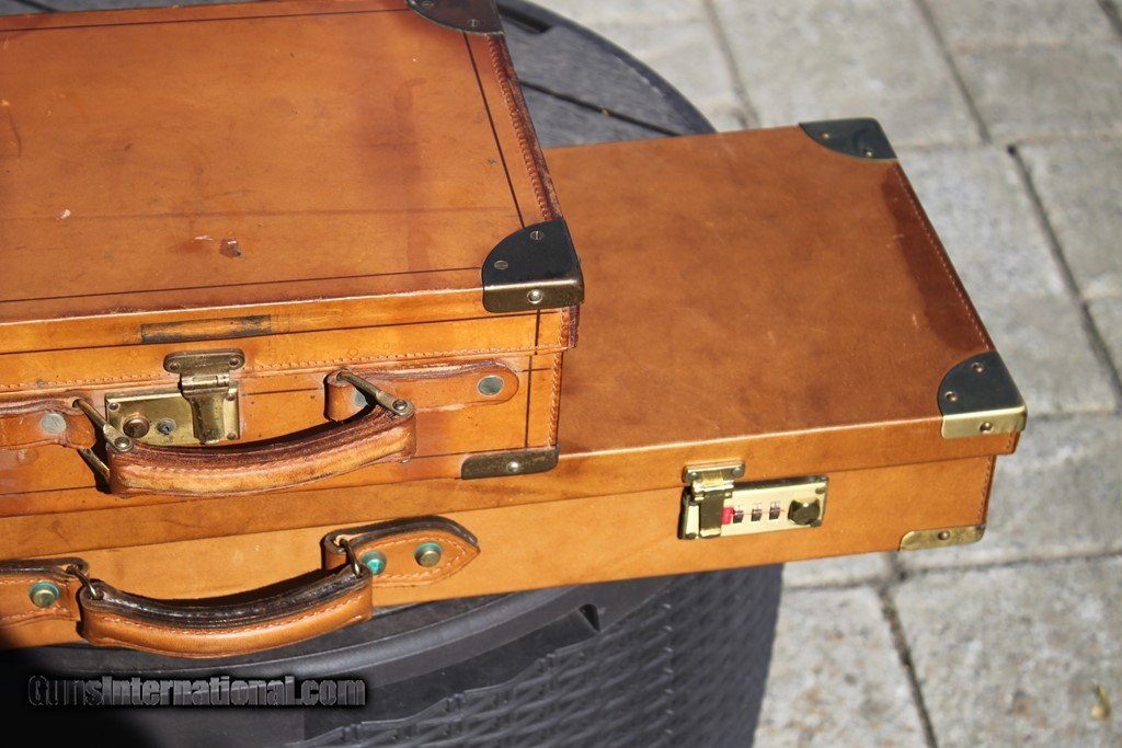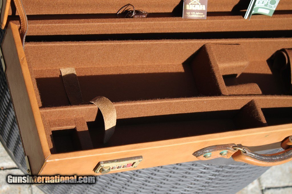 Description: SOLD! AKAH German made trunk case for O/U gun with with 28.5" barrel. The breach end of the barrel slot is 1 3/4" wide. The barrel slot max length with blocks removed would be 29" max barrel length. The inside is in as new condition and the breach block can be moved to custom fit for your action. The exterior shows some marks from storage. The shell case in good used condition. The slots in the shell case are 2 5/8" wide. Both cases are in good condition. SOLD |
