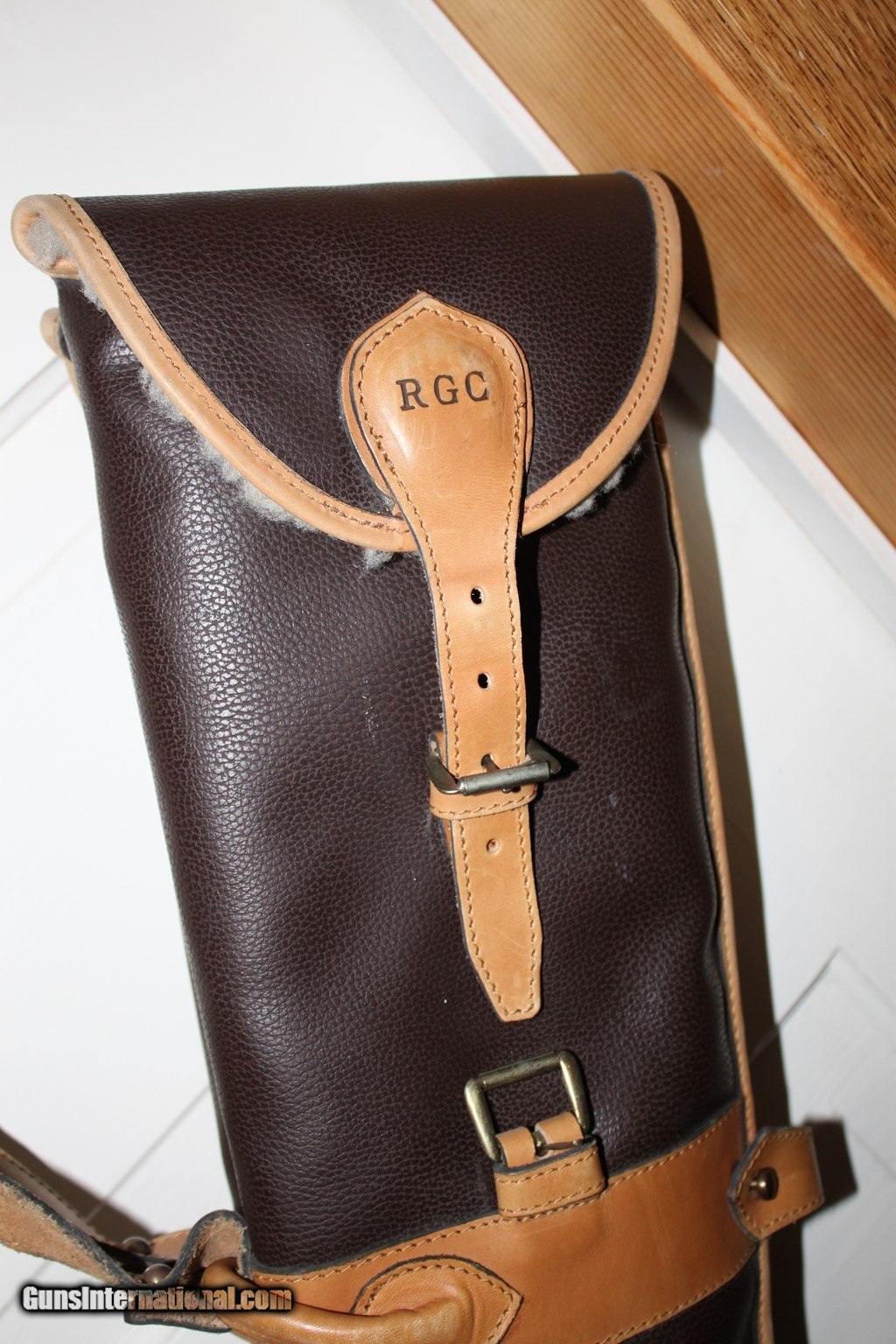 Description: SOLD! Very nice pair of high quality leather full length shotgun cases. All leather and stitching is excellent. Soft pebbled finish on the leather and shearling wool lined. These cases are in slightly used excellent condition inside and out. Use as individual single cases or as a pair with shoulder strap. These cases are 48" long and a 30" gun fills them right to the top. Please see pictures for accurate description and condition. SOLD |