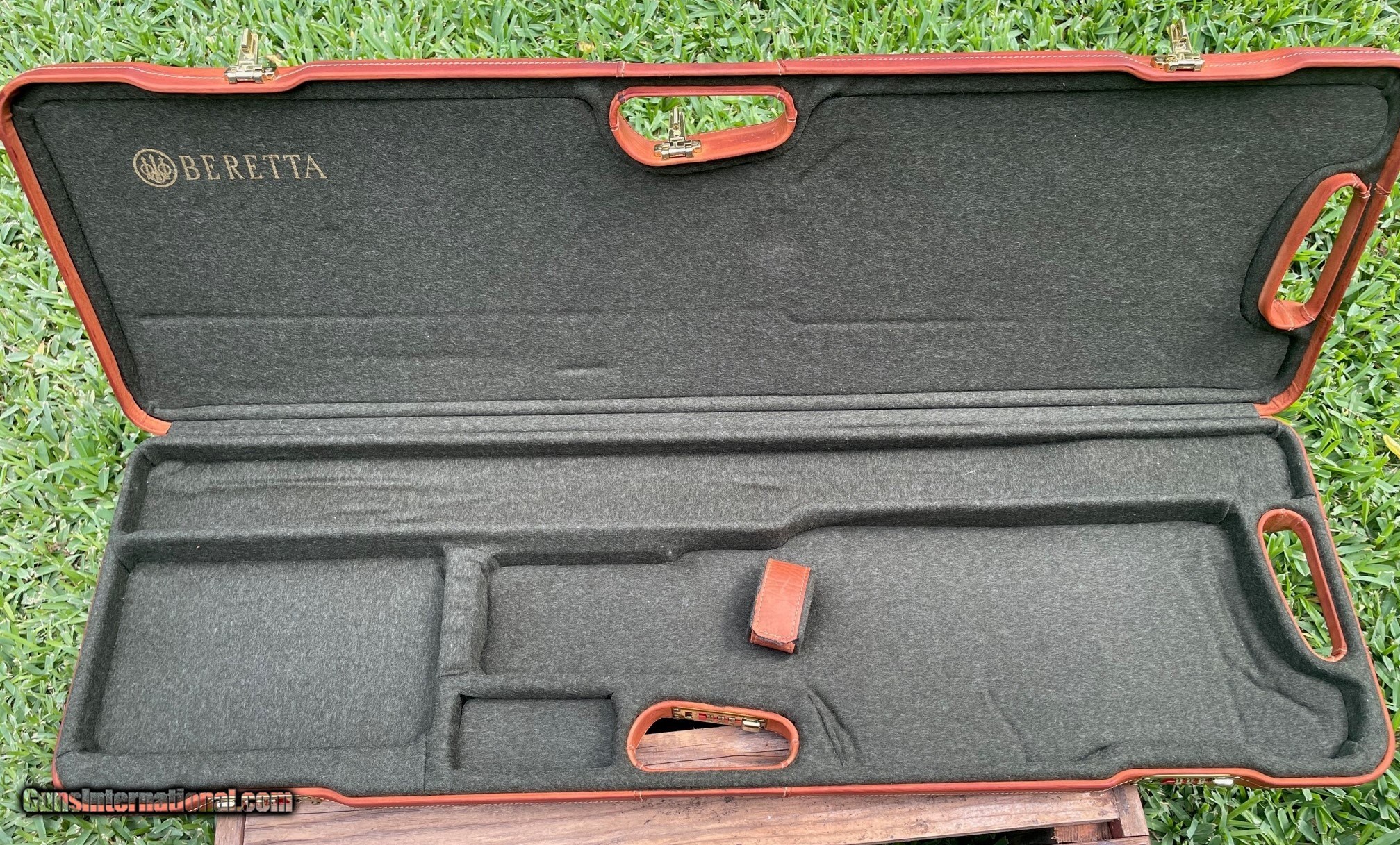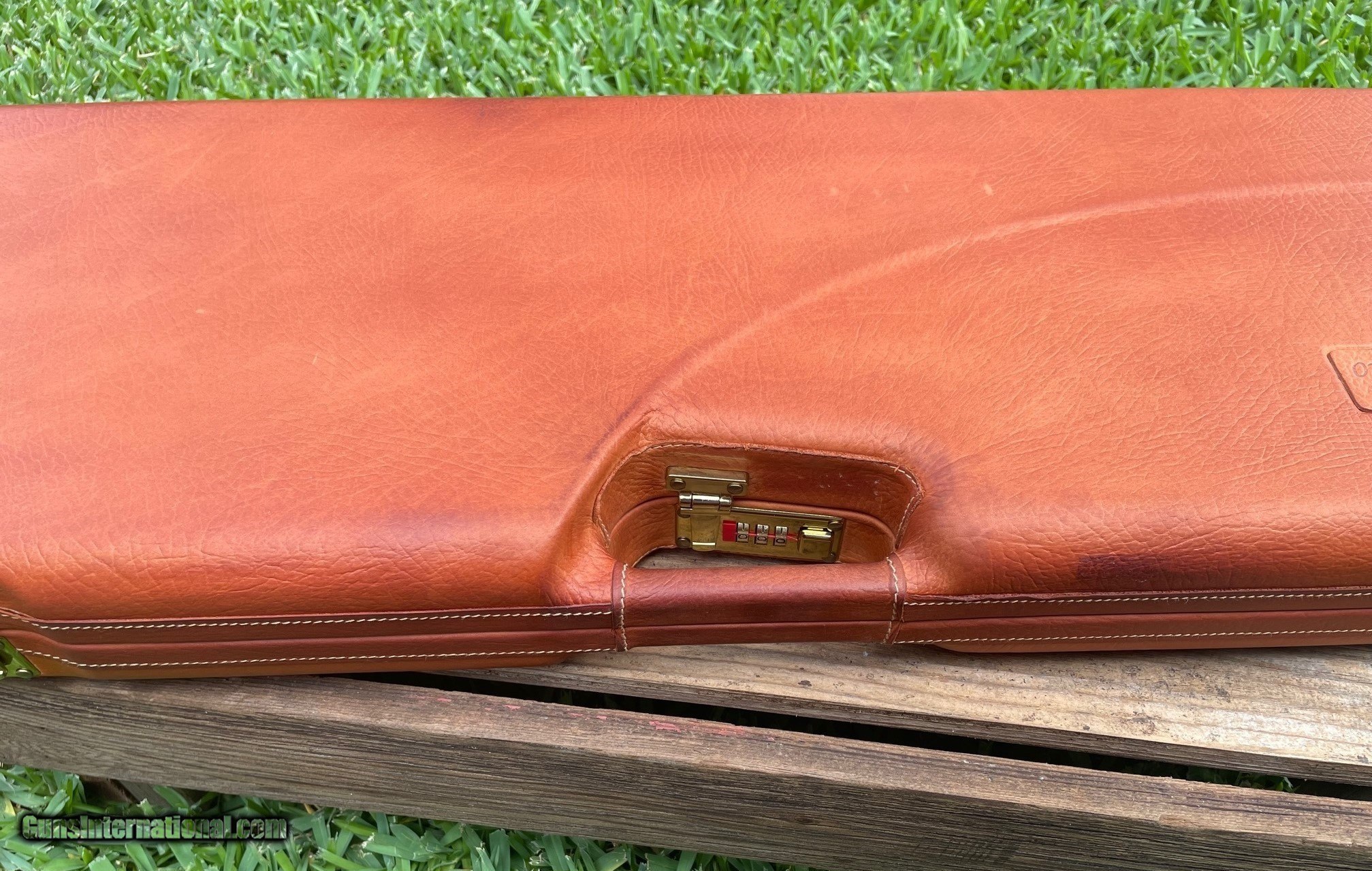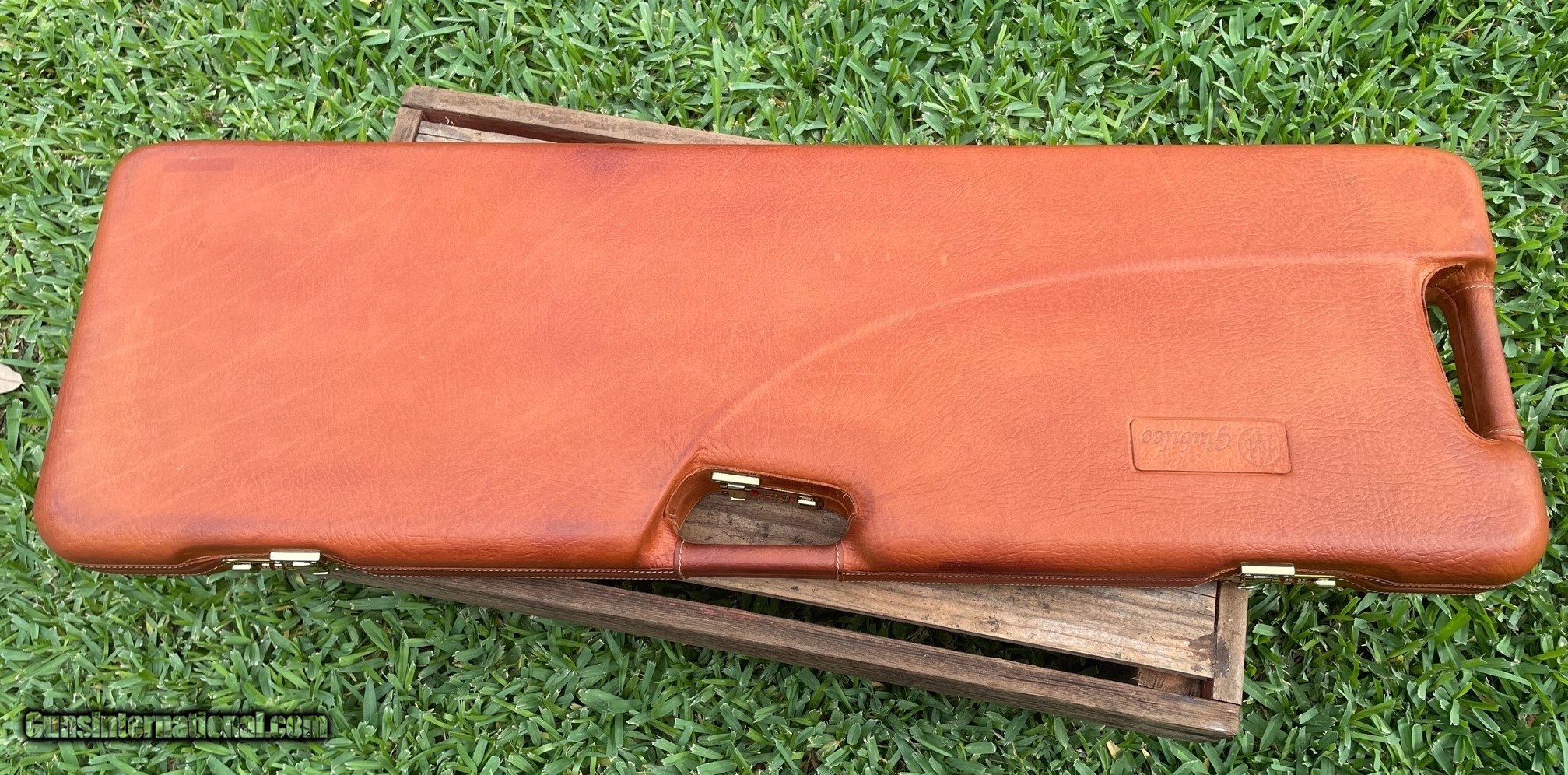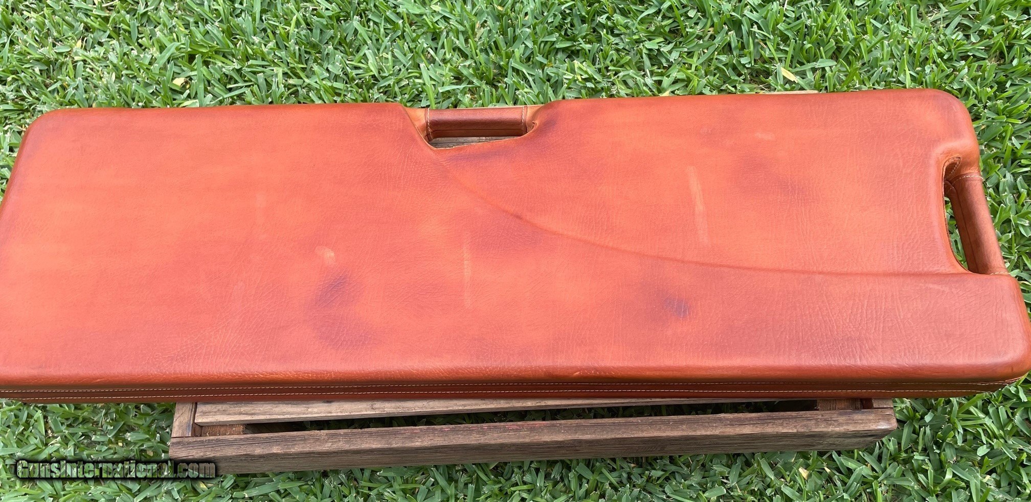 Description: (Sorry, item is sold) This is an excellent condition Negrini (of Italy) pigskin leather gun case. This case came with the Beretta Jubilees from the factory. Fits up to 32" barrels without extended choke tubes, or 31" max with extended tubes. A little staining to the leather on the bottom of the case. Overall in very good to excellent condition. Interior is perfect. Shipping is expensive these days so please add $25 to cover. SOLD |