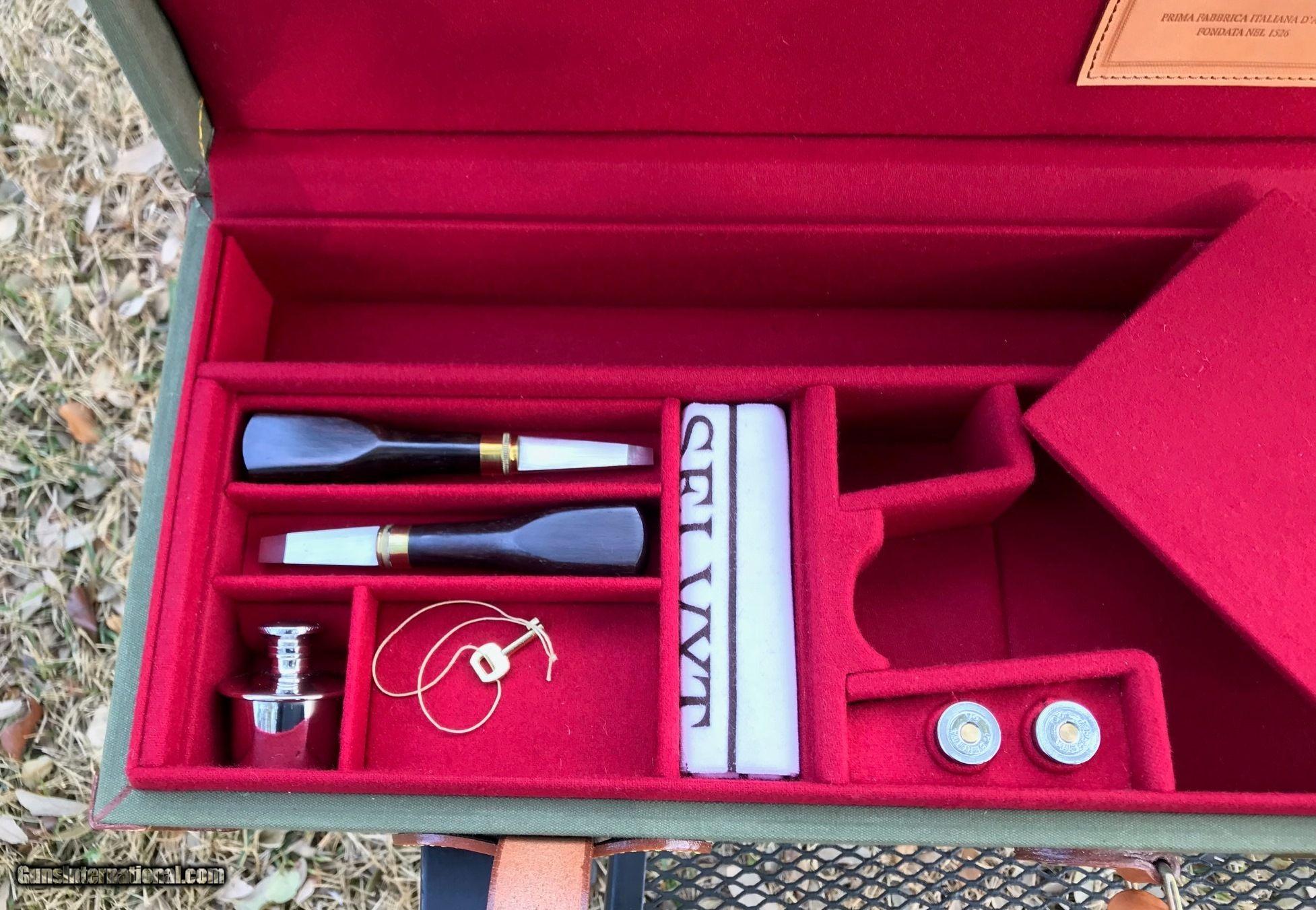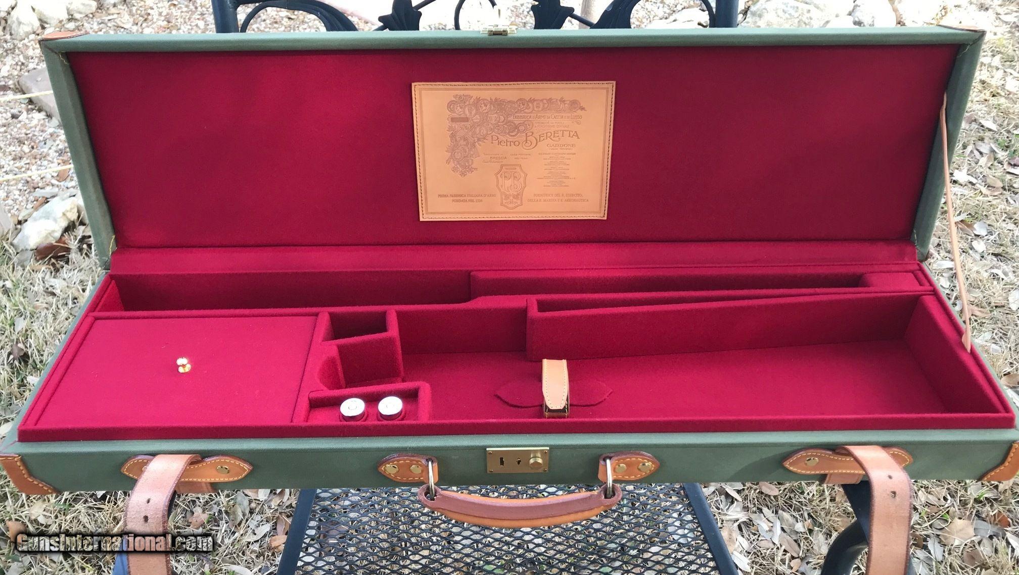 Description: I received this case with a Beretta Jubilee I purchased new. The case is unused and mint in all aspects, except that the straps are a little soiled. There are some shadows in the pics, particularly in the interior, but without a doubt the interior and exterior fabric is flawless and the color is perfectly uniform. This case will hold any O&U shotgun with up to 30" barrels. A 30" barrel with extended chokes will not fit. The exterior dimensions are 32" long, 9" wide, and 3-1/2" tall. One key is included. The other accessories shown in the pics are NOT included, they are only in the pics for reference to show how one might choose to accessorize the case. The snap cap block is for 20-ga snap caps. The case straps are attached to the lid to prevent them from being removed. This case is made by Nizzoli in Italy. Nizzoli cases are seldom seen in the US but new they run over $500 and this one is as new in all aspects. Shipping is $25. SOLD |