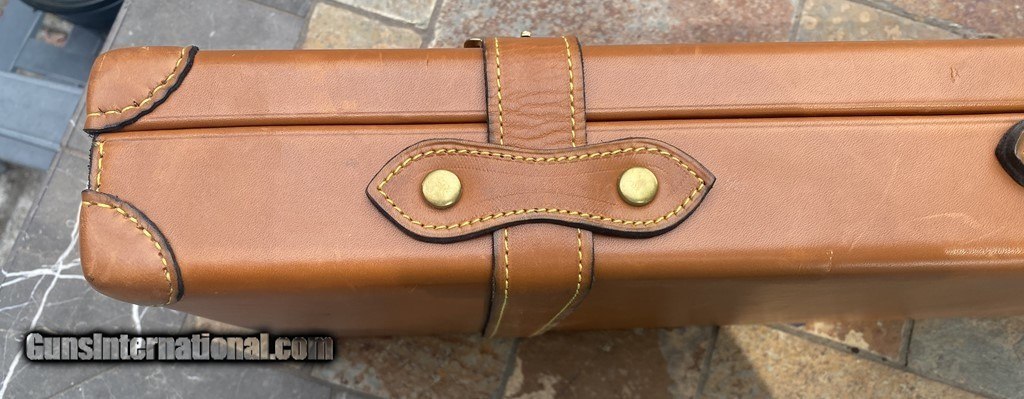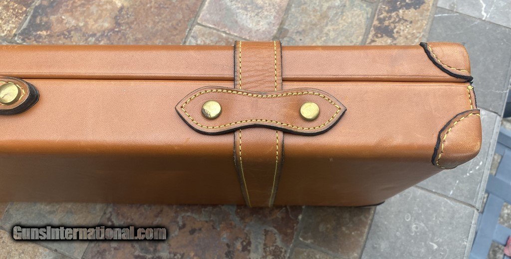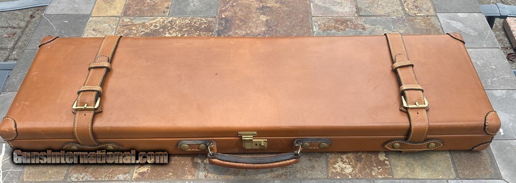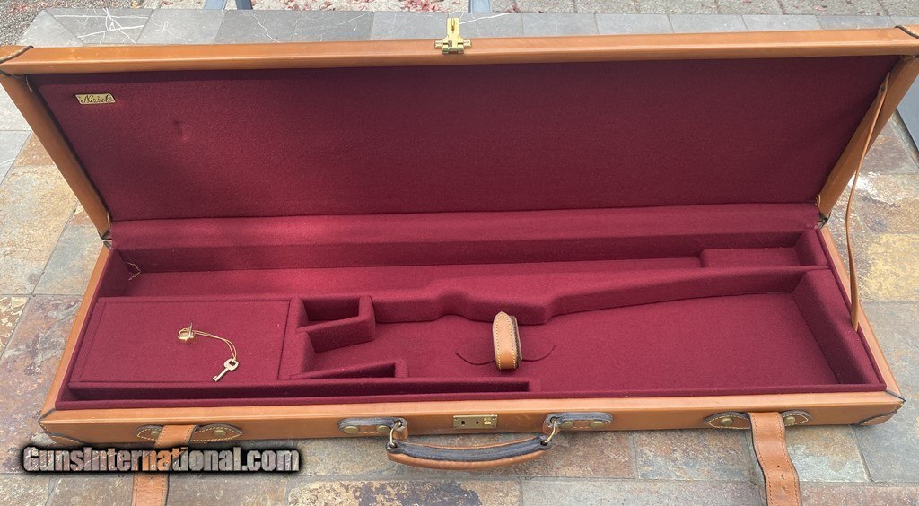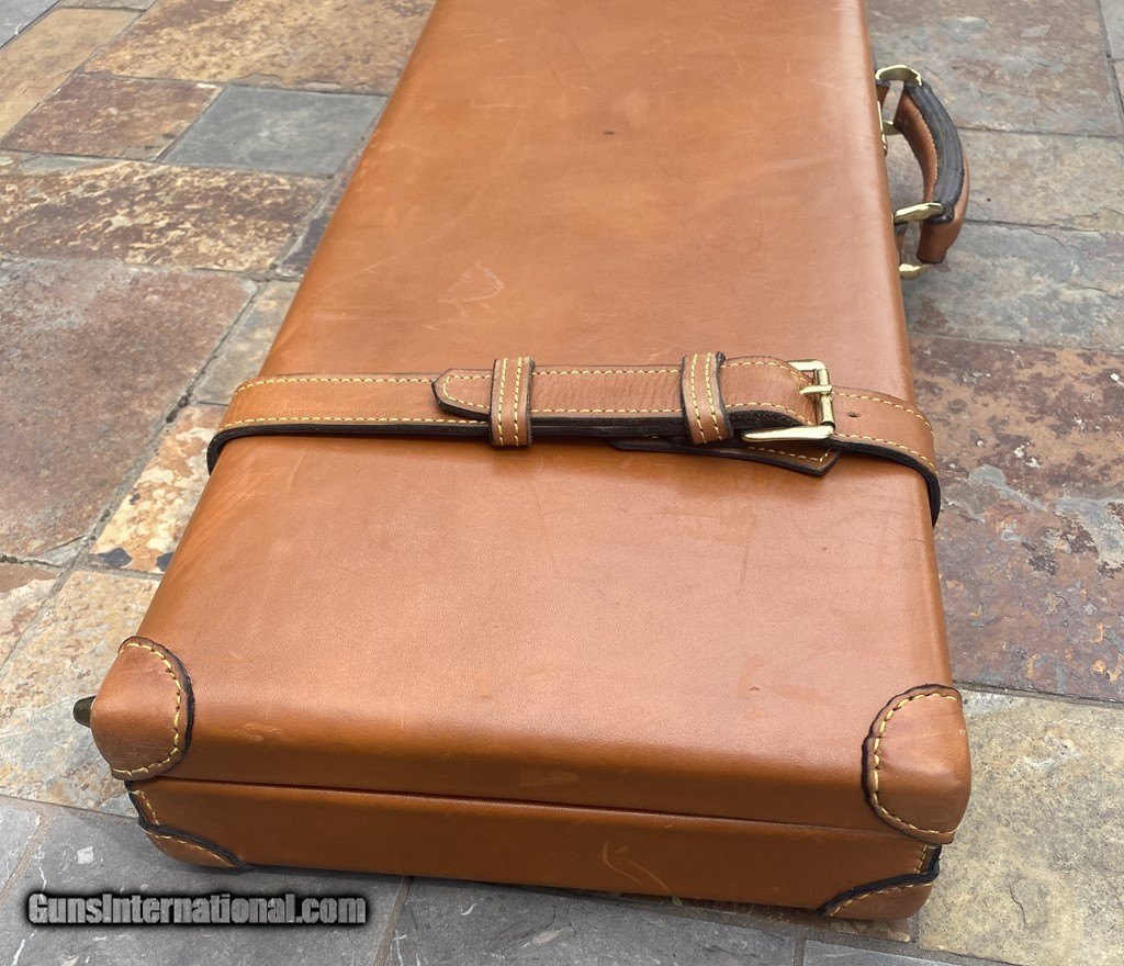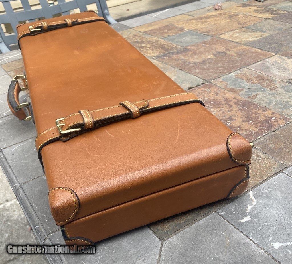 Description: Very nice Italian leather O/U Shotgun Case by Nizzoli. The exterior is in fine shape and does show some marks. All leather and stitching is excellent. The lock and one original key work fine. The inside is AS NEW and has a max barrel length of 30". This case is set up for a O/U gun. Nizzoli made some of the finest leather gun cases in the world and this is a great example in super condition. Please see pictures for accurate description and condition. Insured shipping is $45. SOLD |