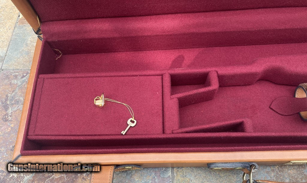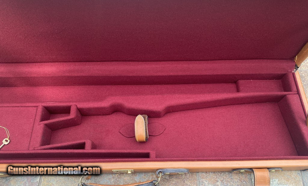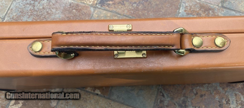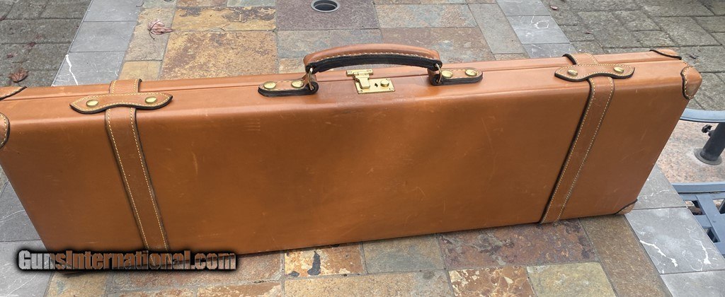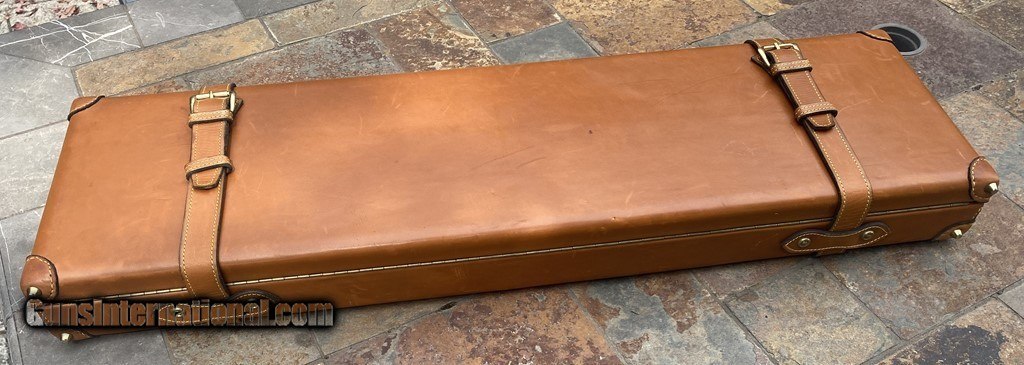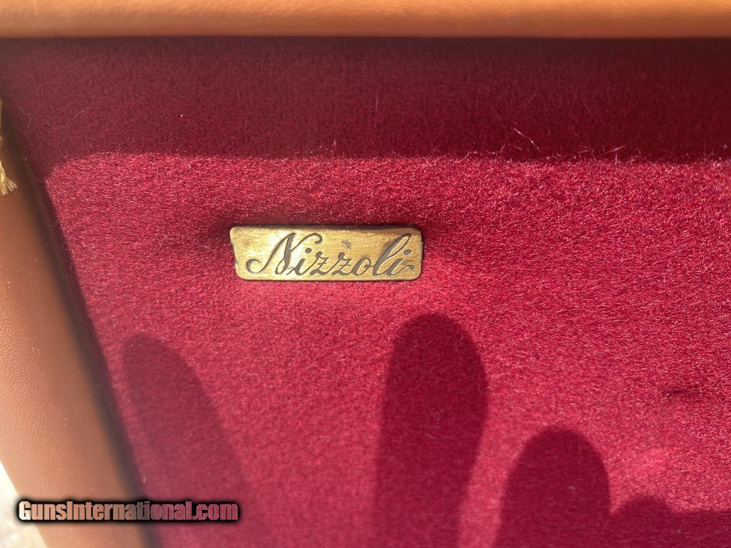 Description: Very nice Italian leather O/U Shotgun Case by Nizzoli. The exterior is in fine shape and does show some marks. All leather and stitching is excellent. The lock and one original key work fine. The inside is AS NEW and has a max barrel length of 30". This case is set up for a O/U gun. Nizzoli made some of the finest leather gun cases in the world and this is a great example in super condition. Please see pictures for accurate description and condition. Insured shipping is $45. SOLD |