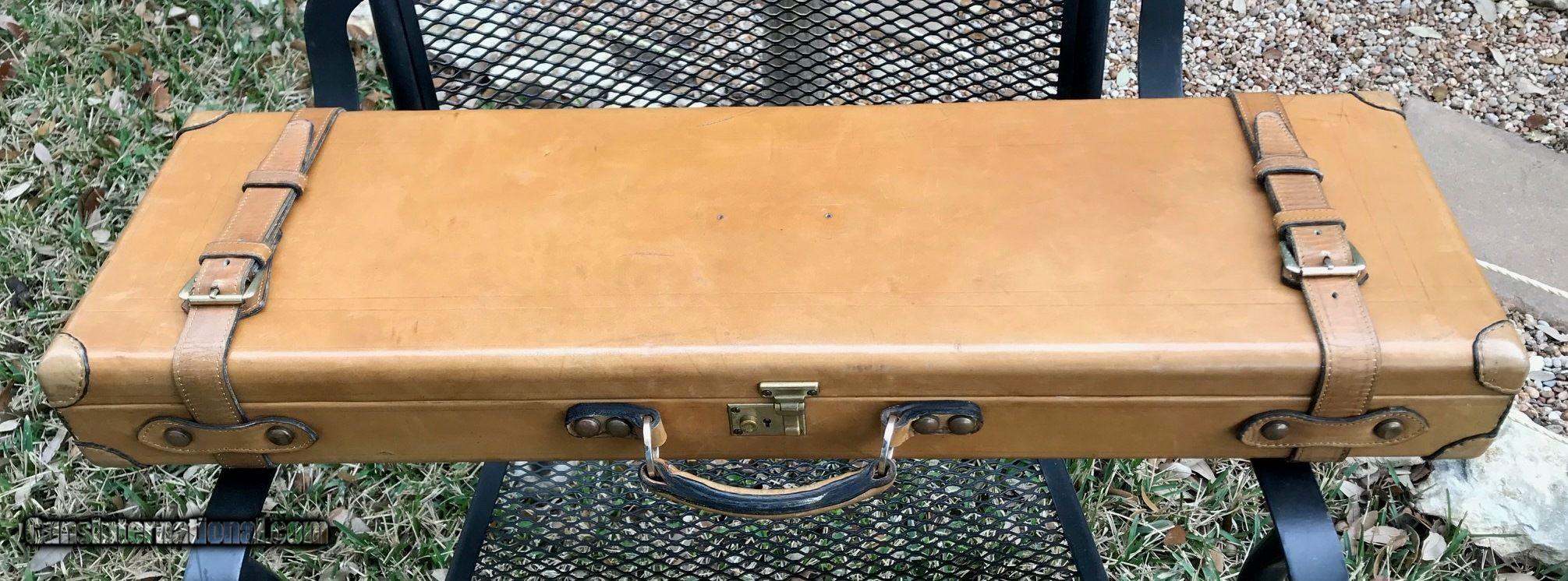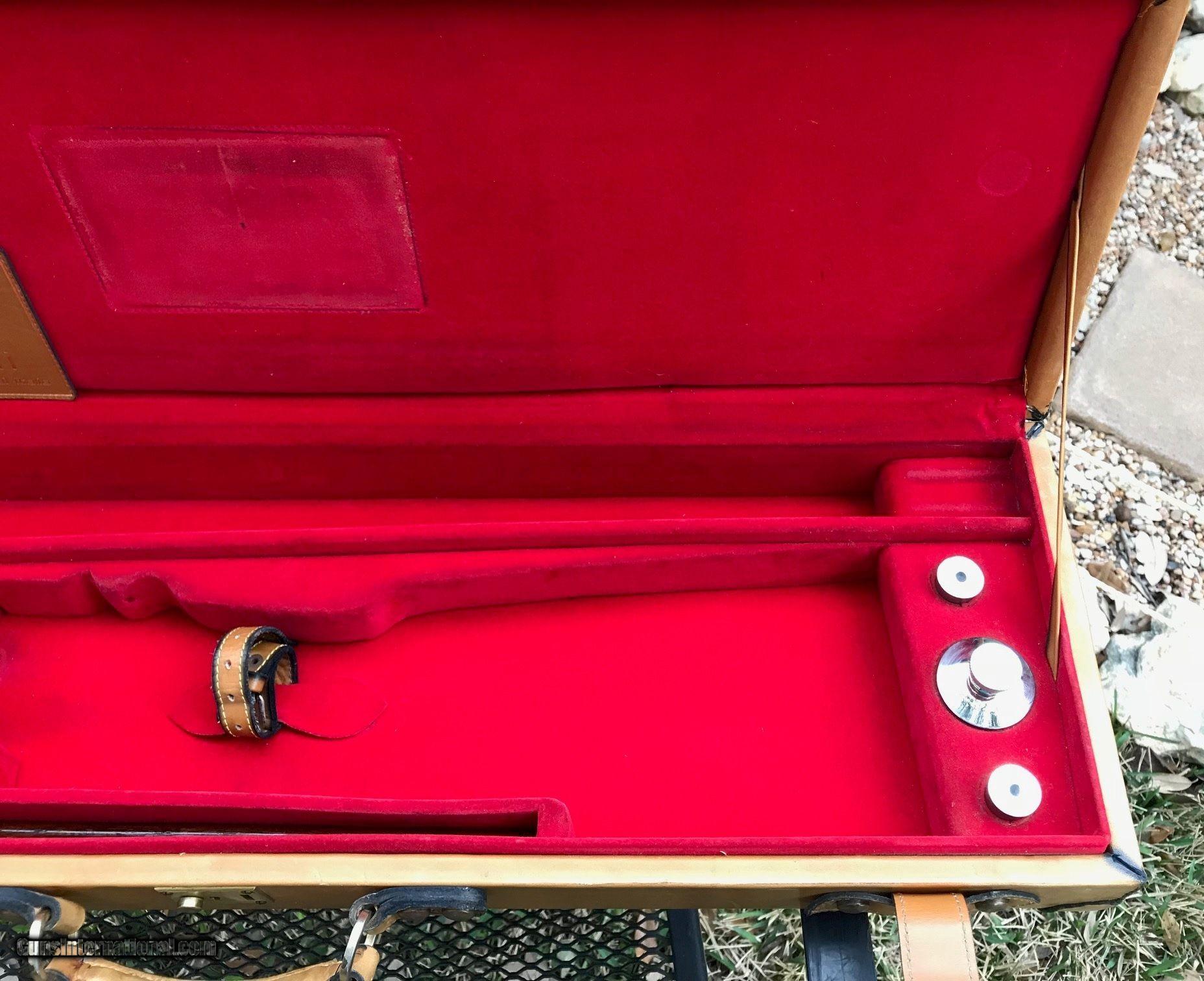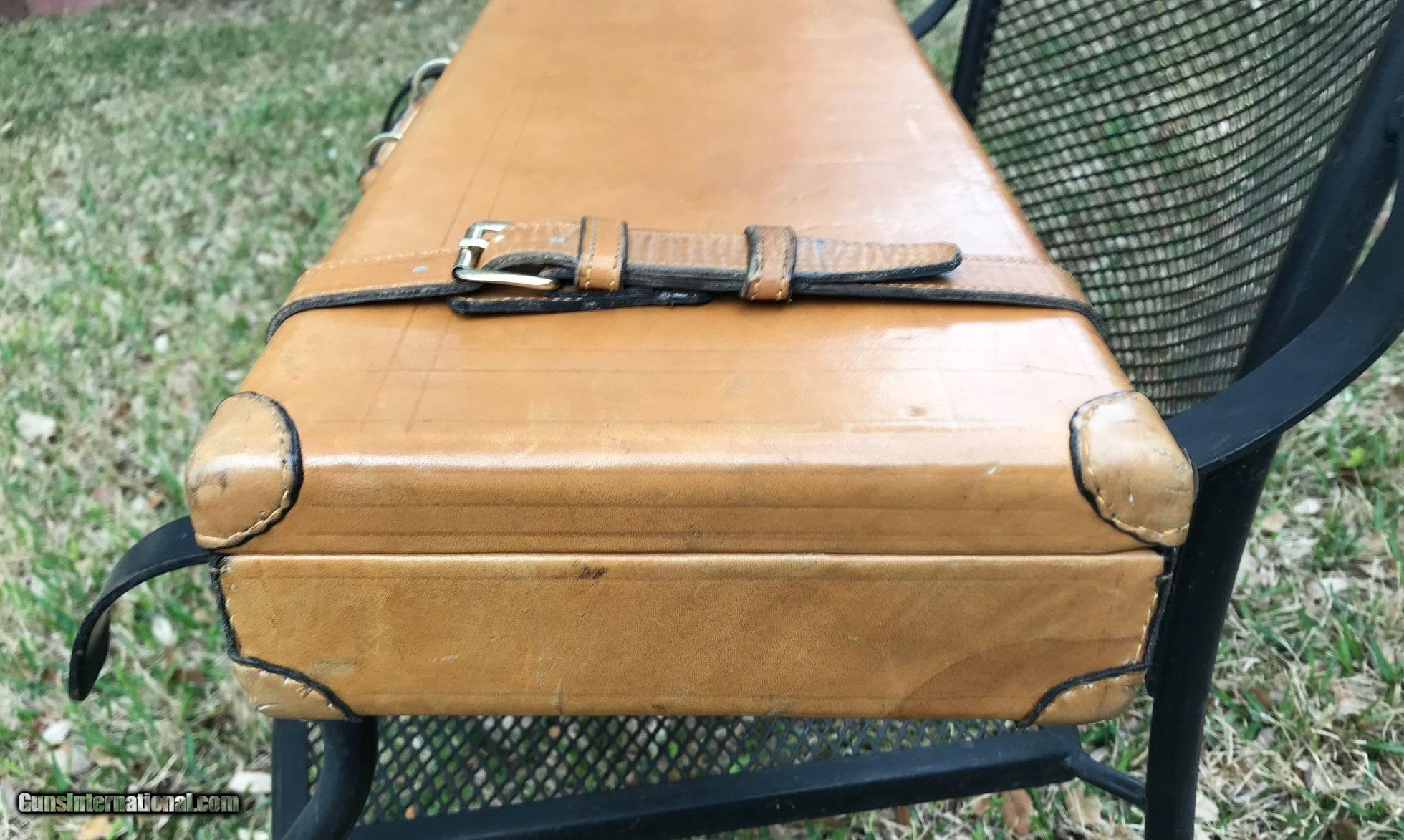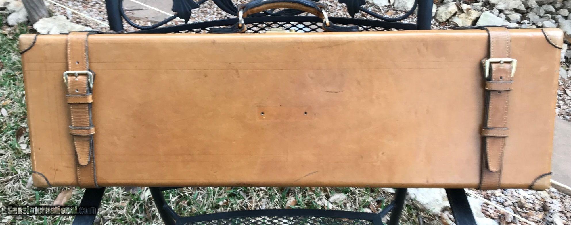 Description: Up for sale is a 1980's Nizzoli full leather case for a SxS shotgun. This case is in sound condition, the front clasp works, the straps are solid, the handle is secure, and the interior wrist strap works. There is no key. The interior is lined in a rich velour fabric. Accessories included are: 12 ga snap caps, round oil bottle, 3 piece rosewood cleaning rod with three 12-ga attachments. The leather label has been removed but can be re-glued or the trade label of your choice attached. The exterior leather contains several nicks, bruises, and scratches however nothing is deep. The stiching is in great condition. The interior is soiled in several places but there are no tears or fabic missing. This case is fit for a 12-ga or smaller SxS with barrels up to 29" in length. Exterior dimensions are 30-1/4" long, 9" wide, 3-1/4" high. Leather Nizzoli cases are only supplied with the finest guns and today run well north of $2000 new. SOLD |